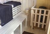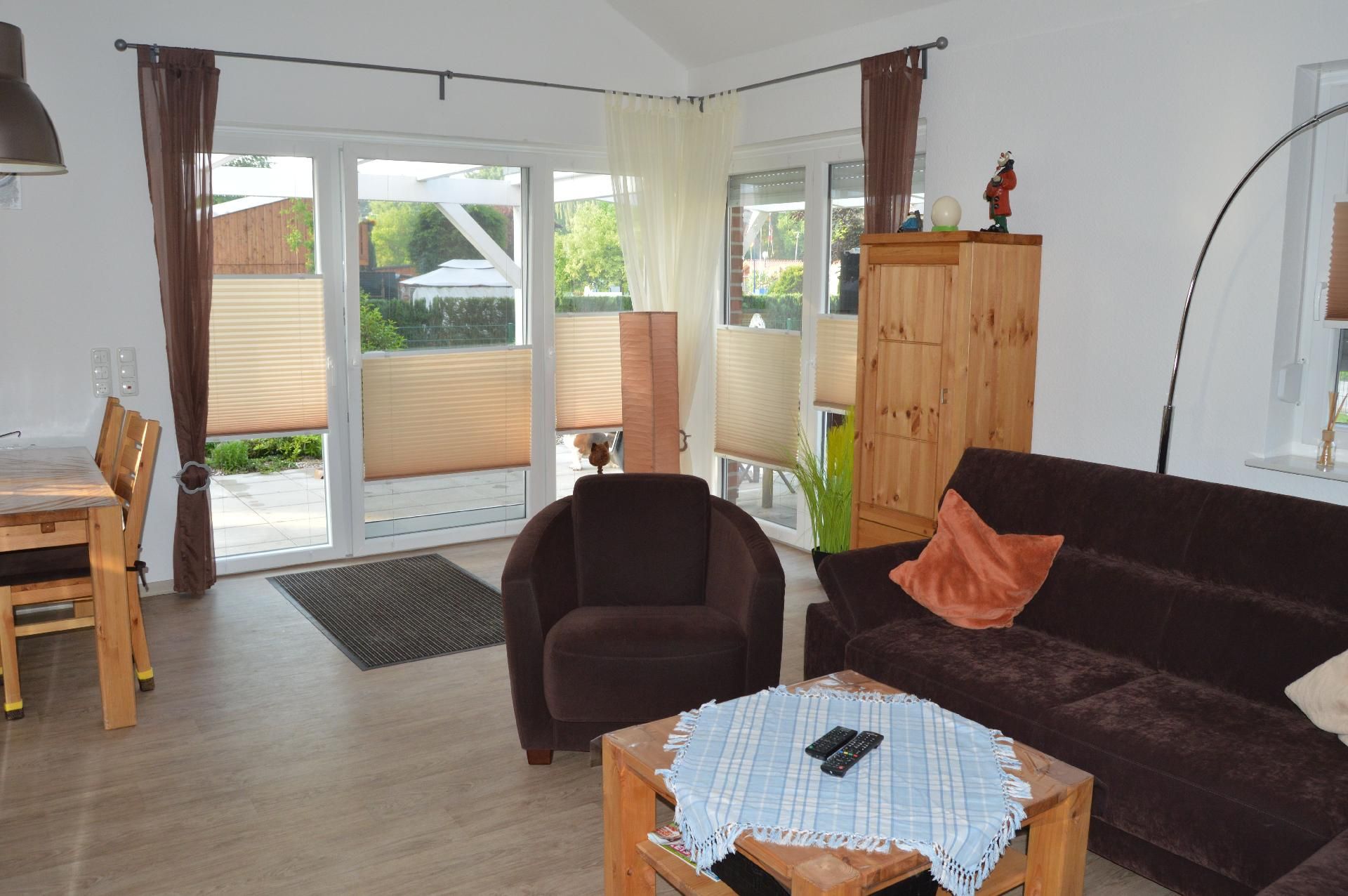 Im Inneren des Hauses erwarten Sie großzügige 100 m² ohne Schwellen, somit behindertenfreundlich. Das Erdgeschoss besteht aus folgenden Zimmern: Ein offenes Wohnzimmer mit Wohnlandschaft, einem Sessel, einem großen Flachbildschirm mit DVD-Player, eine HiFi-Anlage, DVD`s, CD`s sowie ein großer Esstisch mit fünf Stühlen. Nebenan liegt die voll ausgestattete Küche mit Herd, Backofen, Spülmaschine, Mikrowelle, Filter-Kaffeemaschine, Kapsel-Kaffeemaschine (Netto), Wasserkocher, Eierkocher, Toaster, Sandwichmaker, Mixer, Waage, etc. Darüber hinaus gibt es zwei Schlafzimmer, von denen eines mit einem Doppelbett (bestehend aus zwei Matratzen à 0,90 m x 2,00 m) und das zweite, das Kinderzimmer, mit einem Einzelbett (1,00 m x 2,00 m) eingerichtet ist (wenn nötig auch ein Babybett). Von diesem Zimmer aus erreichen Sie über eine Leiter die Galerie, auf der sich ein weiteres Doppelbett (1,60 m x 2,00 m) befindet. Das helle Tageslichtbad verfügt über eine ebenerdige Dusche, Waschbecken, Waschmaschine und WC.
