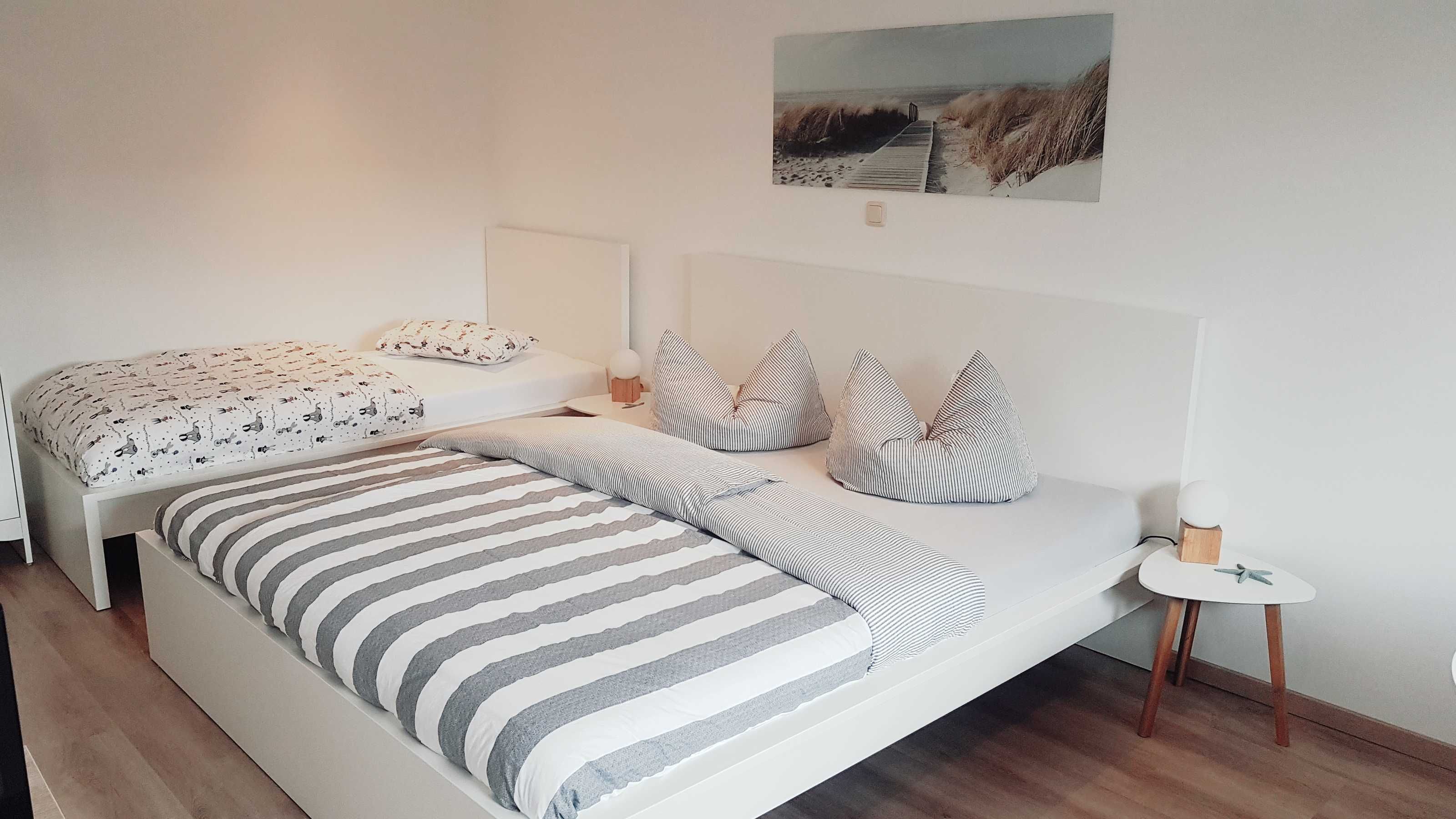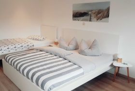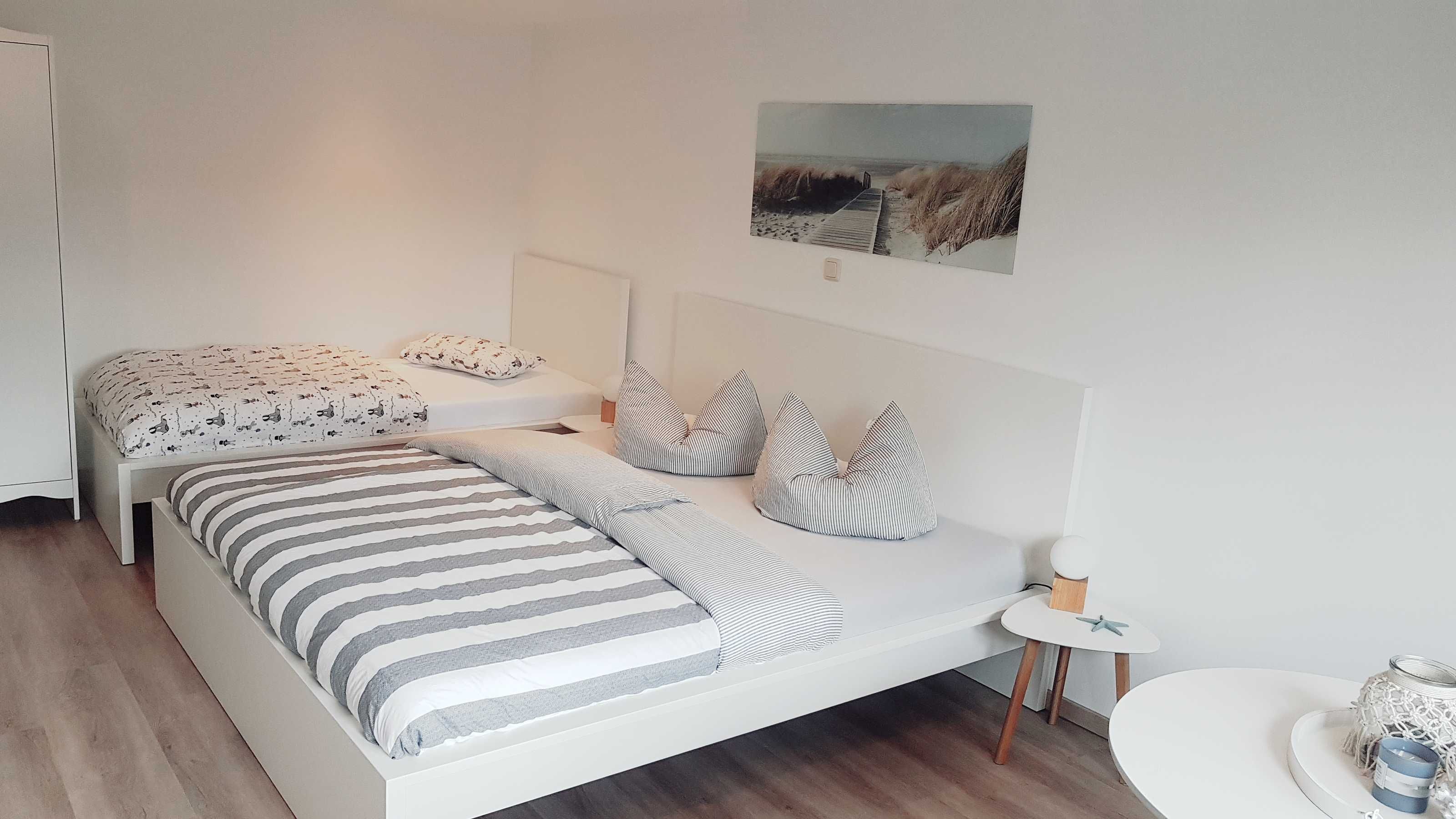 Dieses komfortable 3-Bettzimmer in der oberen Etage bietet Ihnen alles, was Sie für einen erholsamen Aufenthalt benötigen. Das Zimmer ist ausgestattet mit einem Doppelbett, einem Einzelbett, einem geräumigen Kleiderschrank, einem Fernseher sowie einem Tisch mit drei bequemen Sesseln.
