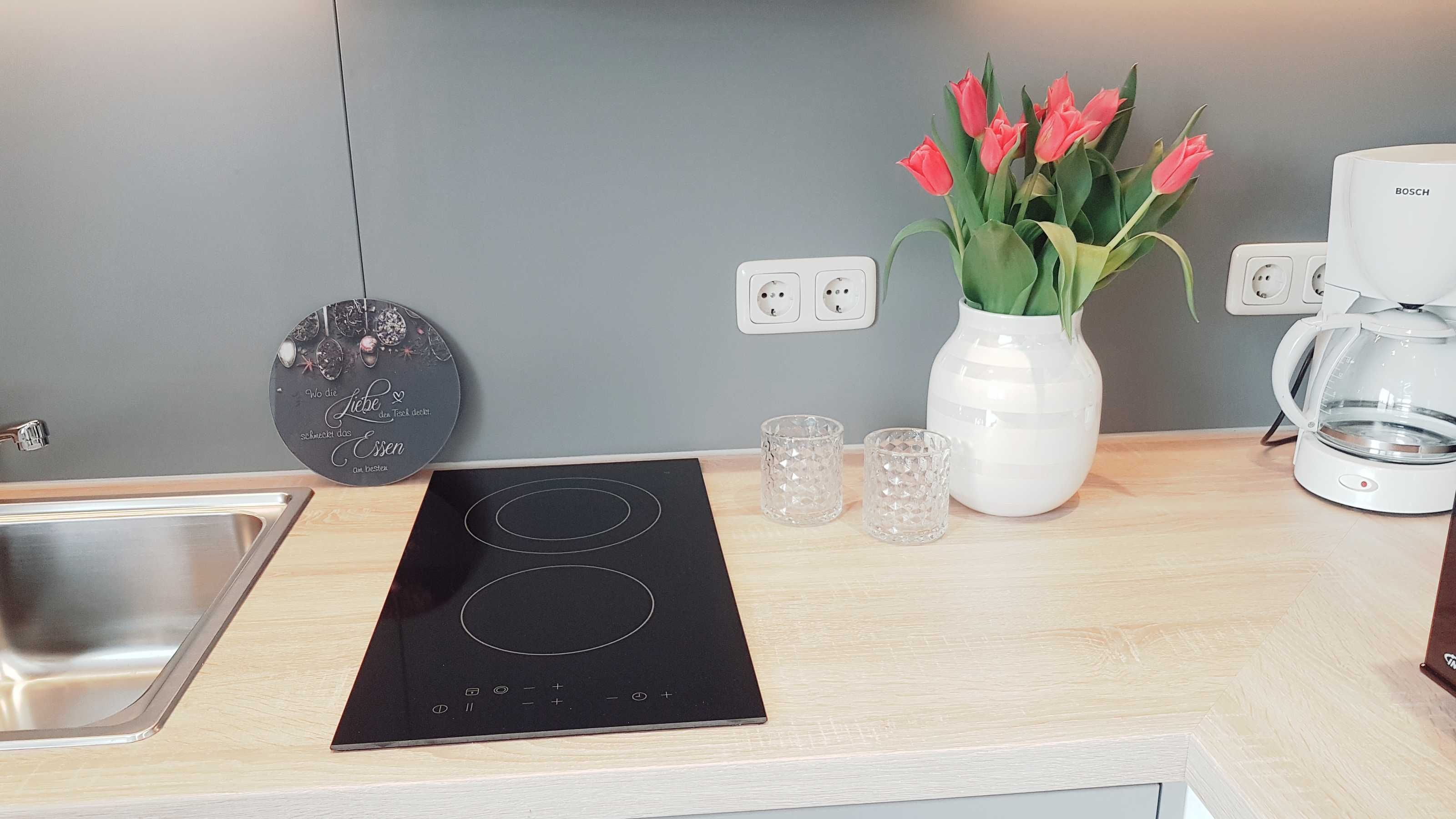 In der kleinen Küchenzeile finden Sie eine Mikrowelle, einen Toaster, eine Kaffeemaschine und einen Wasserkocher, um einfache Mahlzeiten zuzubereiten. Das Bad mit WC befindet sich im Erdgeschoss der Ferienwohnung.