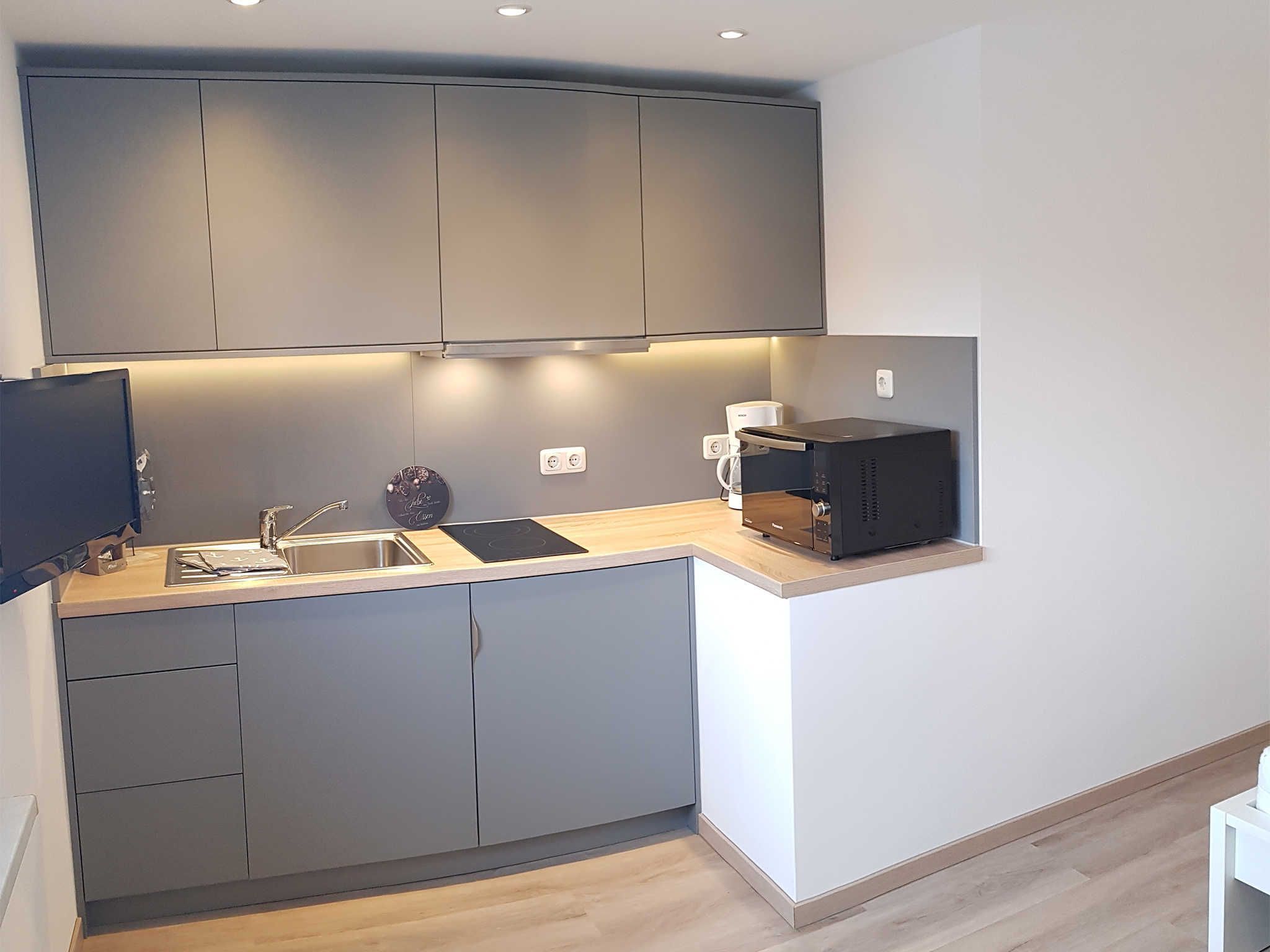 In der kleinen Küchenzeile finden Sie eine Mikrowelle, einen Toaster, eine Kaffeemaschine und einen Wasserkocher, um einfache Mahlzeiten zuzubereiten.