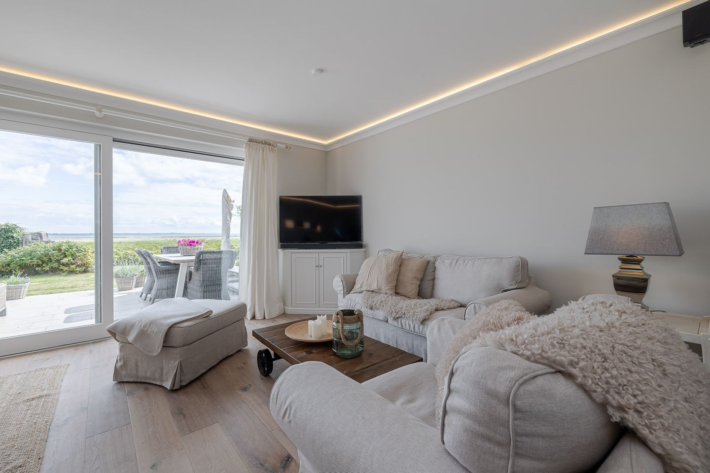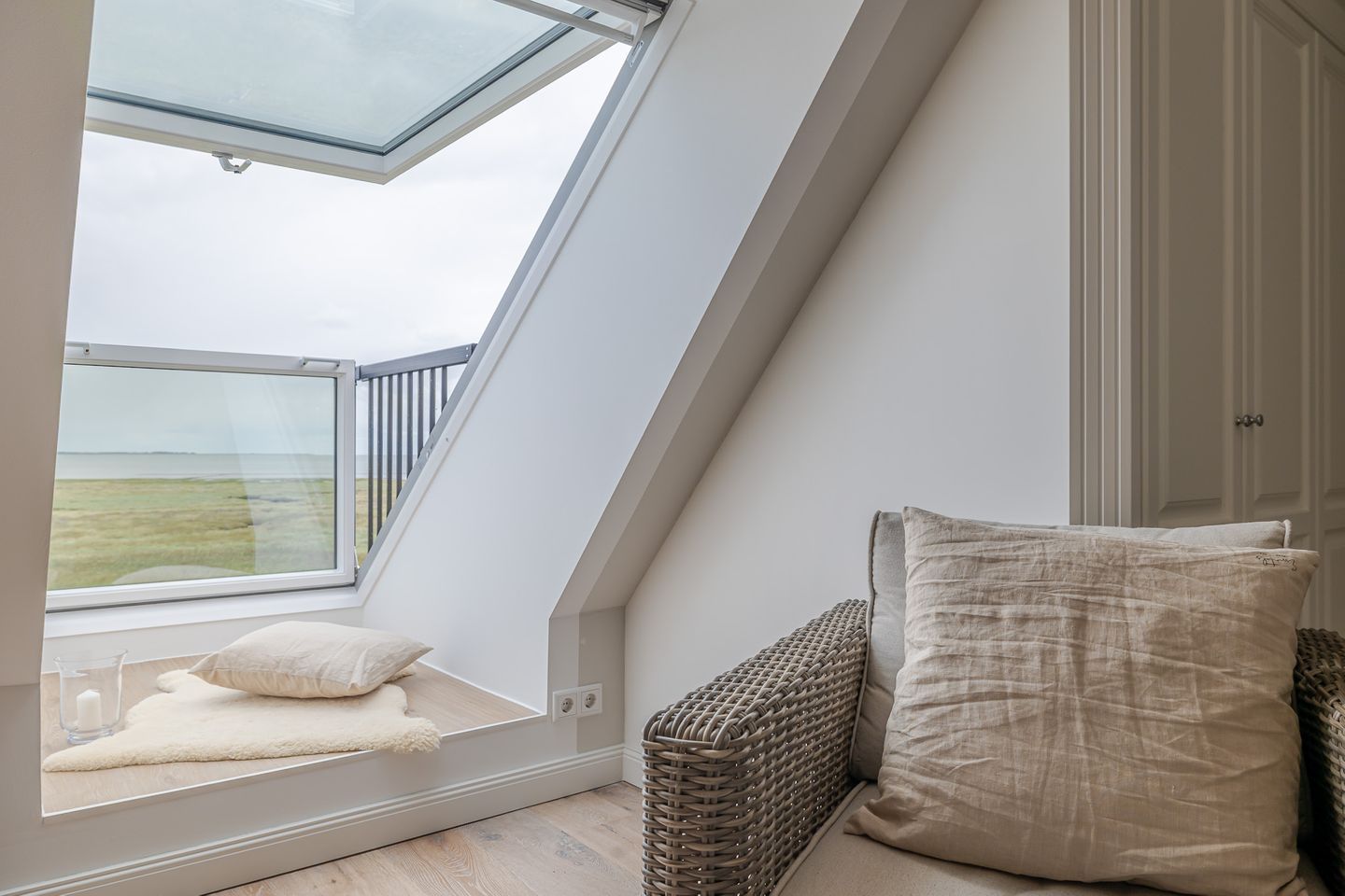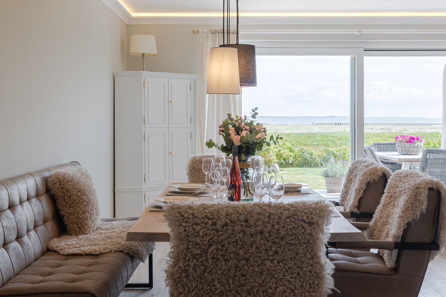 Im Außenbereich lädt der gepflegte Garten mit Gartenmöbeln, Sonnenschirm und eigenem Strandkorb zum Verweilen ein. Die großzügige Terrasse bietet Ihnen einen unvergleichlichen 180°- Blick auf das Wattenmeer, sodass Sie die maritime Atmosphäre Sylts direkt von Ihrem Feriendomizil aus genießen können. Auch vor dem Haus wartet eine angenehme Sitzgelegenheit auf Sie.