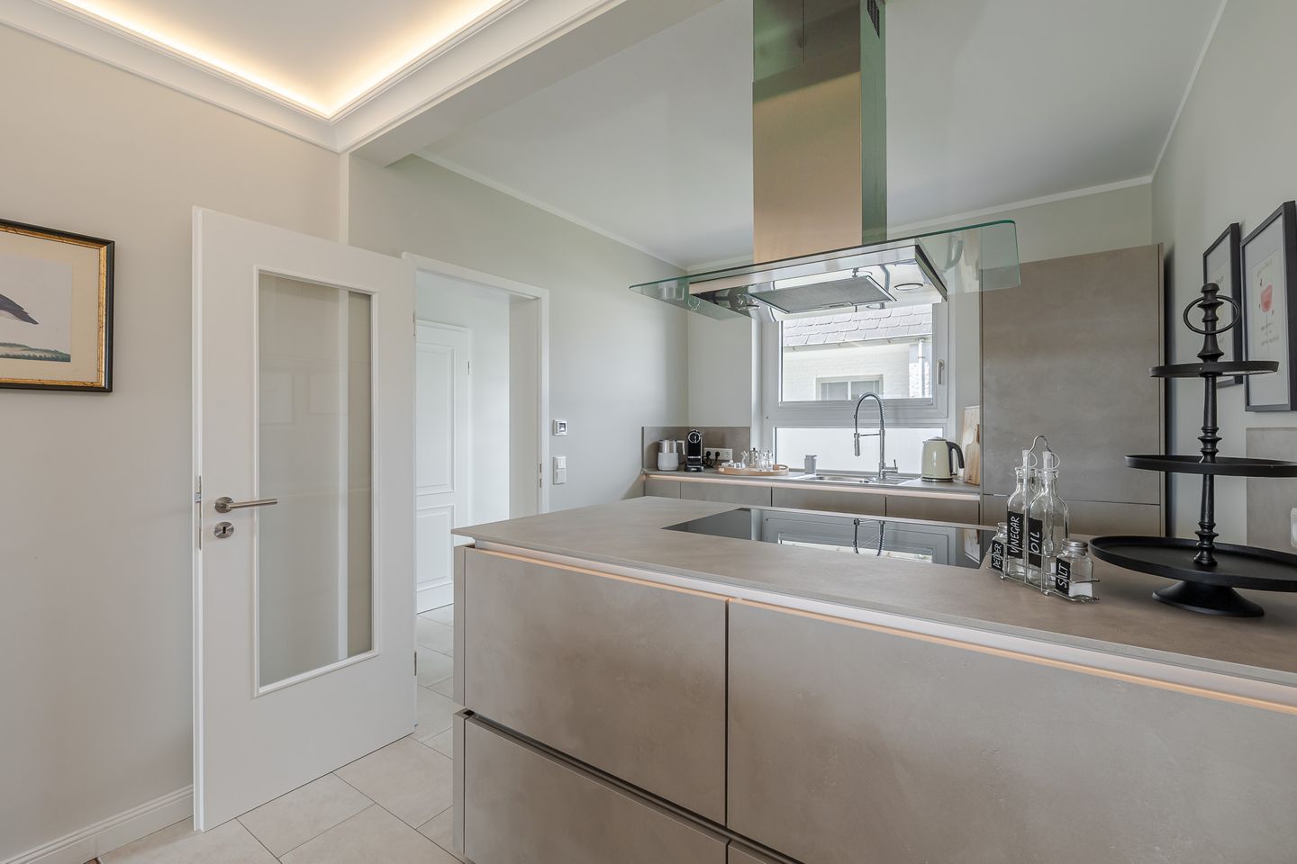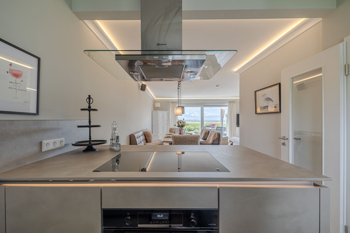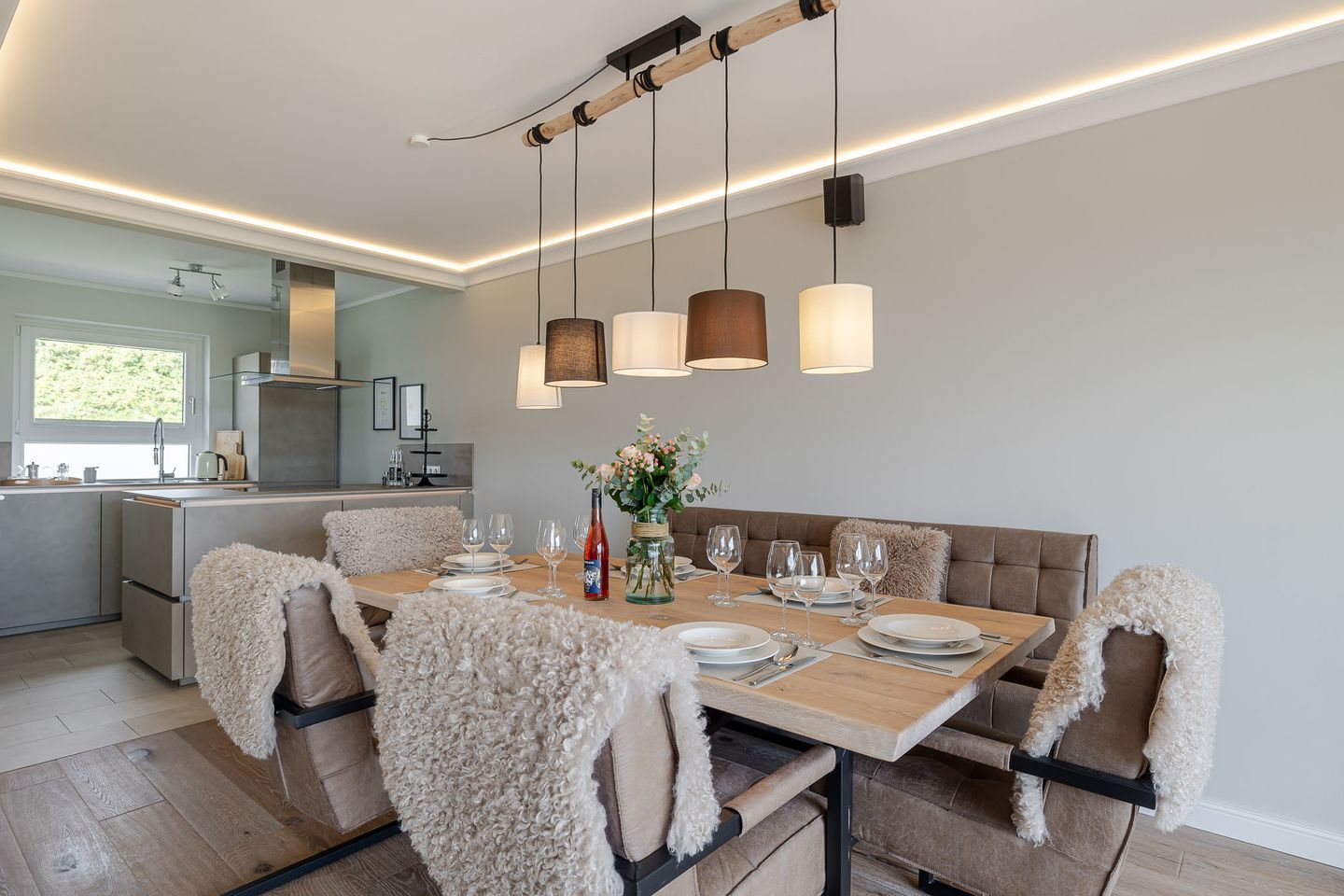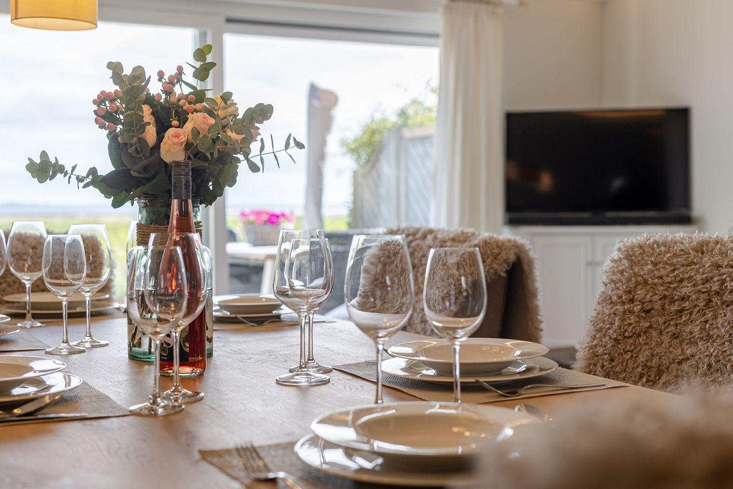 Der Wohn- und Essbereich ist offen gestaltet und verbindet Wohnkomfort mit zeitgemäßer Eleganz. Die offene Küche ist mit sämtlichen Annehmlichkeiten ausgestattet, die für einen unabhängigen Aufenthalt notwendig sind: Neben einer Nespressomaschine, einer klassischen Kaffeemaschine und einem Wasserkocher stehen Ihnen ein Kühlschrank mit Gefrierfach, Spülmaschine, Backofen und ein moderner Induktionsherd zur Verfügung. Auch Toaster, Mixer sowie ausreichend Geschirr, Besteck und Küchenutensilien sind vorhanden. Der Essbereich bietet ausreichend Platz für gemeinsame Mahlzeiten und gesellige Abende.