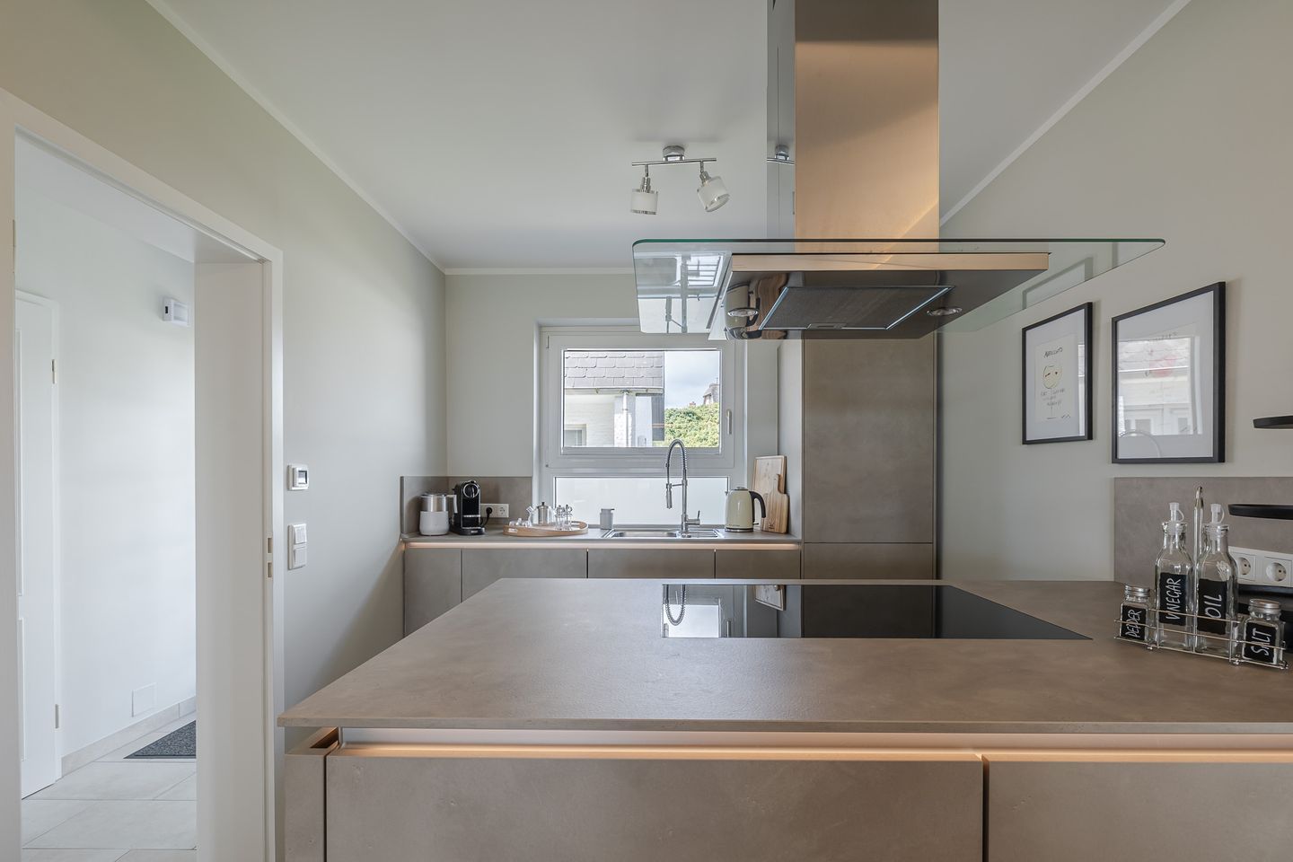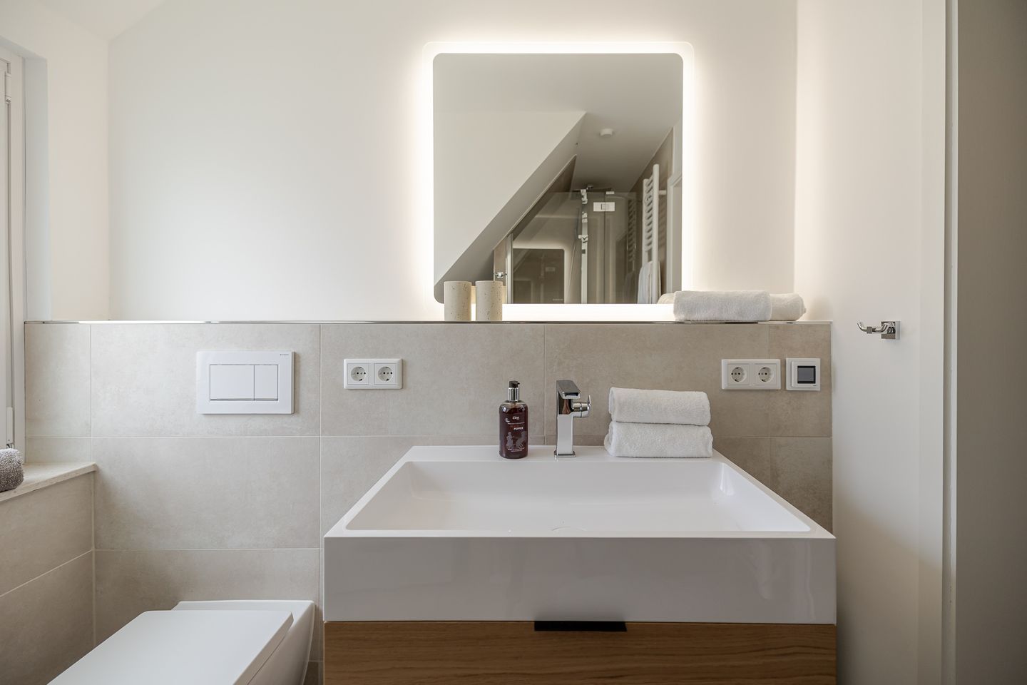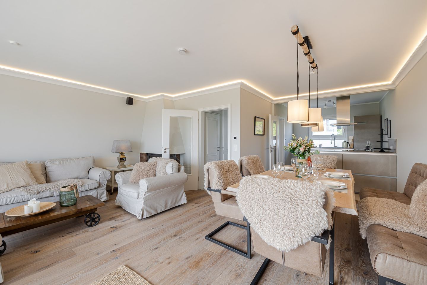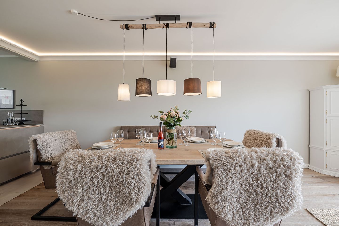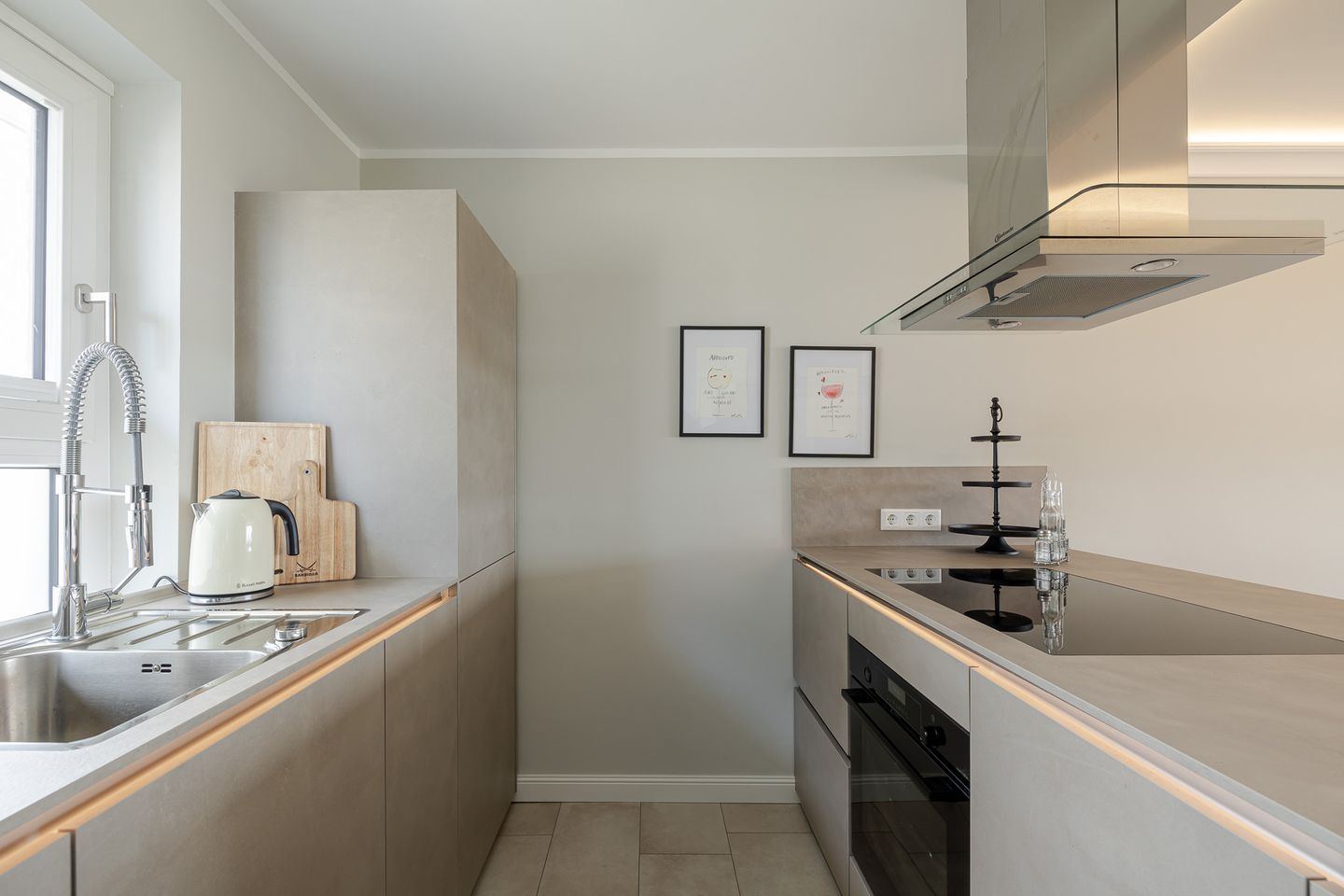 Der Wohn- und Essbereich ist offen gestaltet und verbindet Wohnkomfort mit zeitgemäßer Eleganz. Die offene Küche ist mit sämtlichen Annehmlichkeiten ausgestattet, die für einen unabhängigen Aufenthalt notwendig sind: Neben einer Nespressomaschine, einer klassischen Kaffeemaschine und einem Wasserkocher stehen Ihnen ein Kühlschrank mit Gefrierfach, Spülmaschine, Backofen und ein moderner Induktionsherd zur Verfügung. Auch Toaster, Mixer sowie ausreichend Geschirr, Besteck und Küchenutensilien sind vorhanden. Der Essbereich bietet ausreichend Platz für gemeinsame Mahlzeiten und gesellige Abende.