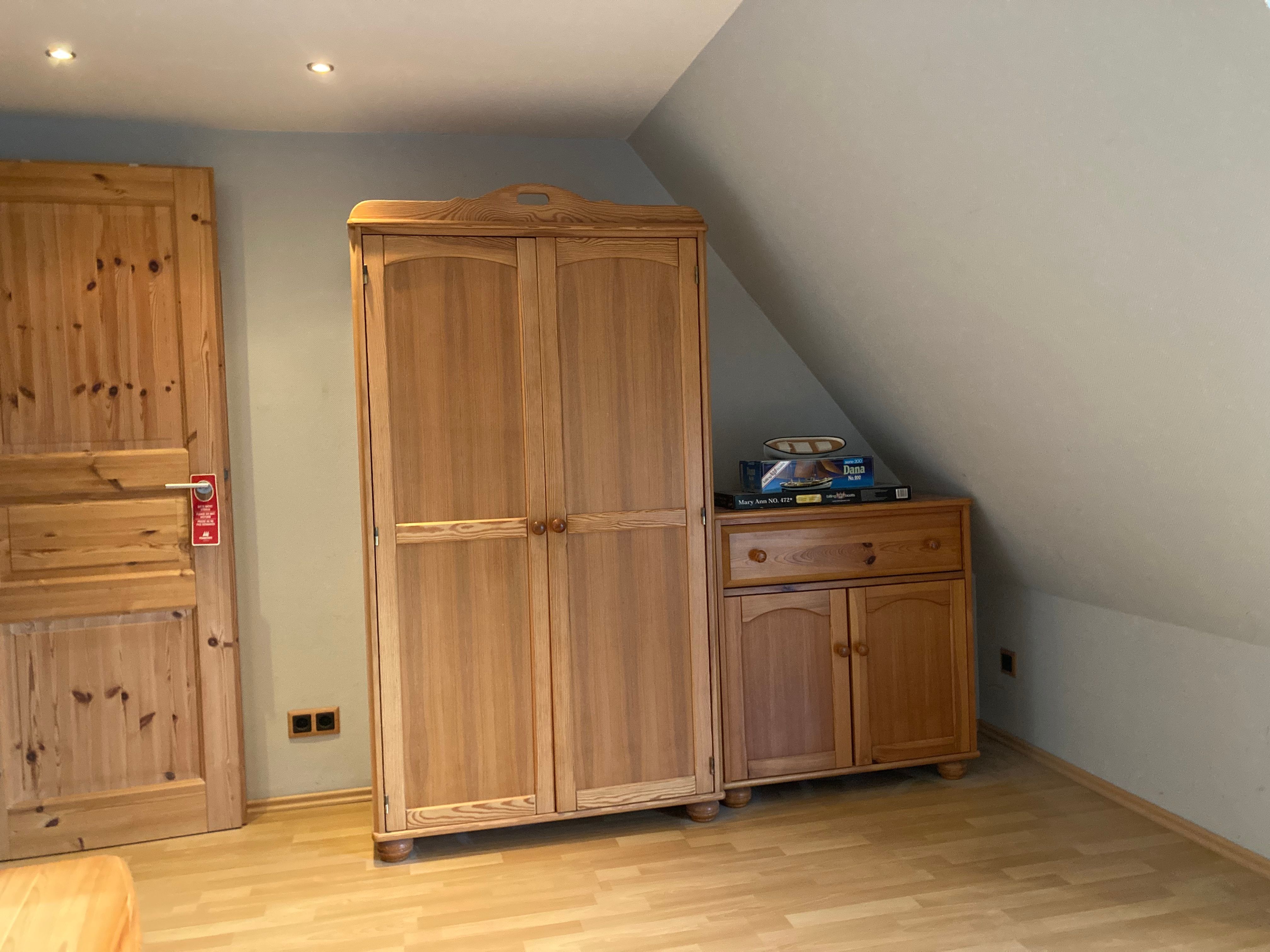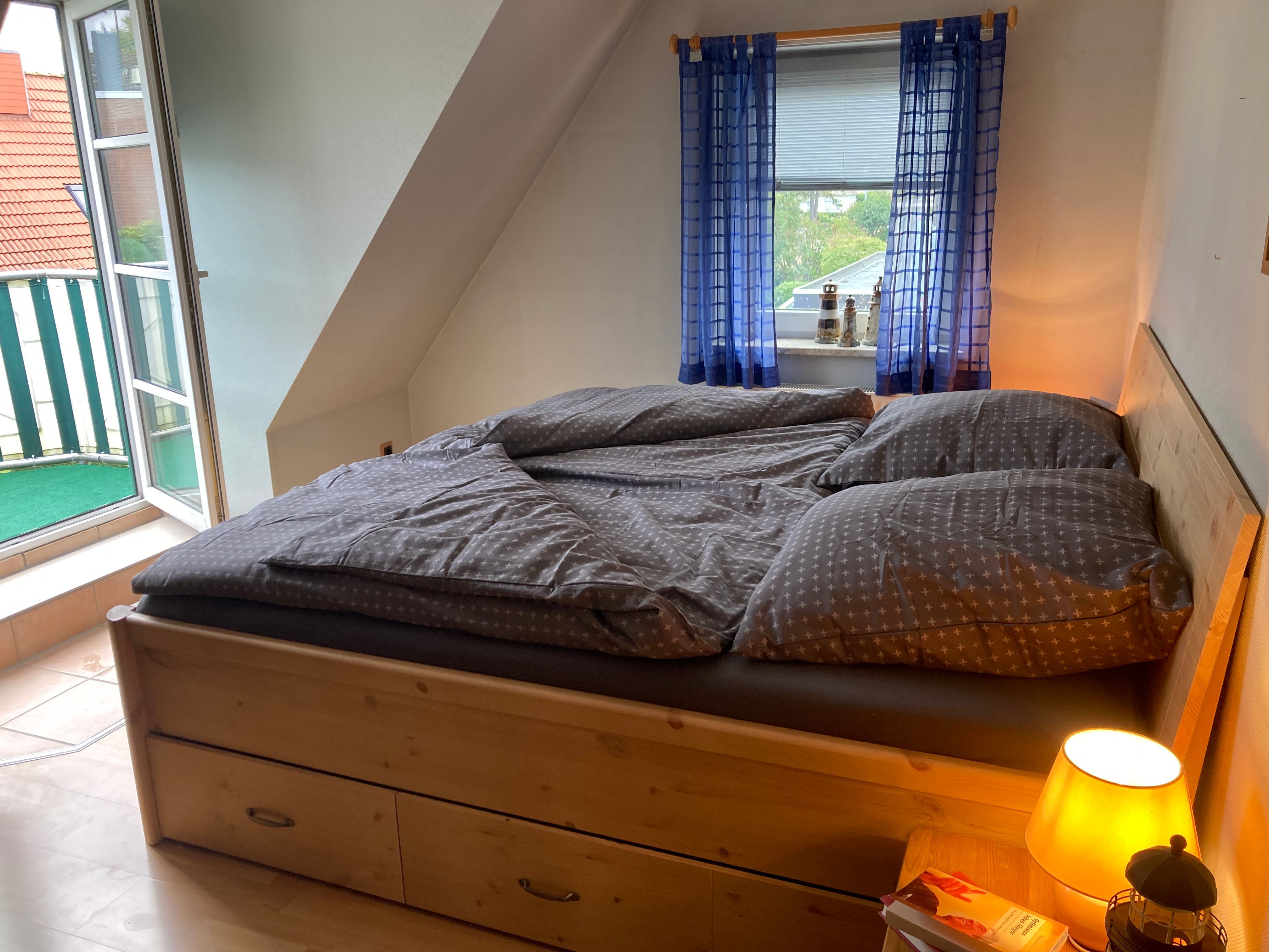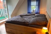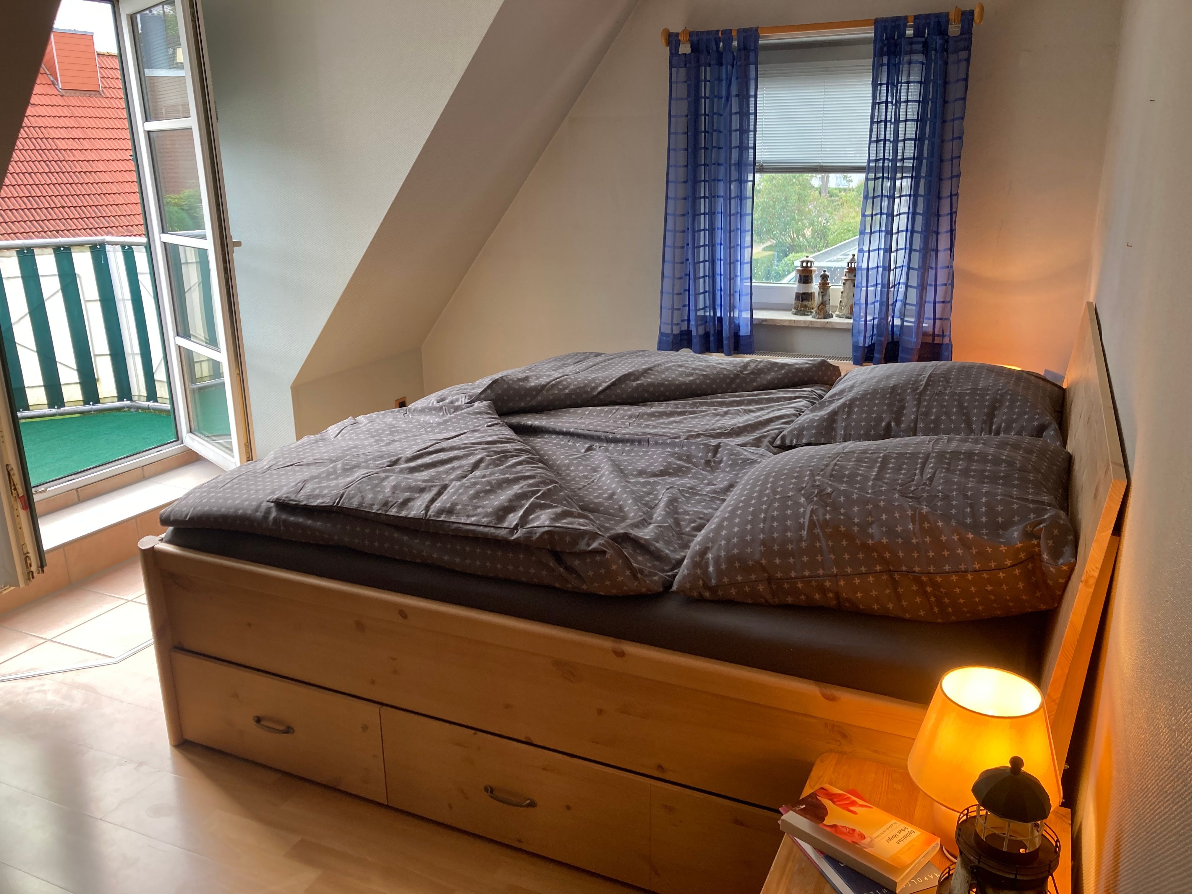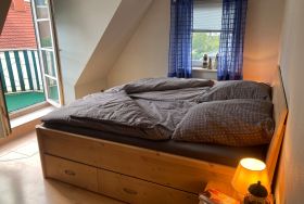 Die obere Etage ist aufgeteilt in 2 helle Schlafzimmer und ein Duschbad/WC. Das eine Schlafzimmer verfügt sogar über einen möblierten Balkon.