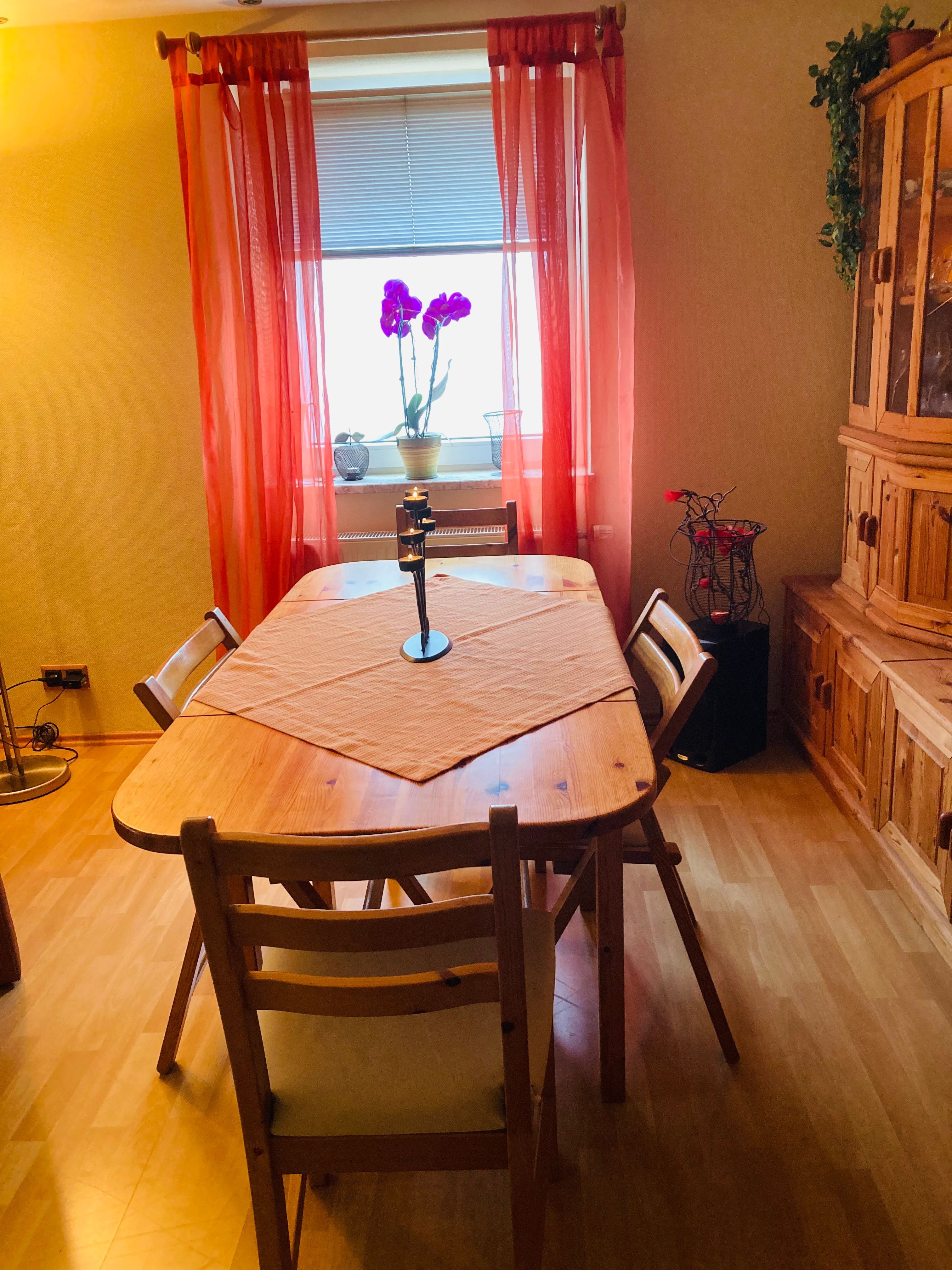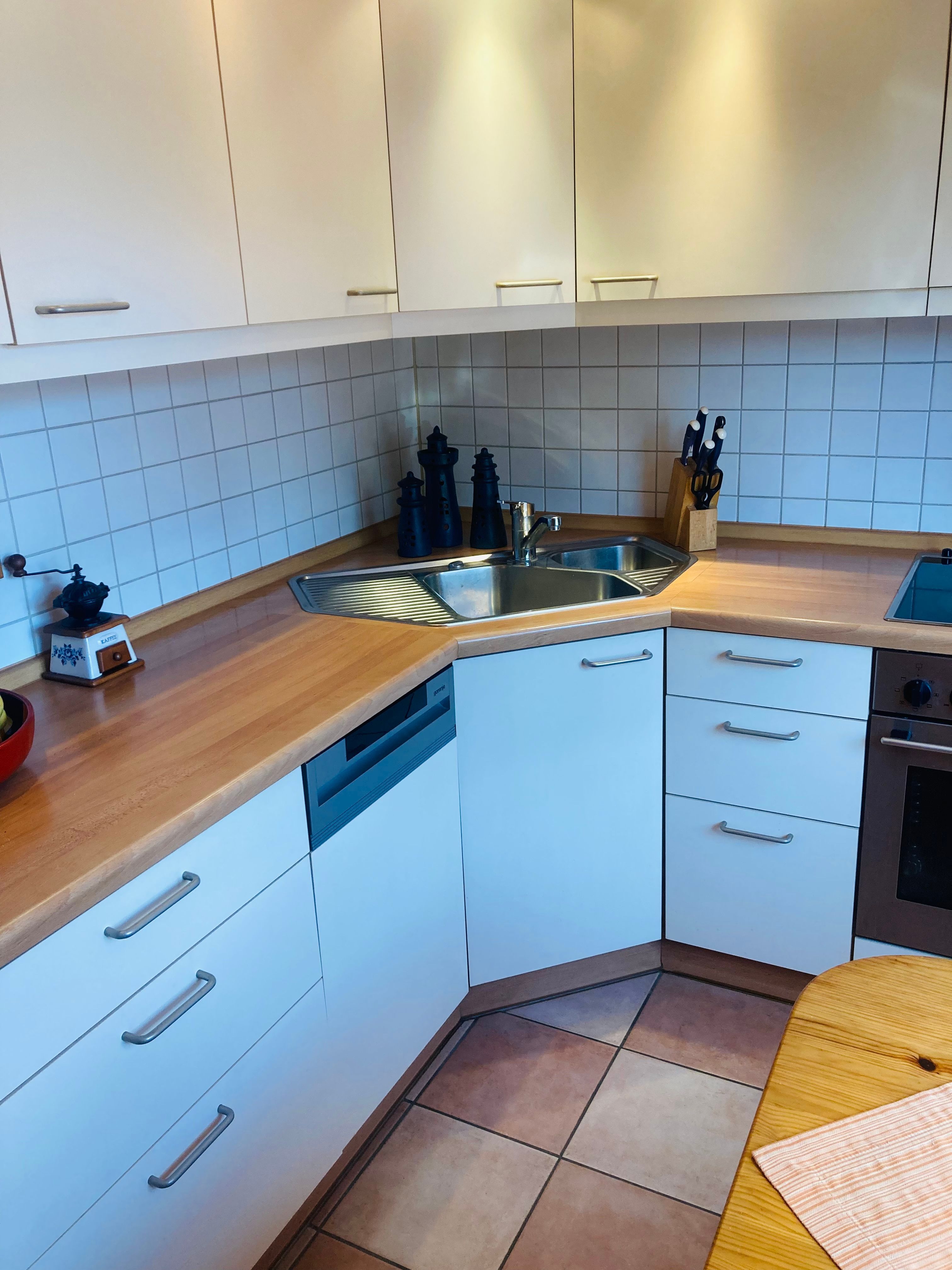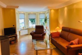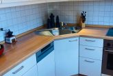 In den großzügigen hellen Wohnraum mit einem bequemen Sofa und Sessel zum Erker hin ist ein Essbereich mit 4 Stühlen integriert. Zubereiten lassen sich die vielfältigsten Speisen in der separaten Küche mit umfassender Ausstattung.