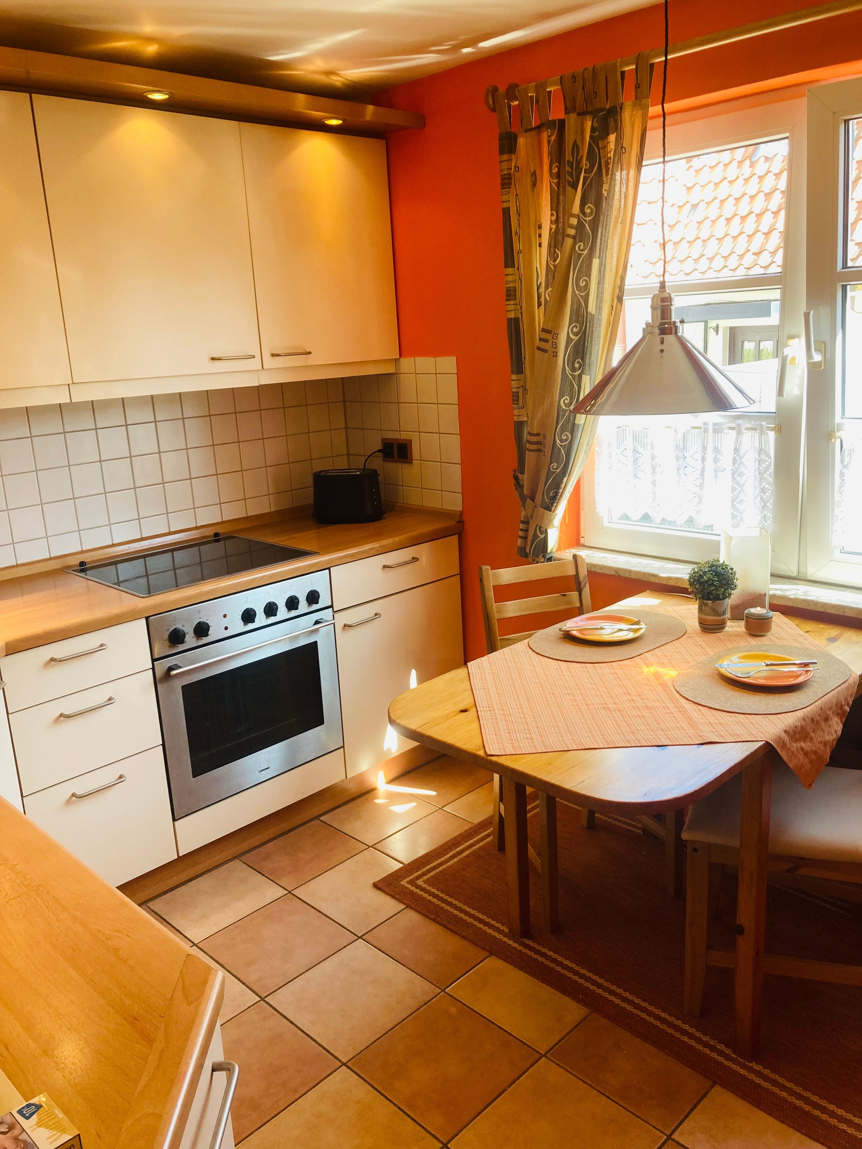 Der helle großzügige Wohnraum ist mit einem bequemen Sofa und Sessel zum Erker hin ausgestattet. Ein gemütlicher Fernsehsessel mit Fußteil lädt zu entspannter Urlaubszeit ein. Über den großen internetfähigen Flachbildfernseher können Sie auch im Urlaub Ihre Lieblingsfilme und -serien empfangen. An kalten, ungemütlichen Tagen trägt der Ofen mit seiner angenehmen verströmenden Wärme zur Gemütlichkeit bei. WLAN ist selbstverständlich inkl. im gesamten Haus. Am integrierten Essbereich mit 4 Stühlen kann gemeinsam gegessen oder gespielt werden. Zubereiten lassen sich die vielfältigsten Speisen in der separaten Küche mit Cerankochfeld, Backofen, Kühlschrank mit Gefrierfach, Geschirrspüler, Mikrowelle und vielen Geräten wie Wasserkocher, Toaster und Kaffeemaschine. Modernes Zubehör ist in entsprechendem Umfang vorhanden.