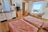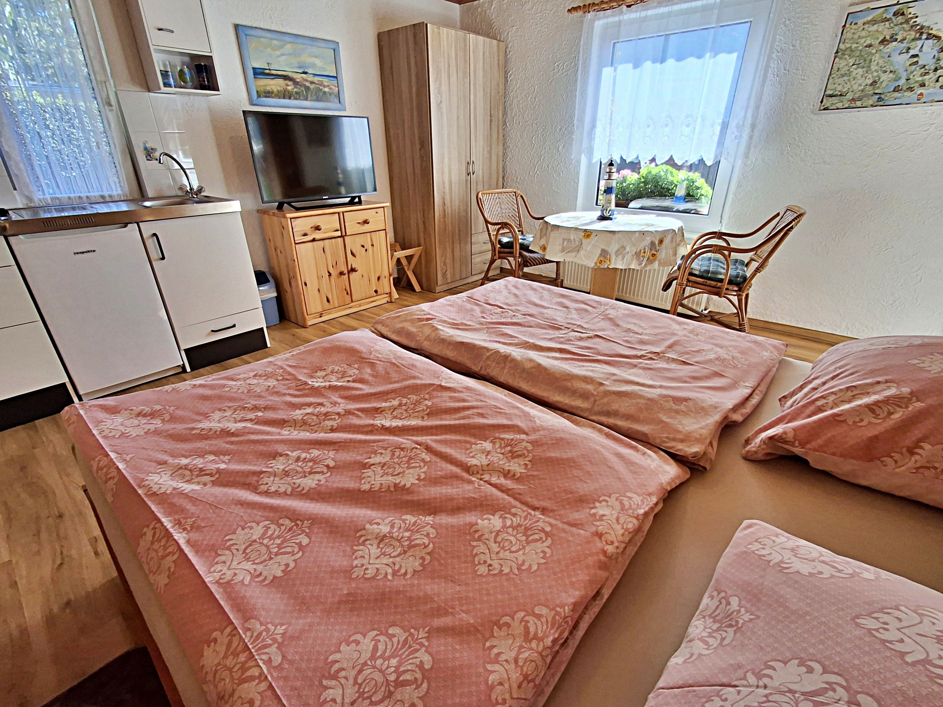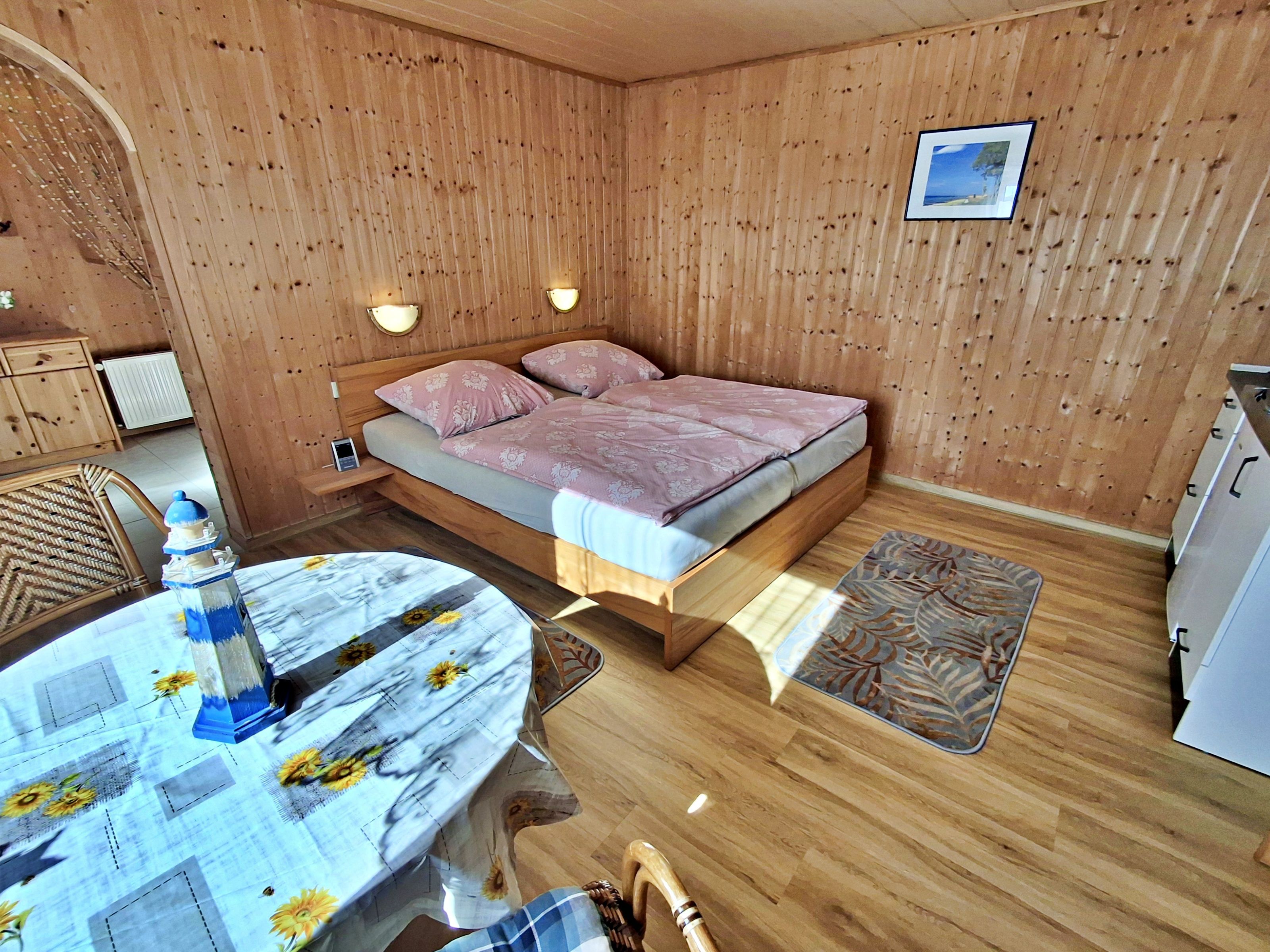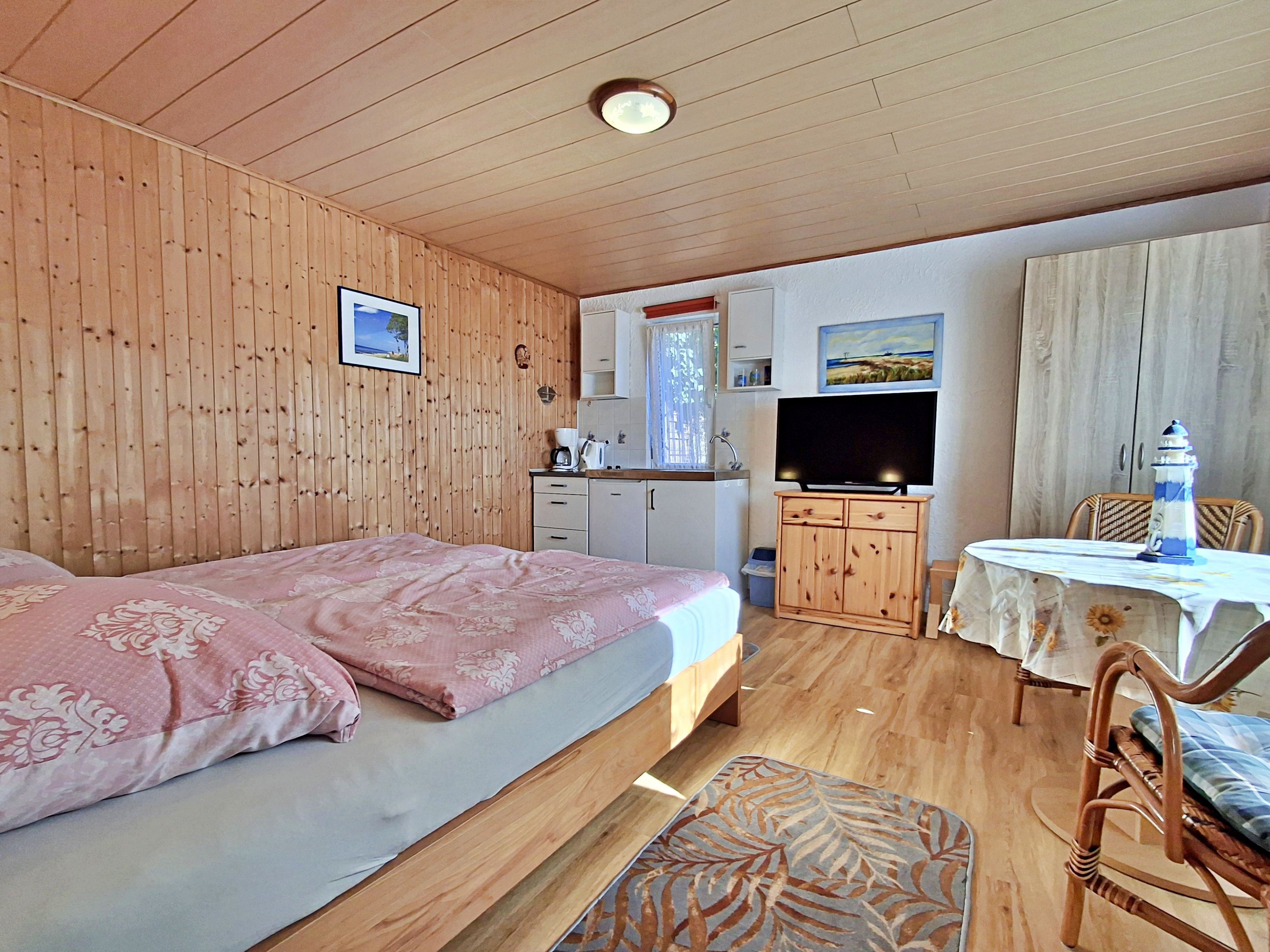 Herzlich willkommen in unserem gemütlichen Bungalow! Auf 30 qm erwartet Sie ein einladender kombinierter Wohn-/Schlafraum, der perfekt für zwei Personen geeignet ist. Genießen Sie die frische Luft auf Ihrer eigenen Terrasse. Zur Ausstattung gehören ein bequemes Doppelbett, Flachbild-TV sowie eine praktische Pantryküche, die mit einem 2-Platten-Cerankochfeld, Kaffeemaschine, Toaster und weiteren nützlichen Utensilien ausgestattet ist. Das praktische Duschbad mit WC ergänzt den Komfort des kleinen Bungalows. Die Erstausstattung Bettwäsche ist bereits im Mietpreis enthalten, sodass Sie sich um nichts kümmern müssen. Bitte bringen Sie Ihre eigenen Handtücher mit.