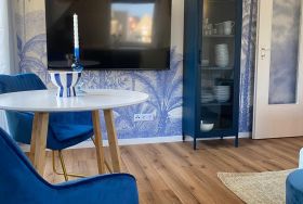 Liebevoll eingerichtet mit blauen Akzenten und Naturmaterialien. Das Wohnzimmer ist gemütlich, die Küche komplett ausgestattet – perfekt für Selbstversorger. Das Schlafzimmer mit Queensize-Bett sorgt für erholsame Nächte, das Bad für einen frischen Start in den Tag. Der kleine Balkon lädt zu entspannten Abenden ein.