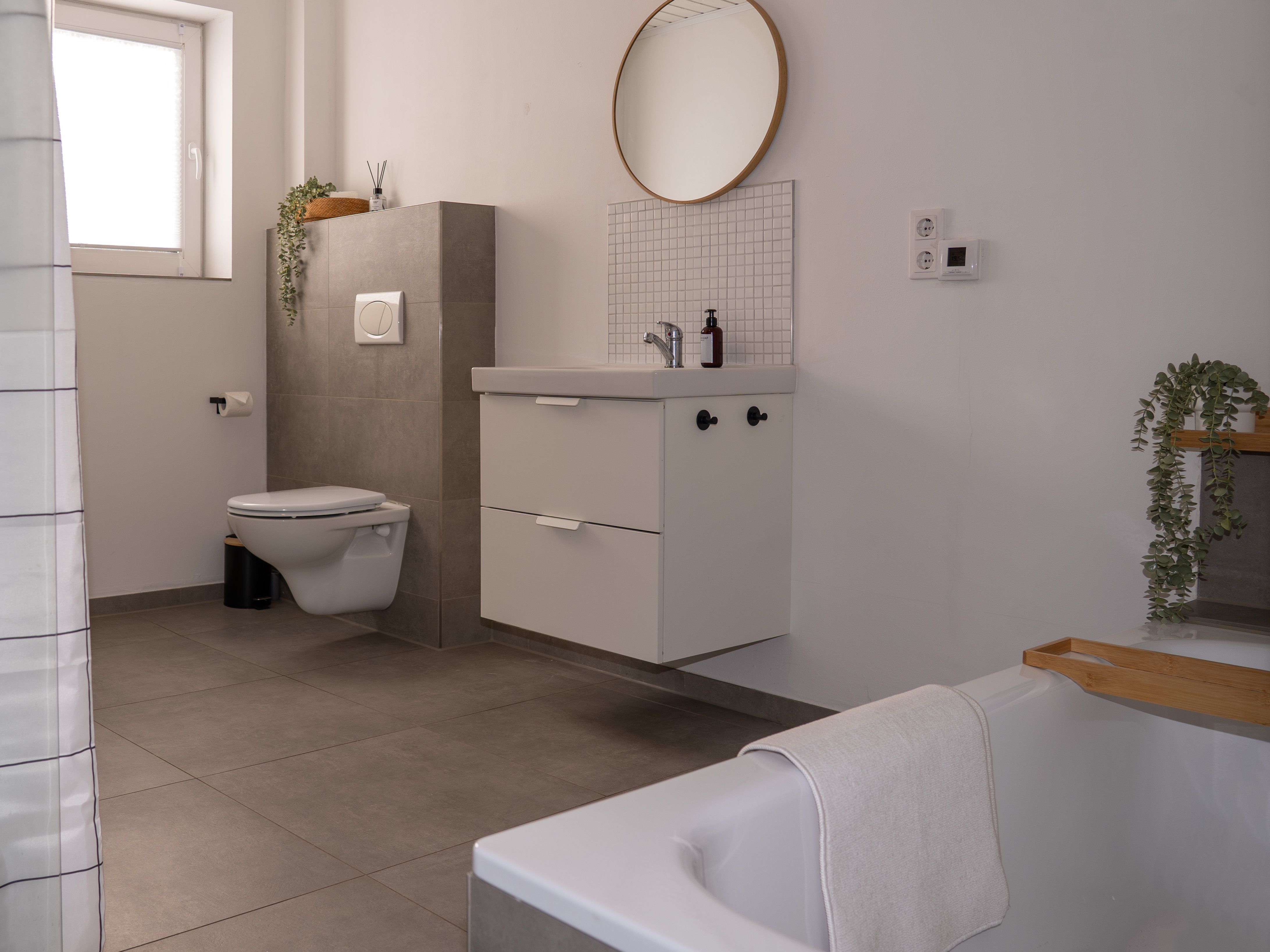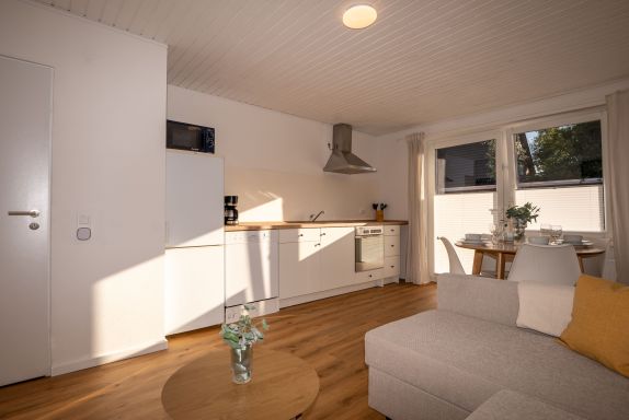 Der offene Wohnbereich beherbergt eine Küchenzeile, einen Essplatz und eine Sofaecke. Von hier aus gelangen Sie auf die Sonnenterrasse. Ein Tageslichtbad mit ebenerdiger Dusche und Badewanne ist großzügig bemessen.