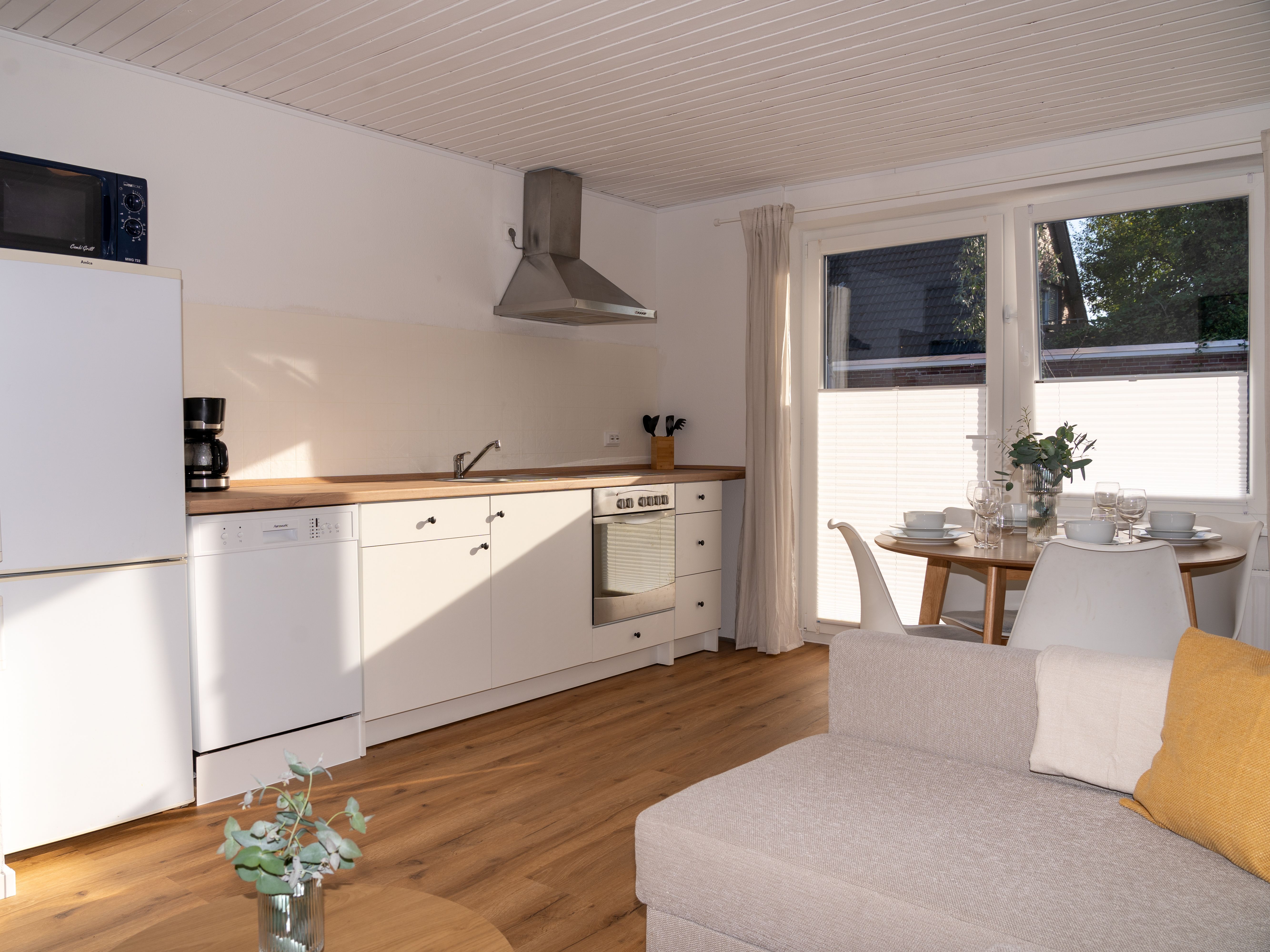 Kühlschrank mit Gefrierfach, Toaster, Eierkocher, Mikrowelle, Filterkaffeemaschine, Wasserkocher, Heißluftfriteuse, Spülmaschine, Kochfeld und Backofen sowie ein Grill für die Terrasse.
