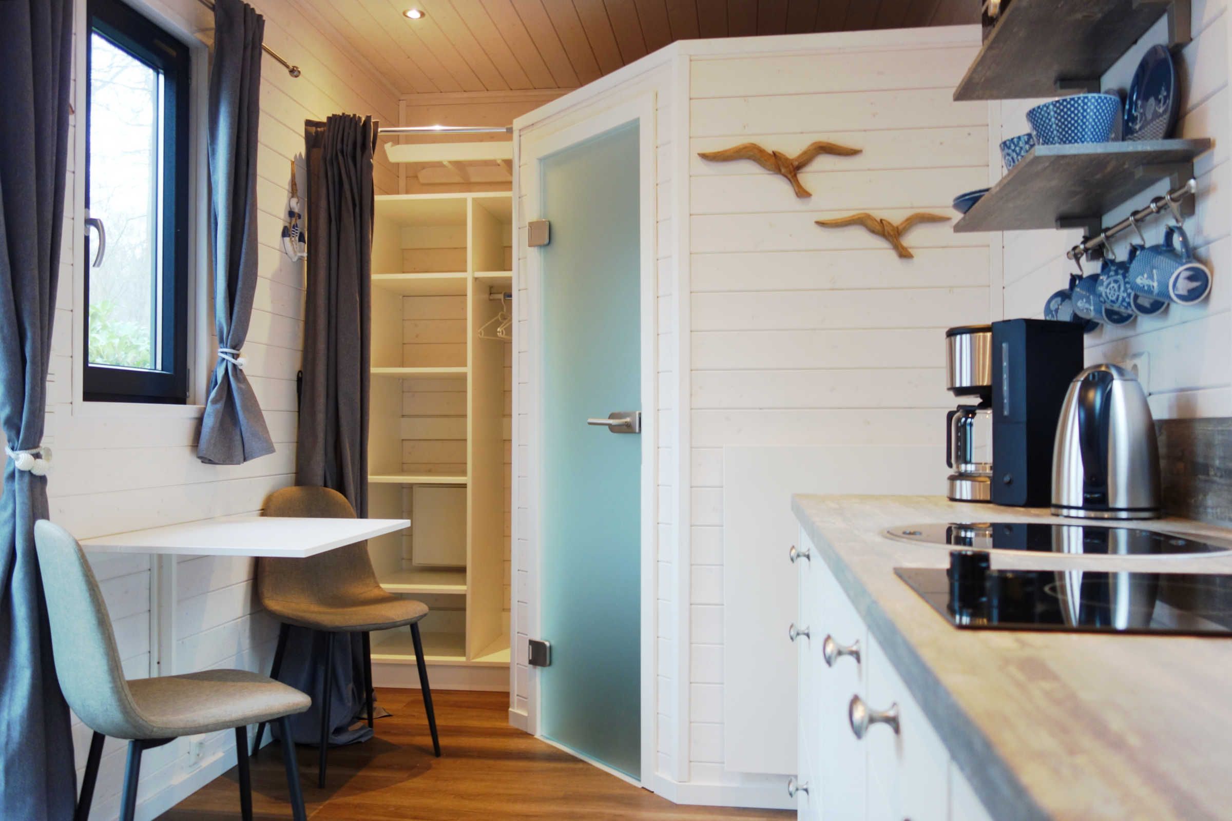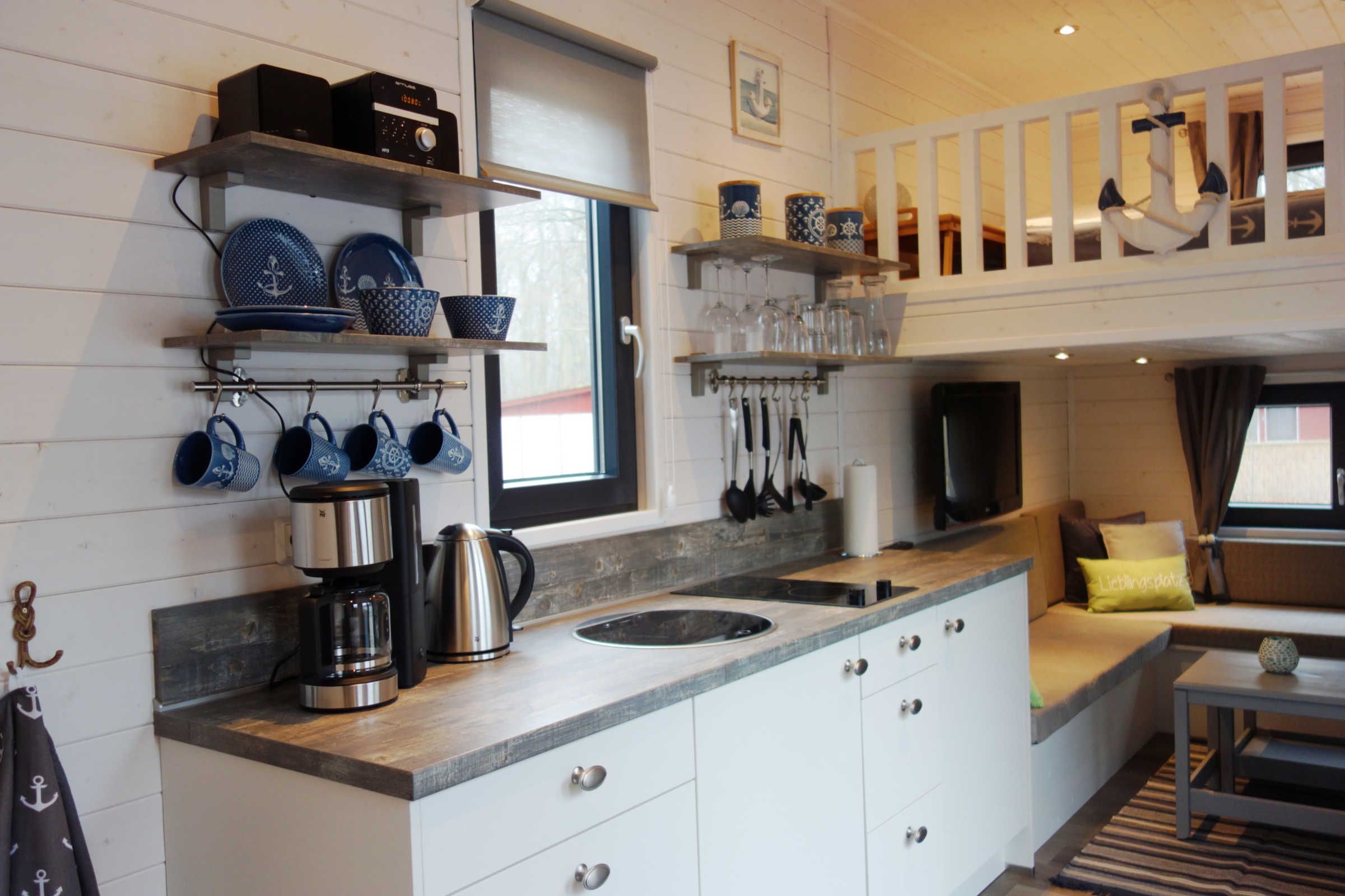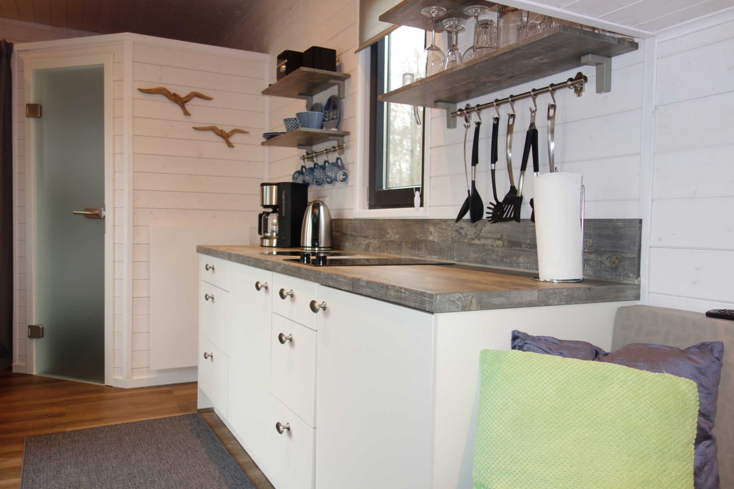Das erste Tiny House in Graal-Müritz steht auf dem Ostseecamp. Das ca. 18 qm große Häuschen auf Rädern verfügt über eine Küchenzeile mit einem Cerankochfeld (2 Kochfelder), einem Kühlschrank, einer Spüle, einem Wasserkocher und einer Kaffeemaschine.