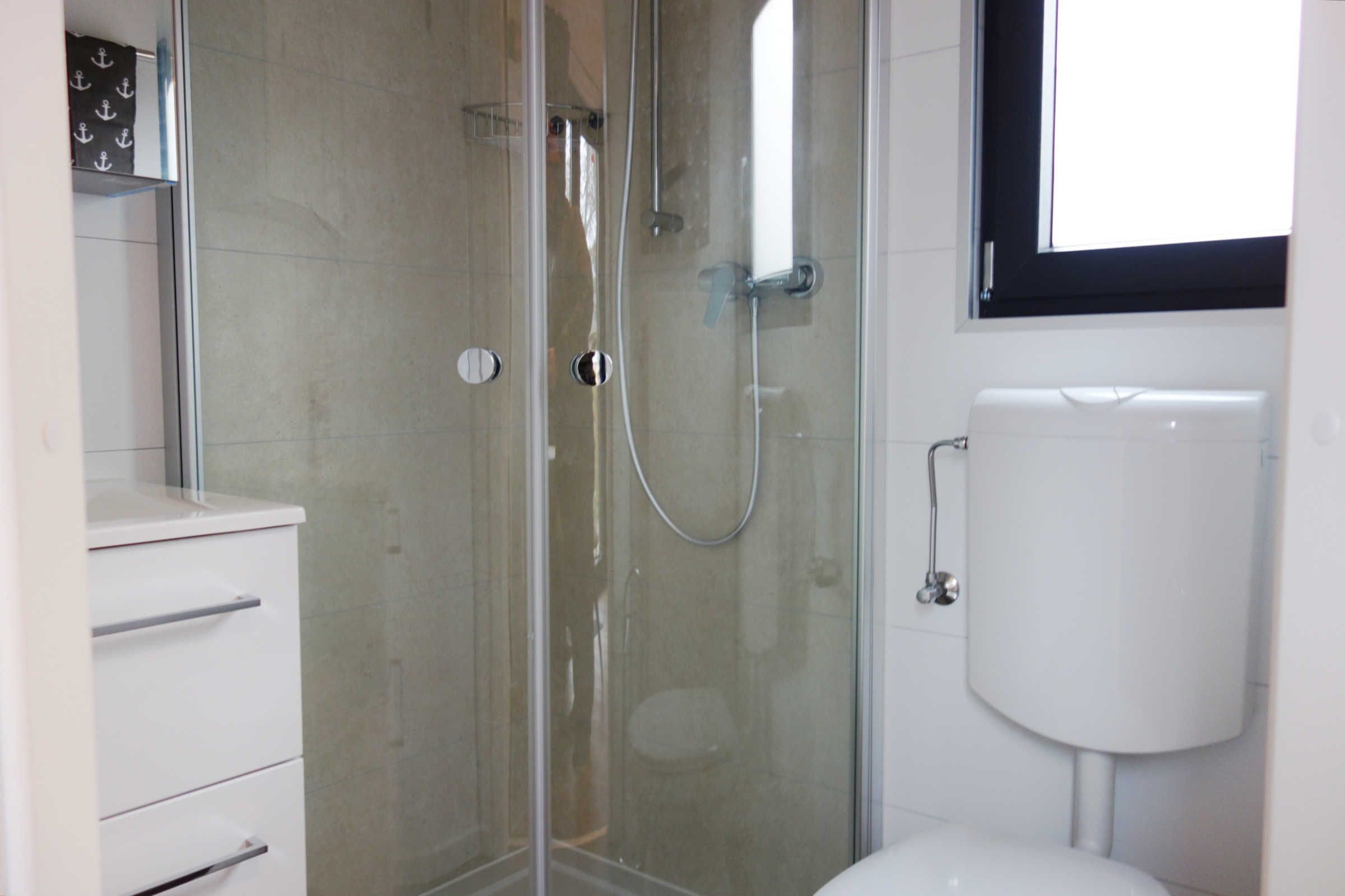 Ein kleines Bad mit einer Dusche, einem Waschtisch und einem WC sowie einem Fenster ist in dem Tiny House integriert.