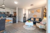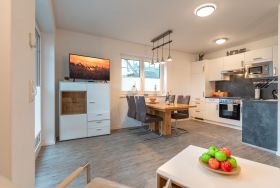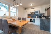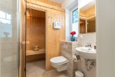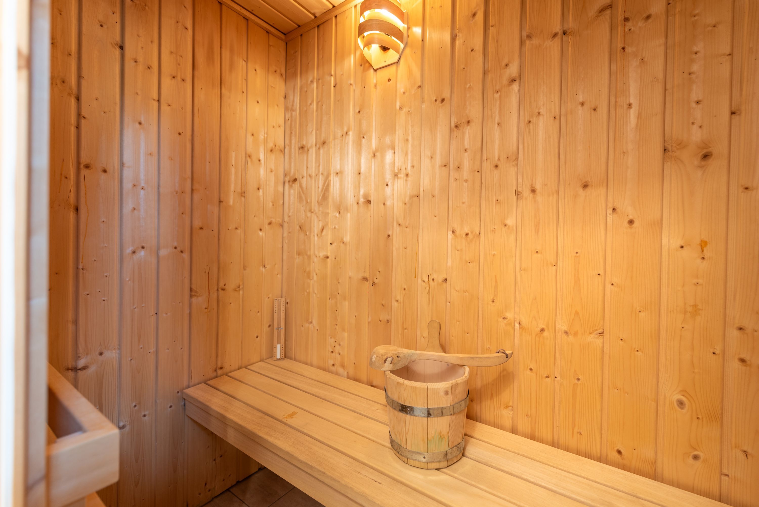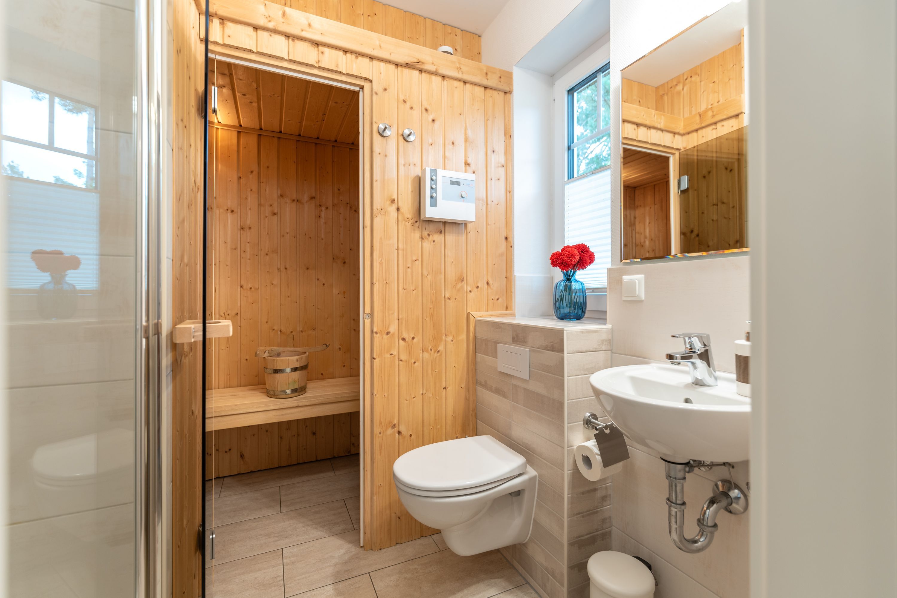 Im Erdgeschoss erwartet Sie ein einladender Wohnbereich mit gemütlicher Couch, Sessel, Smart-TV und einem wärmenden Kamin für behagliche Abende. Der angrenzende Essbereich mit offener Küche bildet das Herzstück des Hauses und lädt zu gemeinsamen Mahlzeiten ein. Ein besonderes Highlight ist das Badezimmer mit Dusche, WC und Sauna, das pure Entspannung verspricht.