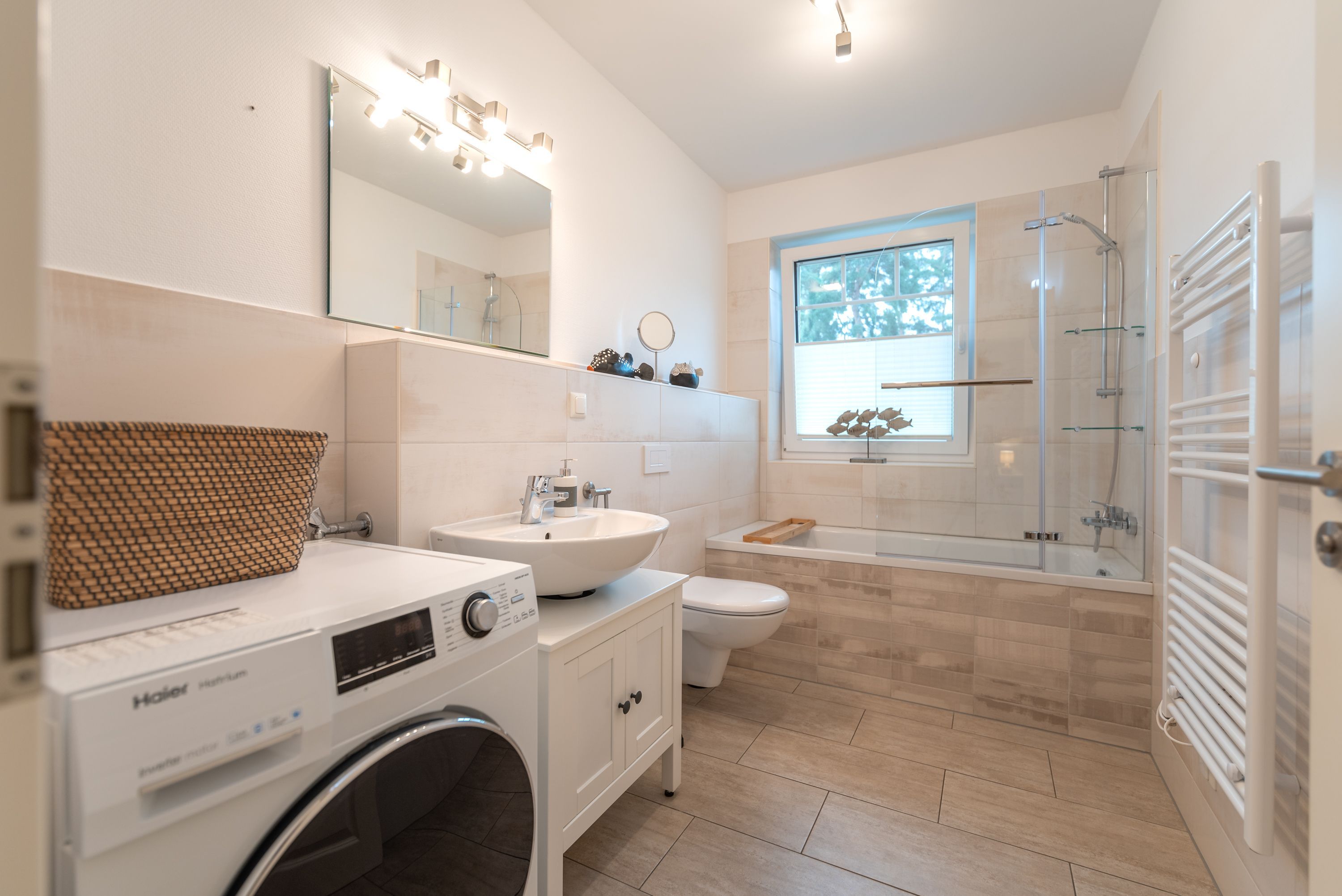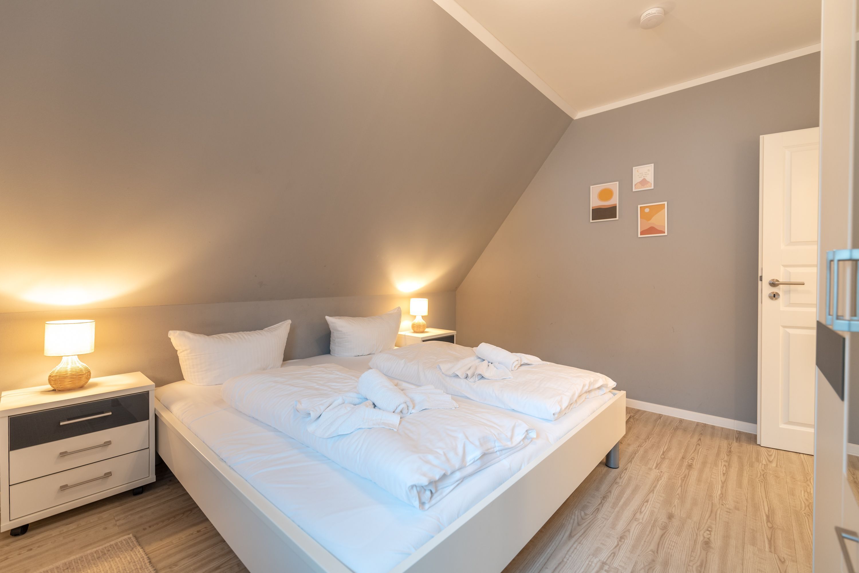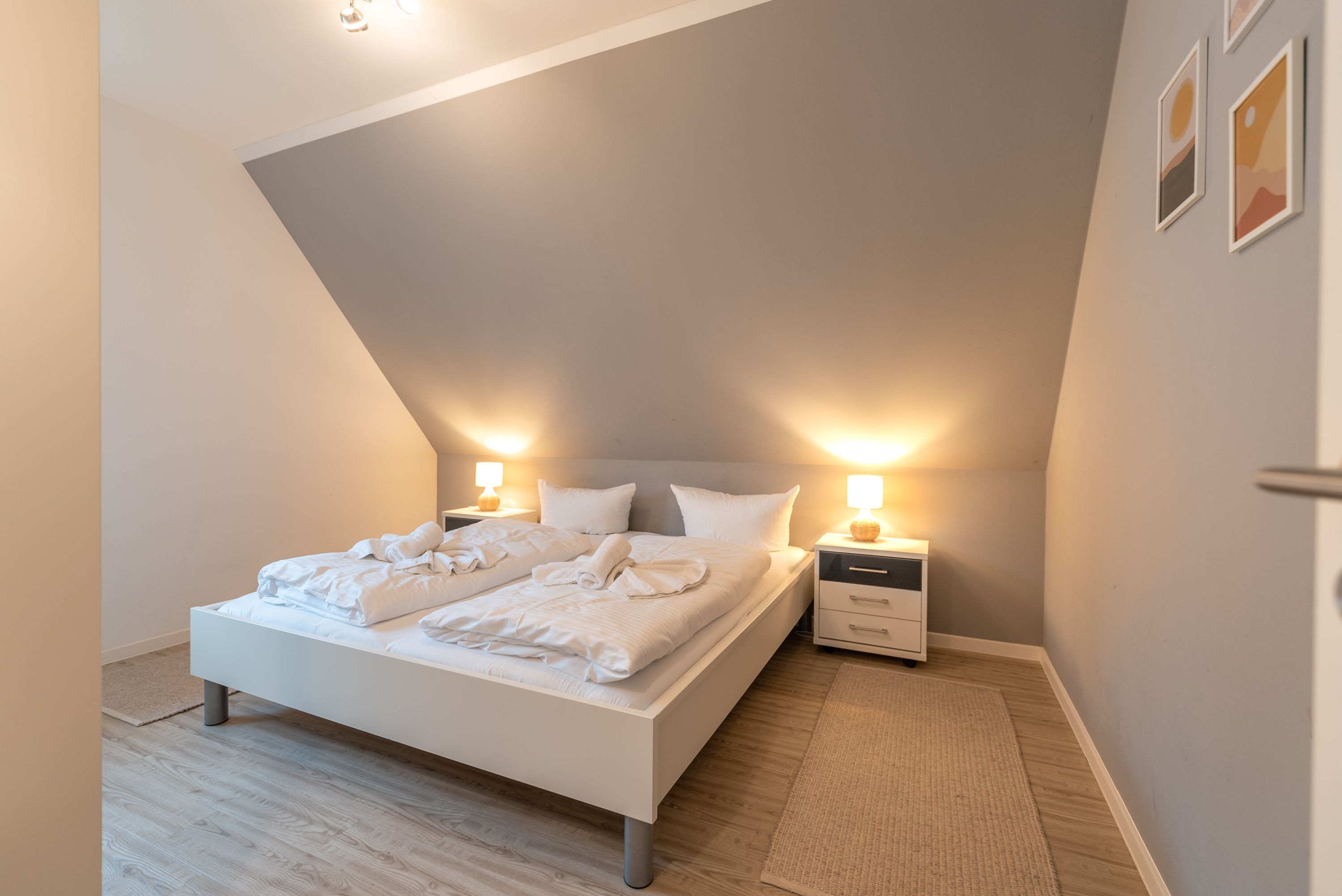 Das Obergeschoss beherbergt zwei liebevoll eingerichtete Schlafzimmer: eines mit einem komfortablen Doppelbett, das andere mit zwei Einzelbetten ideal für Kinder oder Mitreisende. Ergänzt wird die Etage durch ein weiteres Badezimmer mit Dusche, WC und Waschmaschine.