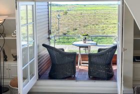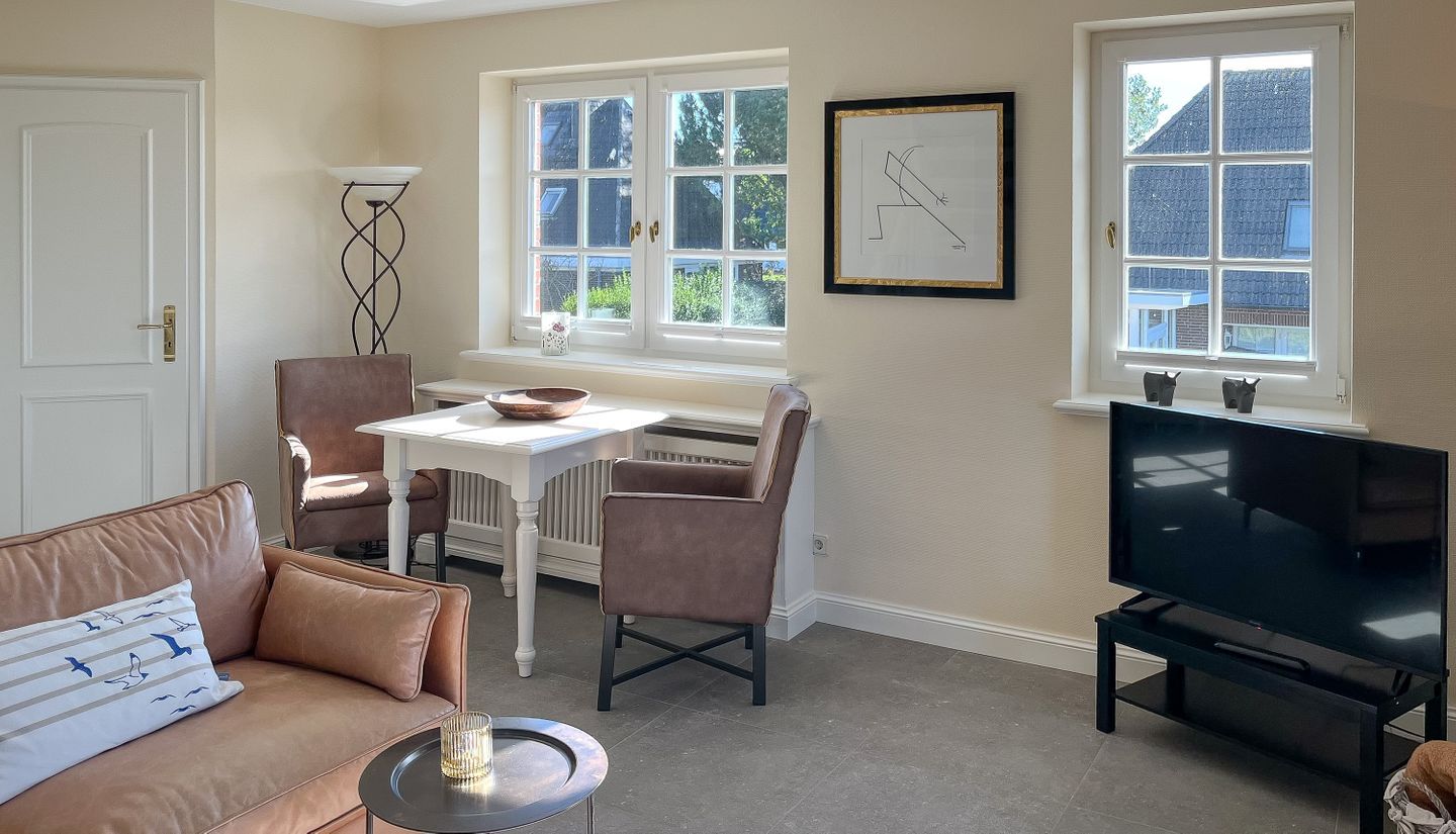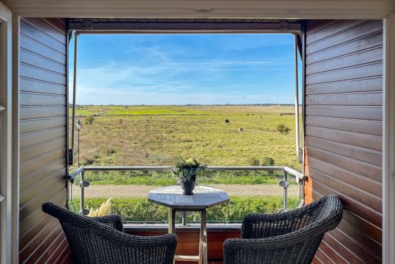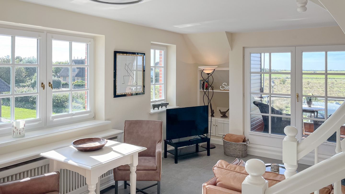 Der grandiose Standort in den Salzwiesen zwischen Morsum und Archsum allein macht diese Ferienwohnung schon zu einem einzigartigen Erlebnis. Hinzu kommt die Lage im Obergeschoss des Hauses mit einer Loggia, die einen atemberaubenden Blick auf das satte Grün der Natur und natürlich einzigartige Sonnenuntergänge bietet.
