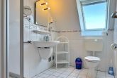 Zur Wohnung gehört ein modernes Badezimmer mit einer Dusche, Haartrockner, Kosmetikspiegel.