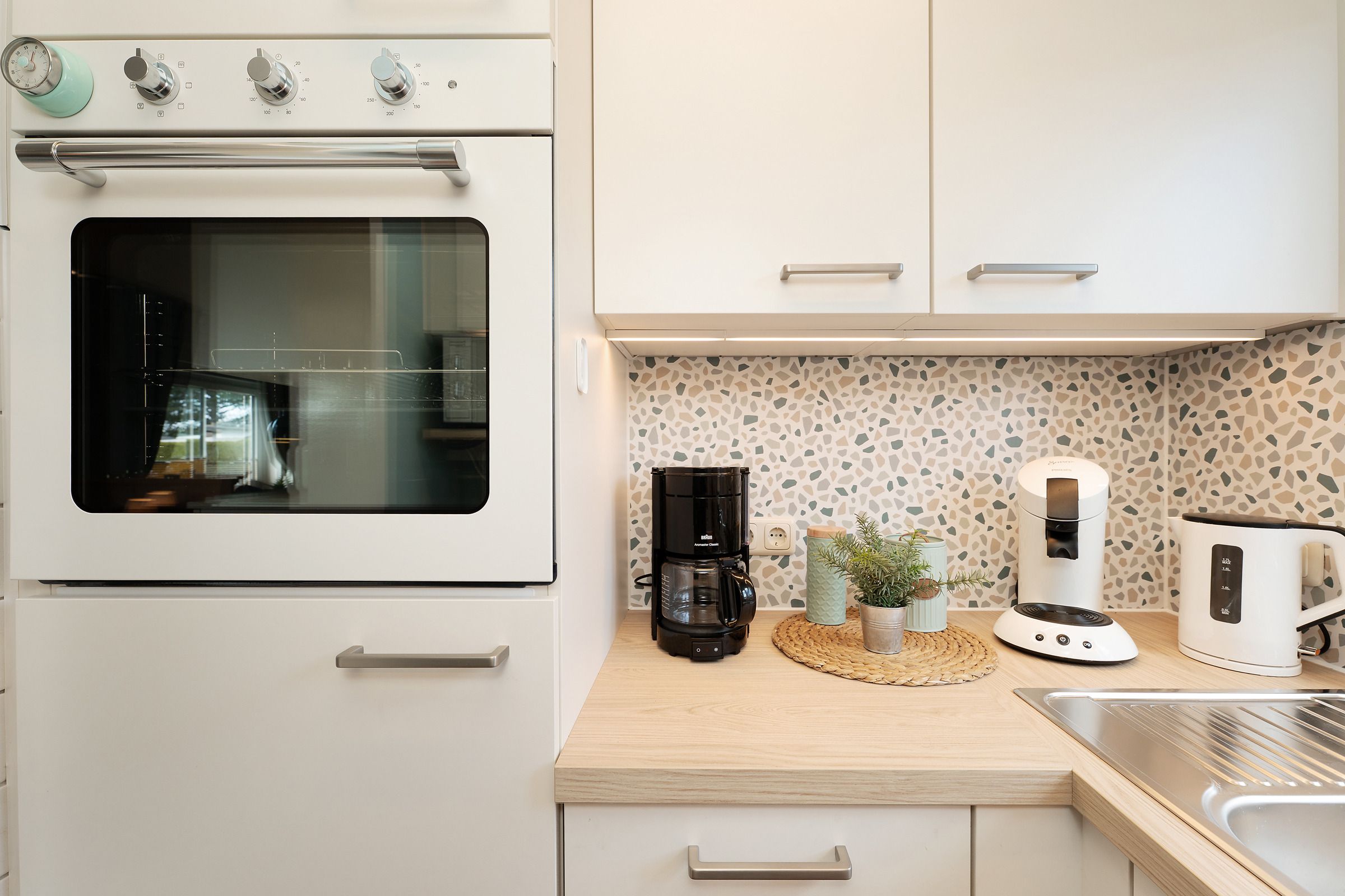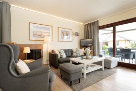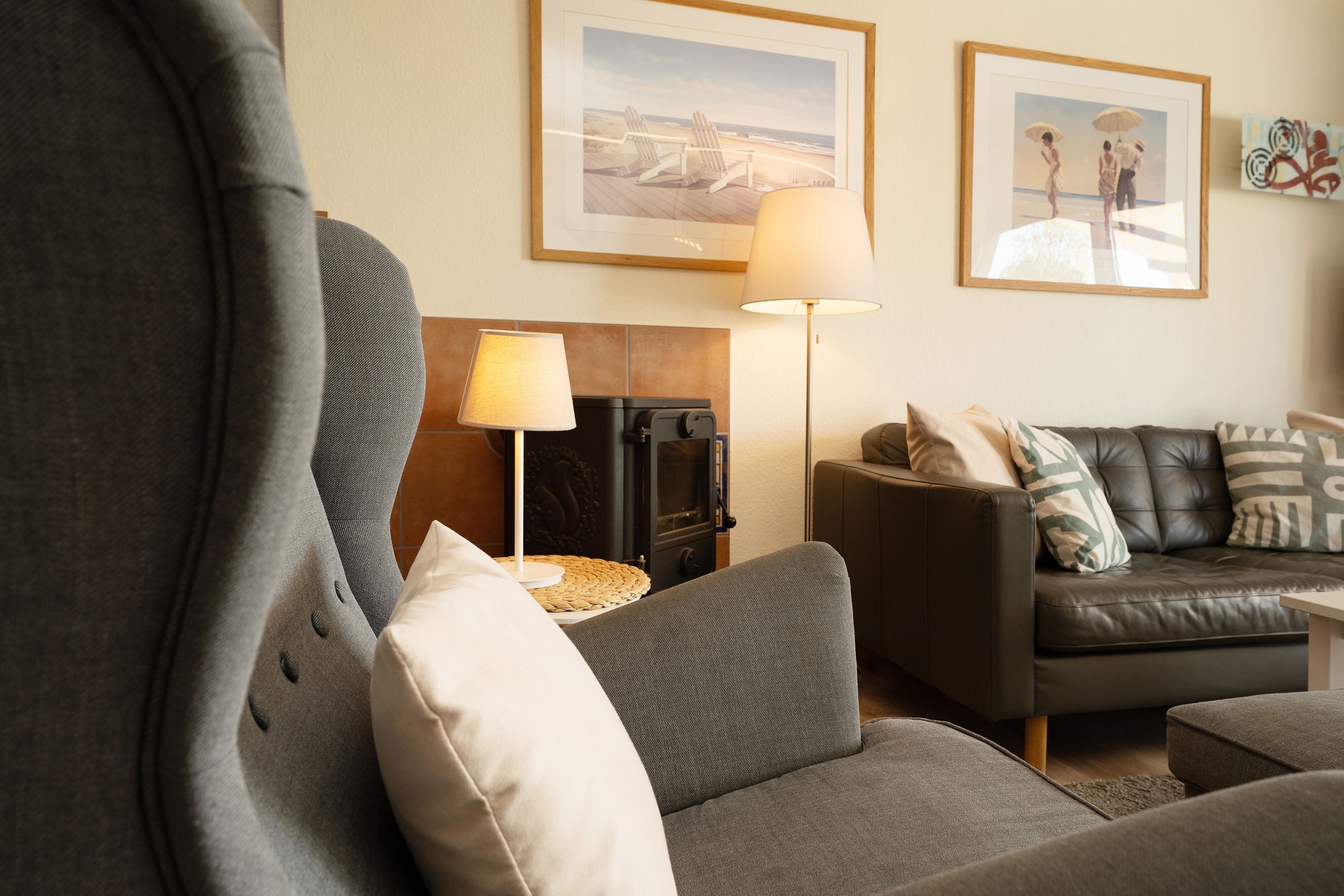 Die angrenzende Küche ist voll ausgestattet und bietet alles, was Sie für ein entspanntes Frühstück oder ein Abendessen nach dem Strandtag brauchen. Der lichtdurchflutete Wohnbereich mit kleinem Doppel-Schrankbett (ca. 160x200 cm) lädt zum Ausruhen ein – ob mit einem guten Buch oder bei knisterndem Feuer im Kaminofen.