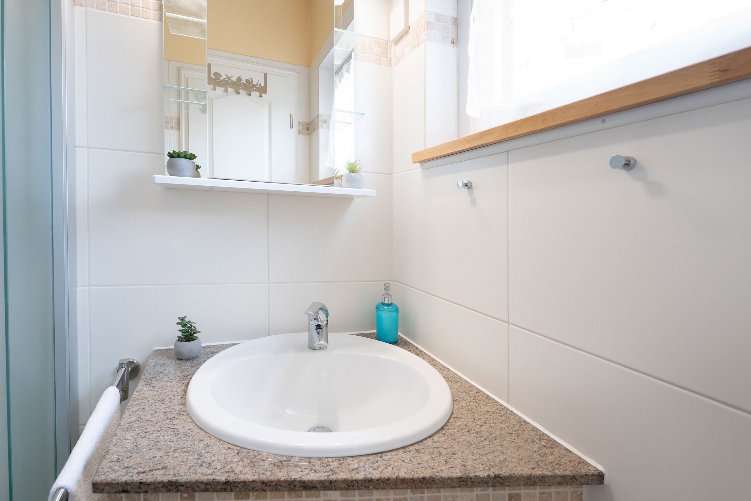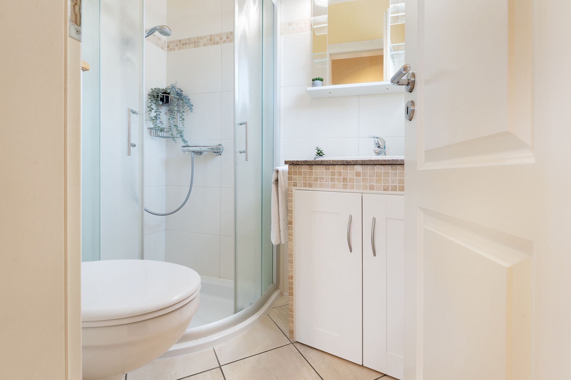 Das Bad mit Dusche sorgt für den Frischekick am Morgen – oder nach einem wohltuenden Saunagang: Denn das Highlight des Hauses ist die private Aufguss-Sauna im Garten – ganz für Sie allein!