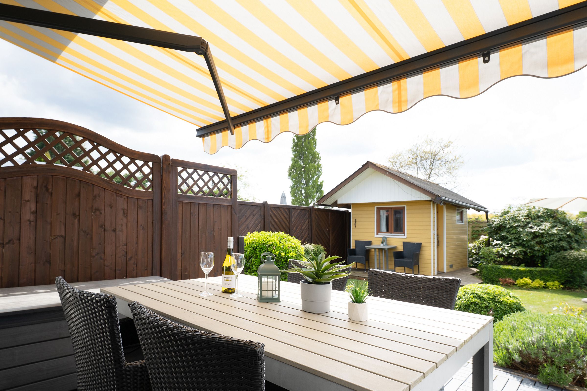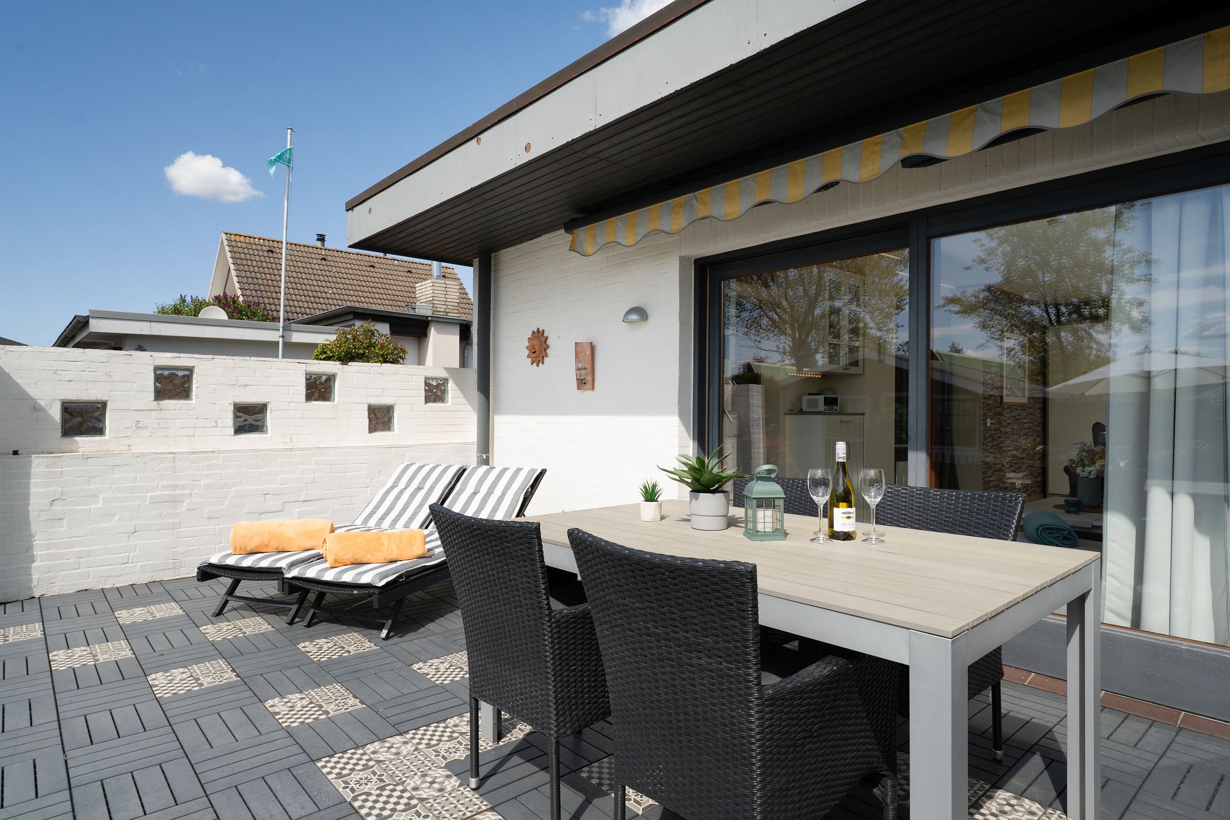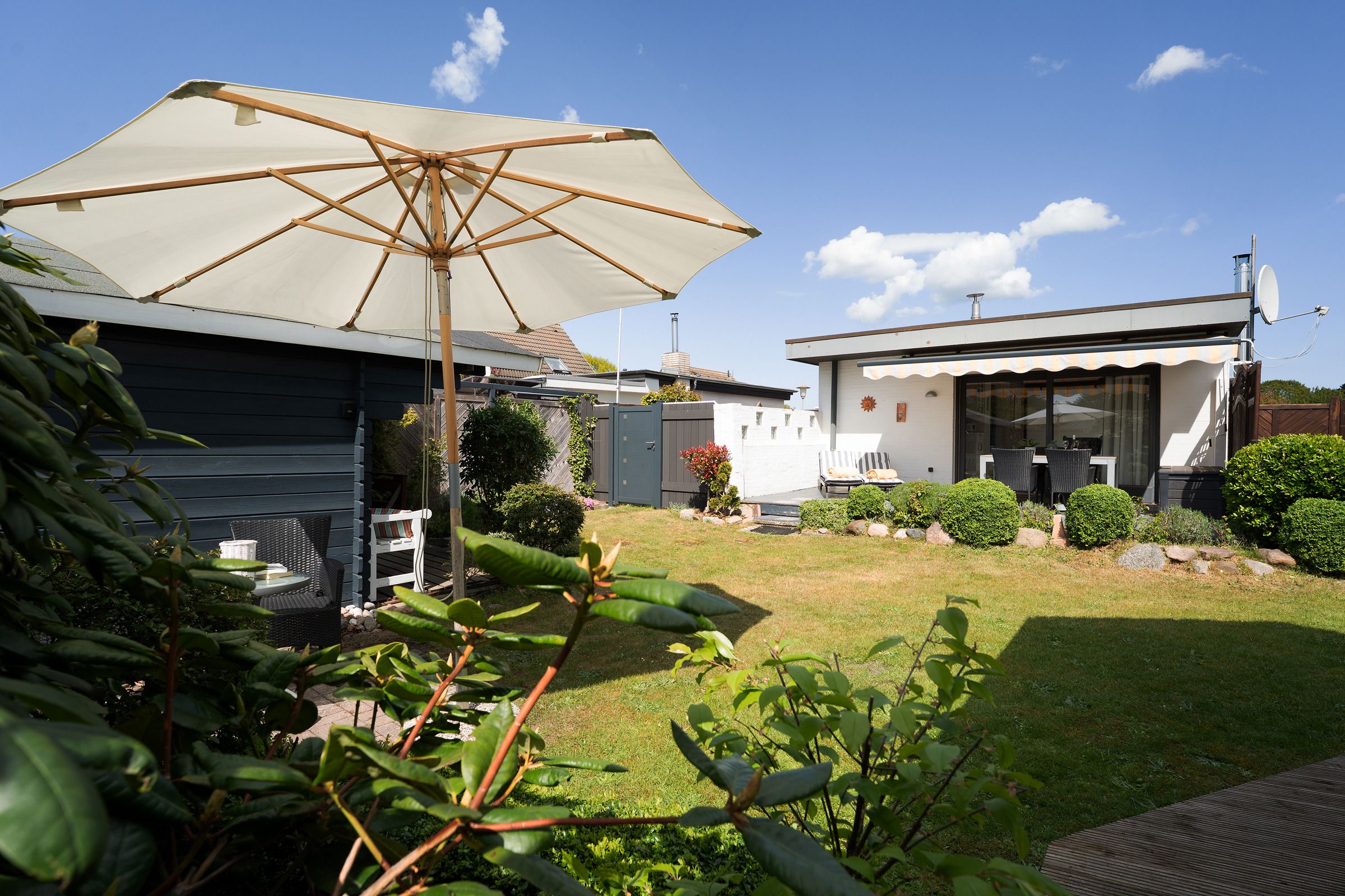 Genießen Sie sonnige Stunden auf der möblierten Süd-West-Terrasse mit Blick ins Grüne. Der angrenzende Garten macht das Urlaubsgefühl perfekt – ob zum Entspannen, Spielen oder Grillen.