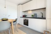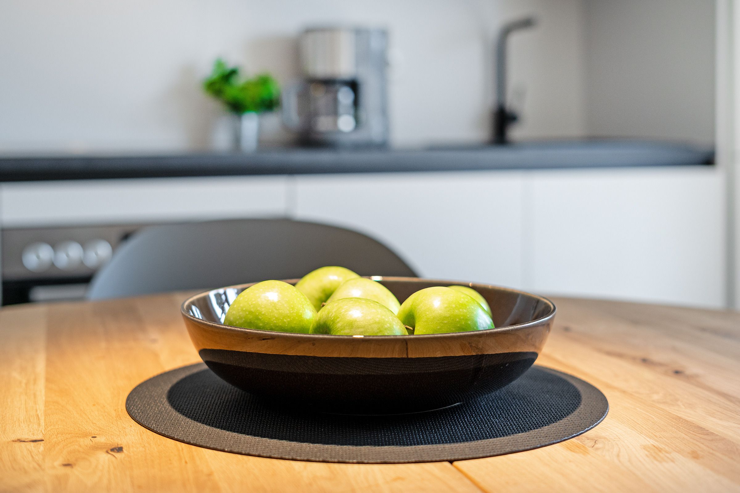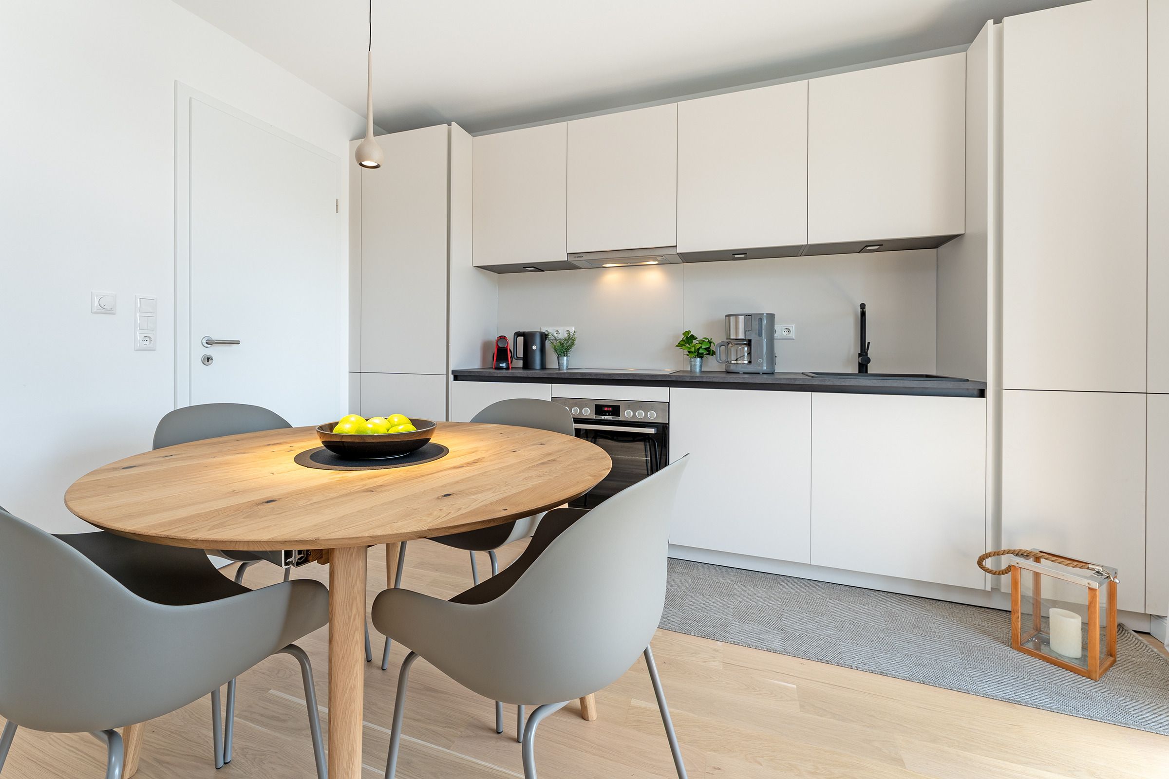 Der offen gestaltete Wohn- und Essbereich mit angrenzender Küche besticht durch eine geschmackvolle, zeitlos-moderne Einrichtung mit liebevollen maritimen Akzenten. Im Wohnbereich laden ein gemütliches Sofa und ein Flachbild-TV zu entspannten Stunden ein. Die hochwertige, offene Küche ist vollständig ausgestattet und lässt keine Wünsche offen.