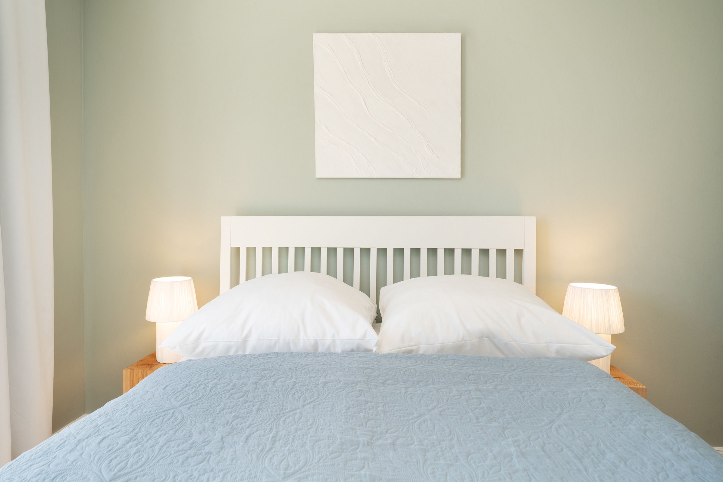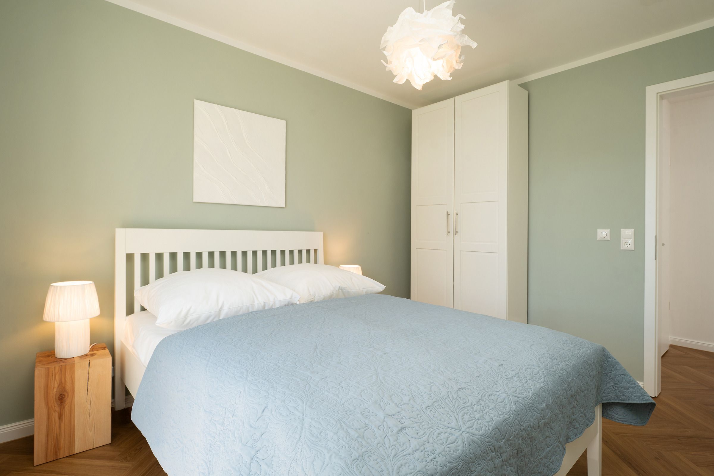 Schlafzimmer 1: 1 Doppelbett (2x 80x200 cm), Kleiderschrank, Verdunkelung: Gardinen, Platz für ein Babybett vorhanden