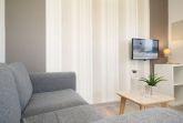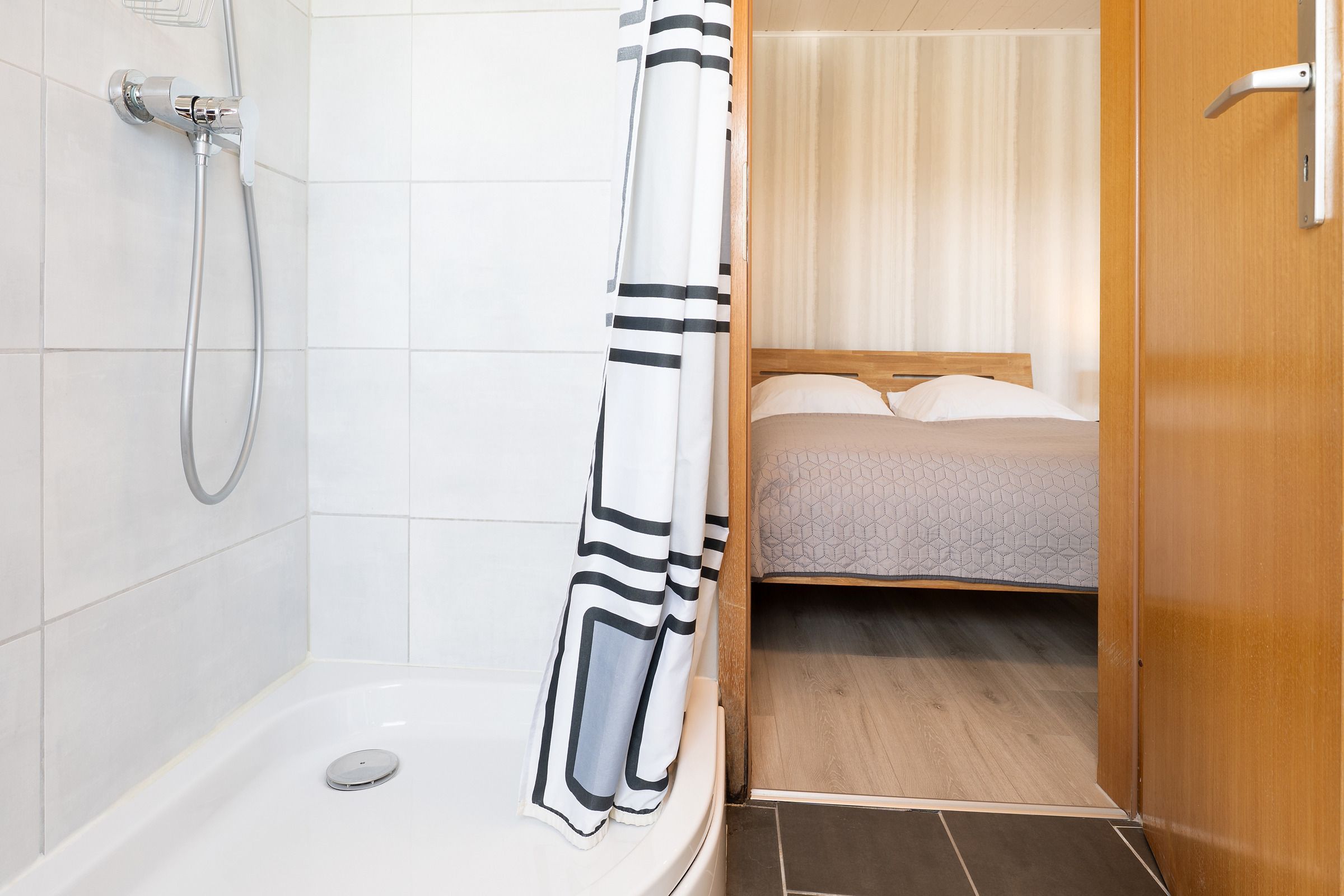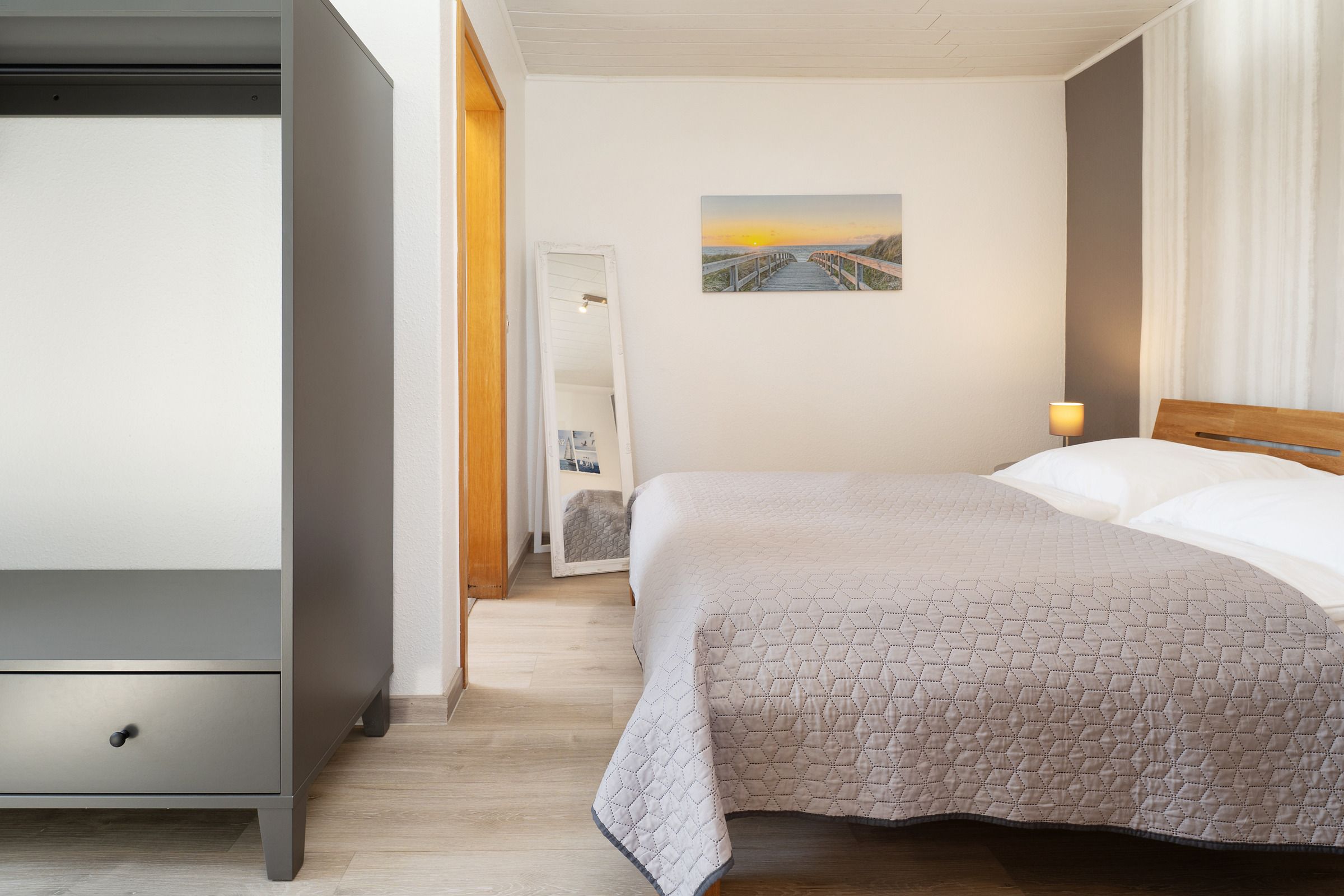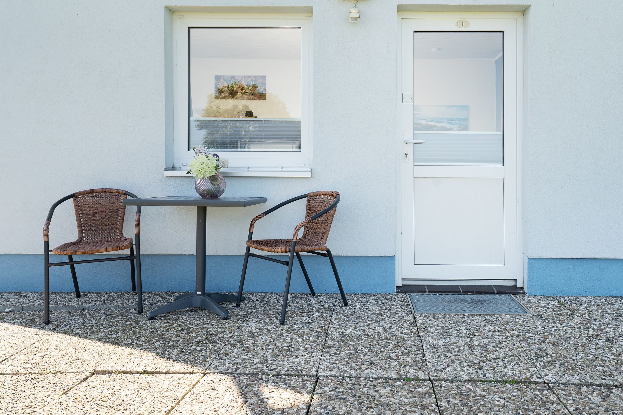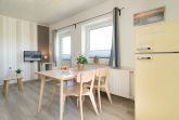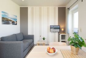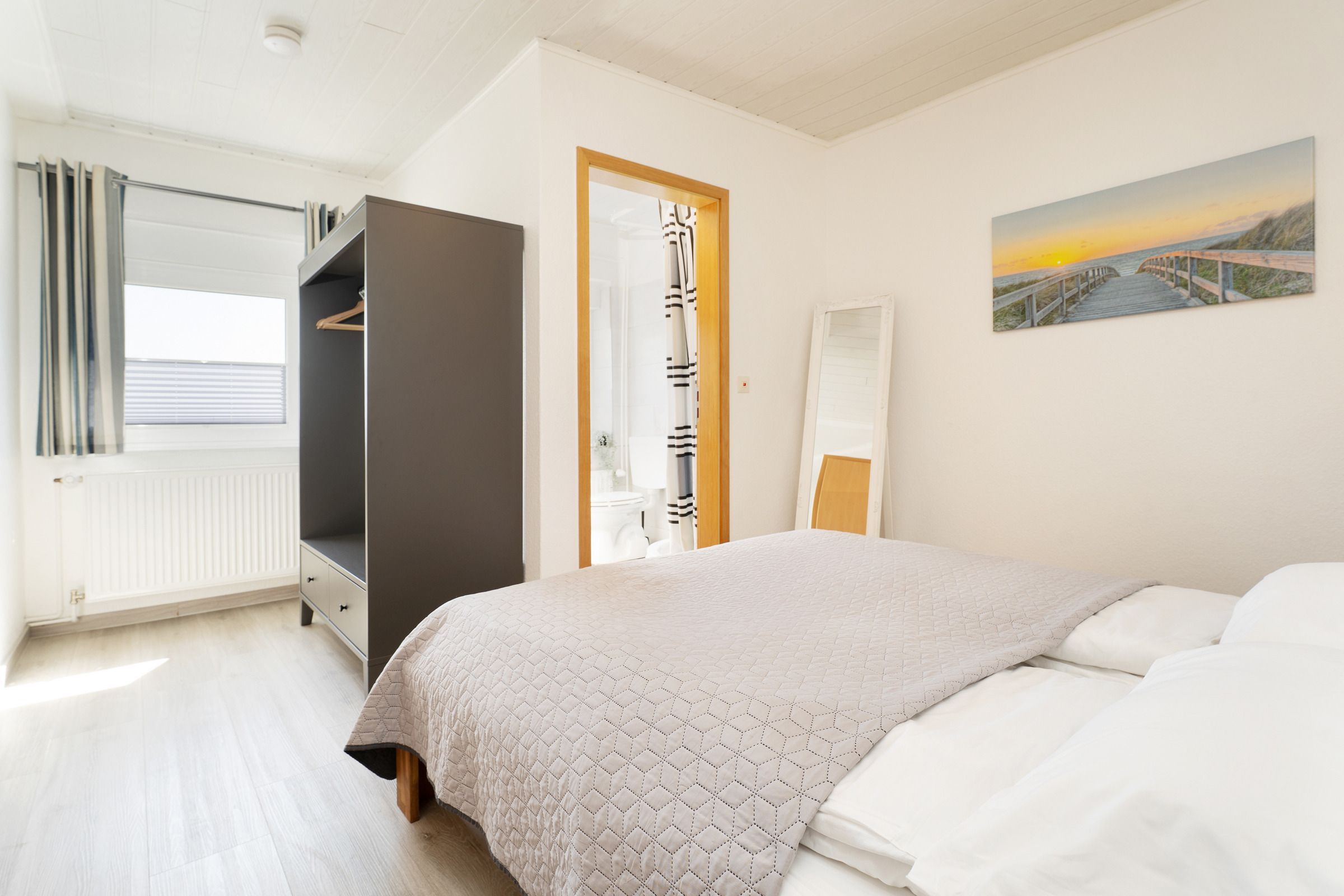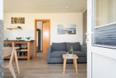 Der lichtdurchflutete Wohnbereich lädt mit einem Fernseher und komfortabler Sitzecke zum Entspannen ein. Direkt angrenzend befindet sich ein Gemeinschaftsgarten mit Gartenmöbeln, Sonnenliegen und einem Strandkorb– ideal für ruhige Stunden im Freien. Die Küchenzeile ist funktional ausgestattet mit Mikrowelle, Kaffeemaschine, Wasserkocher und Toaster – perfekt, um sich auch im Urlaub selbst zu versorgen. Der Essbereich bietet ausreichend Platz für gemeinsame Mahlzeiten. Im separaten Schlafzimmer mit Kleiderschrank steht ein bequemes Doppelbett (2x 90x200 cm) für erholsame Nächte bereit. Das moderne Badezimmer ist mit Dusche und WC ausgestattet.