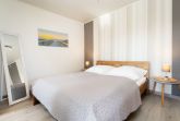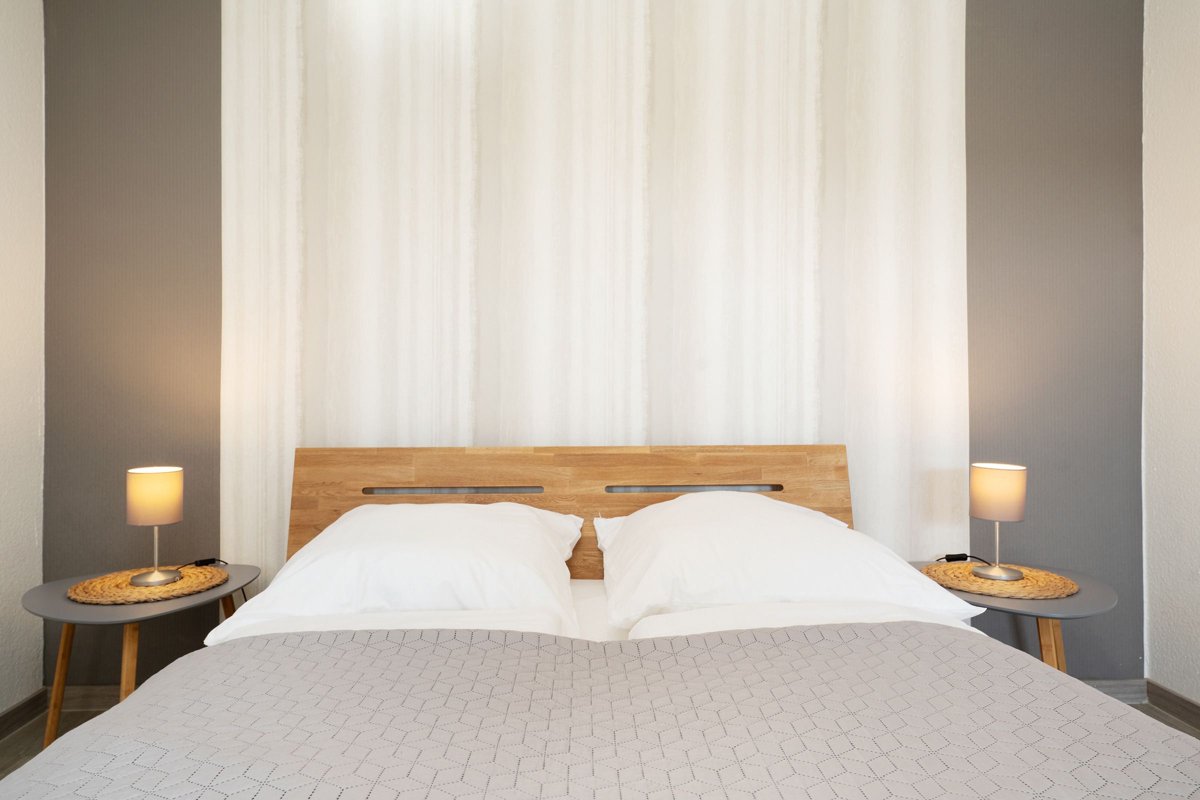 Schlafzimmer: 1 Doppelbett (2x 90x200 cm), Kleiderschrank, Verdunkelung: Außenjalousie, Platz für ein Babybett