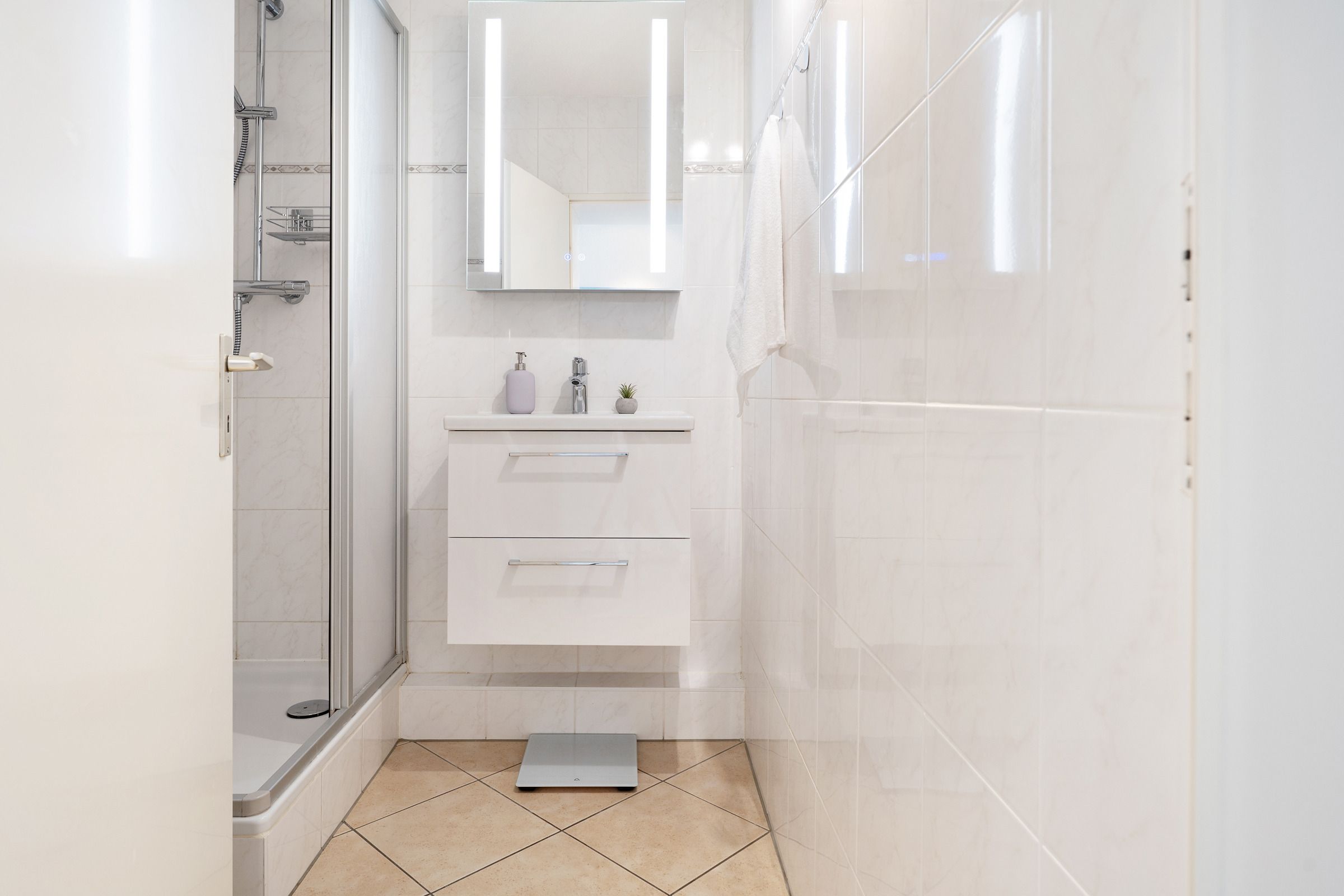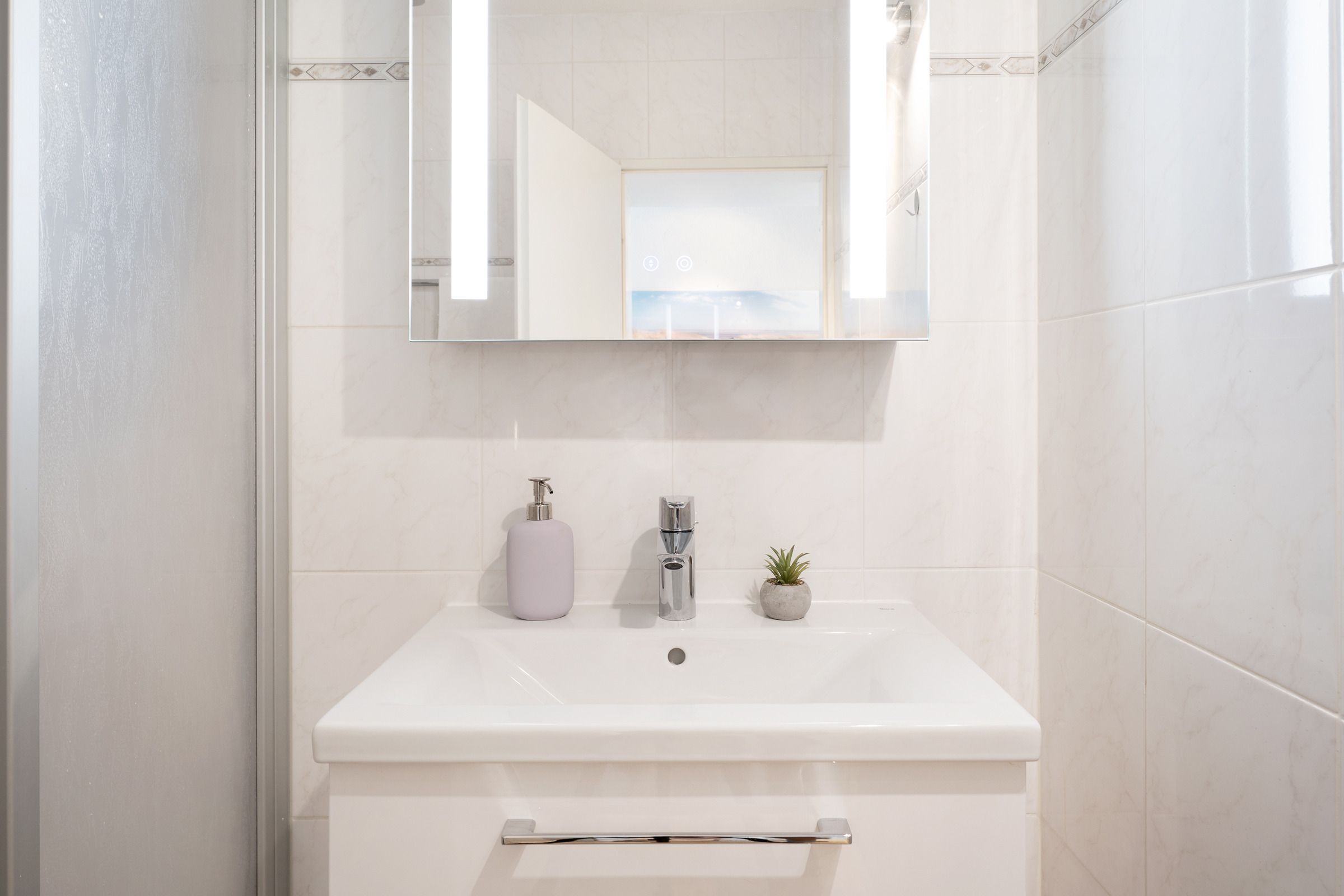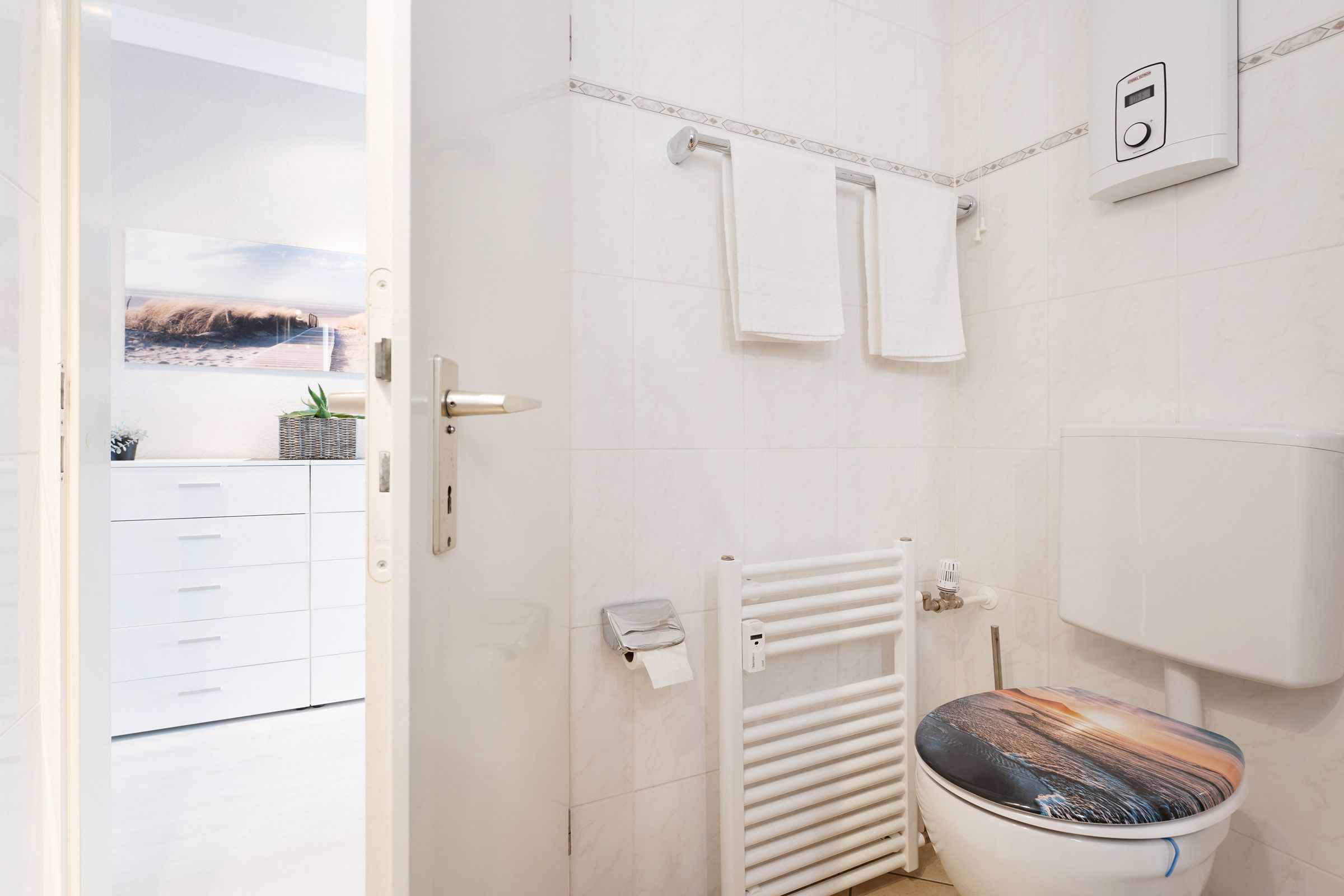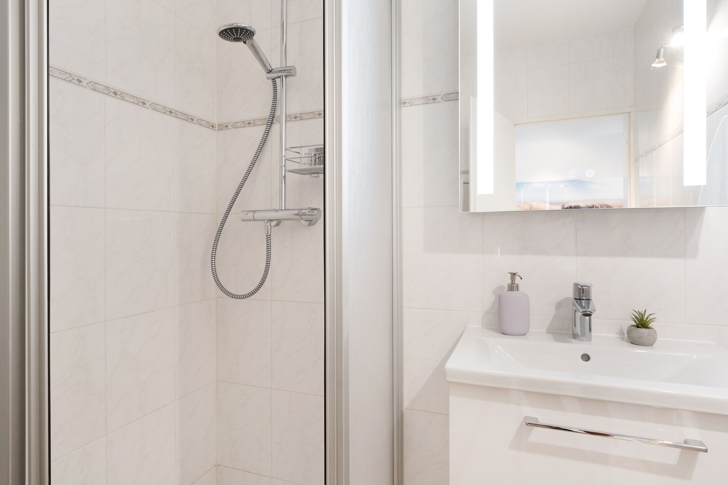 Im separaten Schlafzimmer erwartet Sie ein komfortables Doppelbett, während im Wohnbereich ein Schlafsofa für einen weiteren Gast bereitsteht. Das Bad ist funktional mit Dusche, WC und Handtuchwärmer ausgestattet.