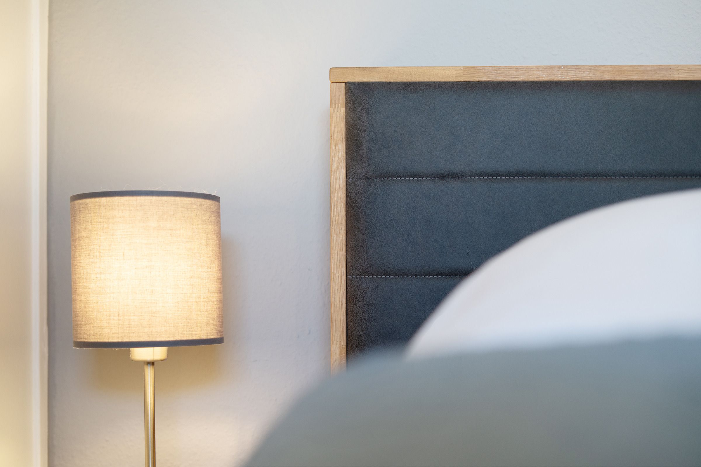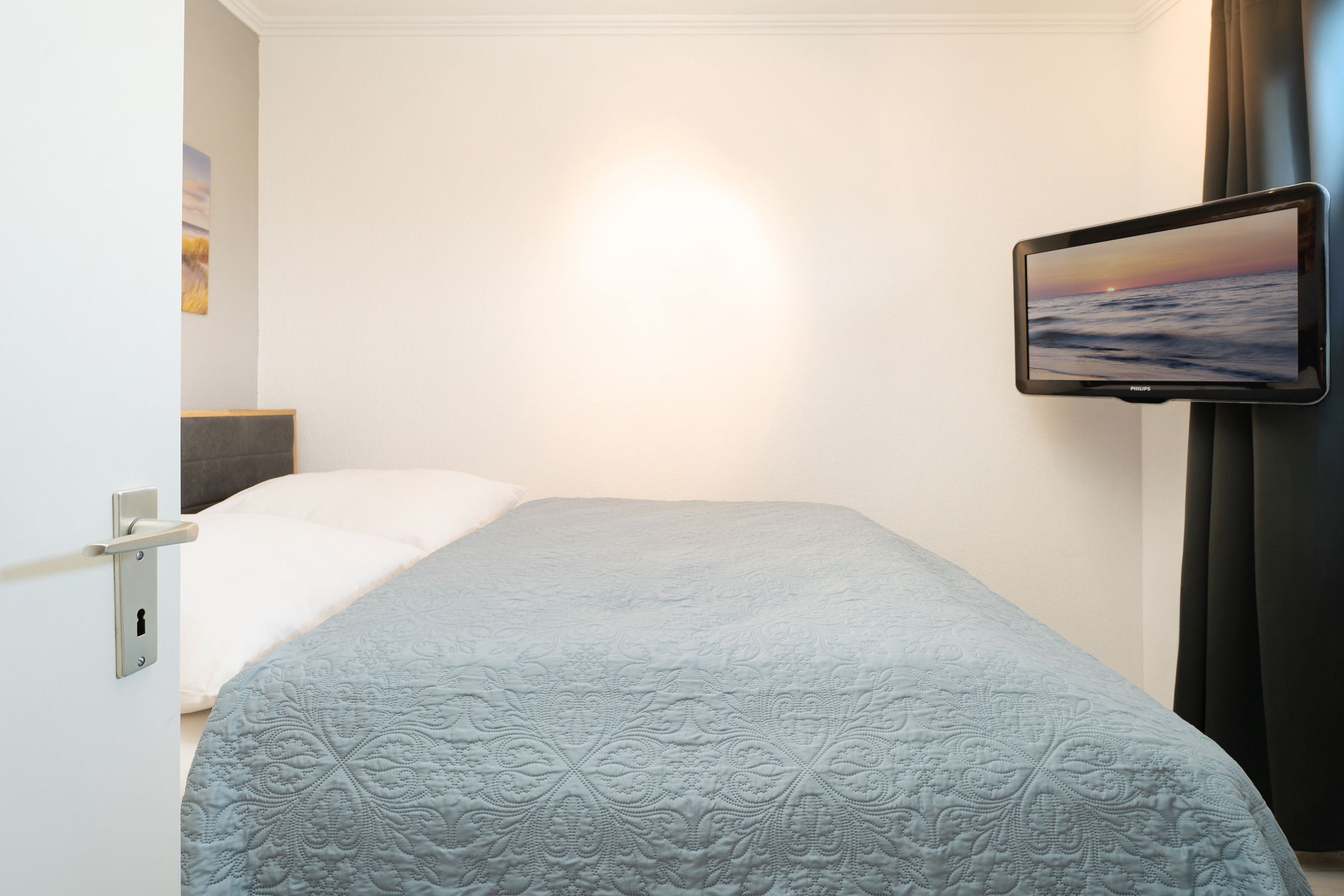 Schlafzimmer: 1 Doppelboxspringbett (2x 80x200 cm, durchgehender Topper), Kleiderschrank, TV, Verdunkelung: Plissee und Vorhang, Platz für ein Babybett