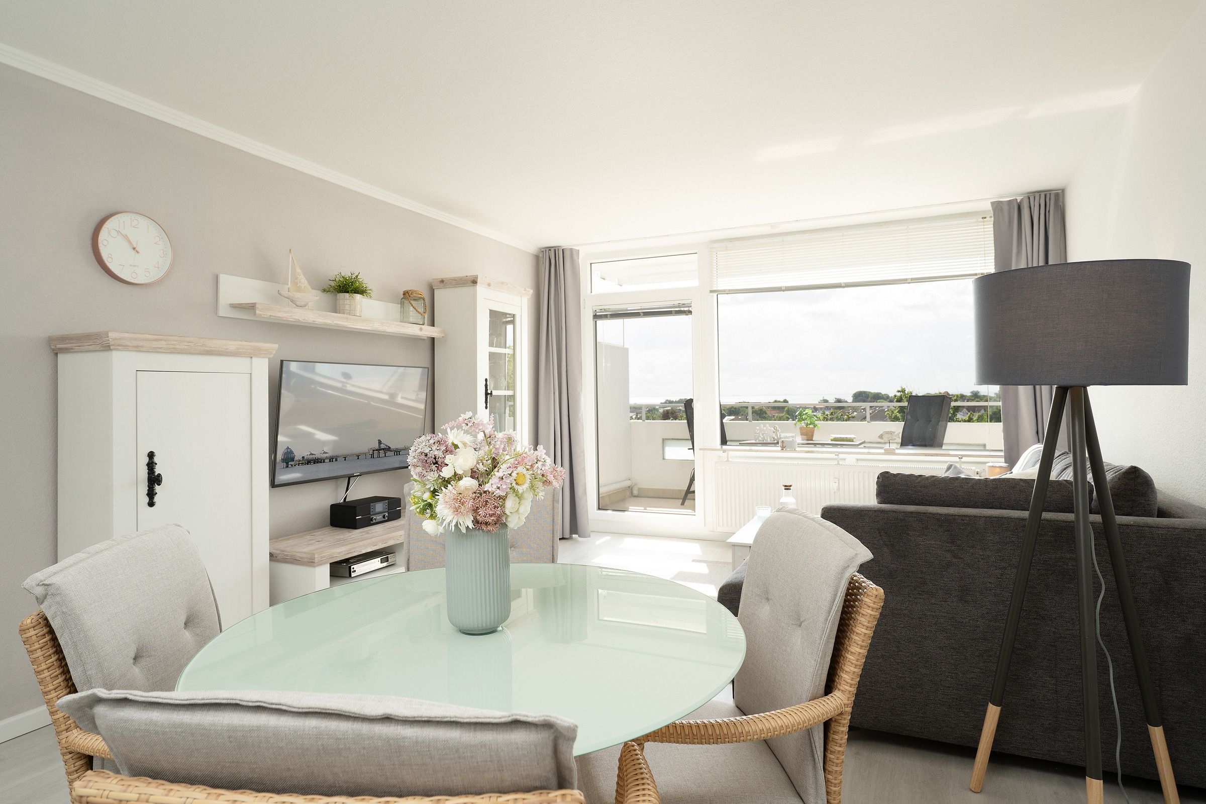 Diese charmante Ferienwohnung im 3. Stock eines gepflegten Hauses begrüßt Sie mit einem hellen Wohnbereich, ausgestattet mit TV, DVD- und CD-Player und gemütlicher Sitzecke – ideal zum Entspannen nach einem erlebnisreichen Strandtag. Vom angrenzenden Balkon mit Gartenmöbeln genießen Sie die frische Ostseeluft und den Blick auf die Ostsee.