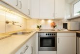 Die separate Küche ist voll ausgestattet und lässt keine Wünsche offen: Neben einem Backofen und Cerankochfeld stehen Ihnen auch eine Mikrowelle, eine Kaffeemaschine, ein Wasserkocher, ein Toaster sowie ein Kühlschrank zur Verfügung. Ein Esstisch lädt zum gemeinsamen Frühstück oder Abendessen ein.