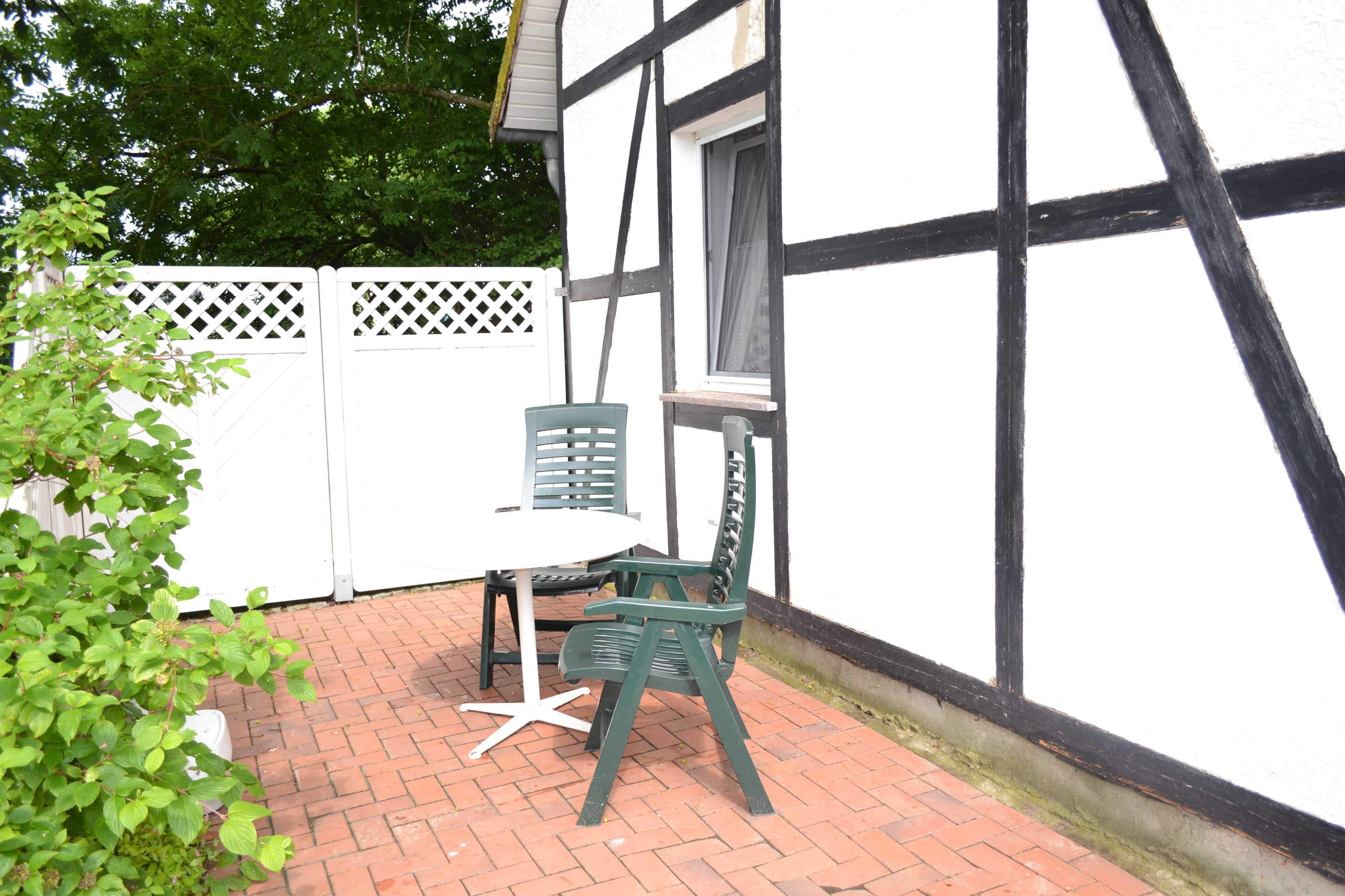 Es verfügt über eine Terrasse mit Gartenmöbel und Grill.