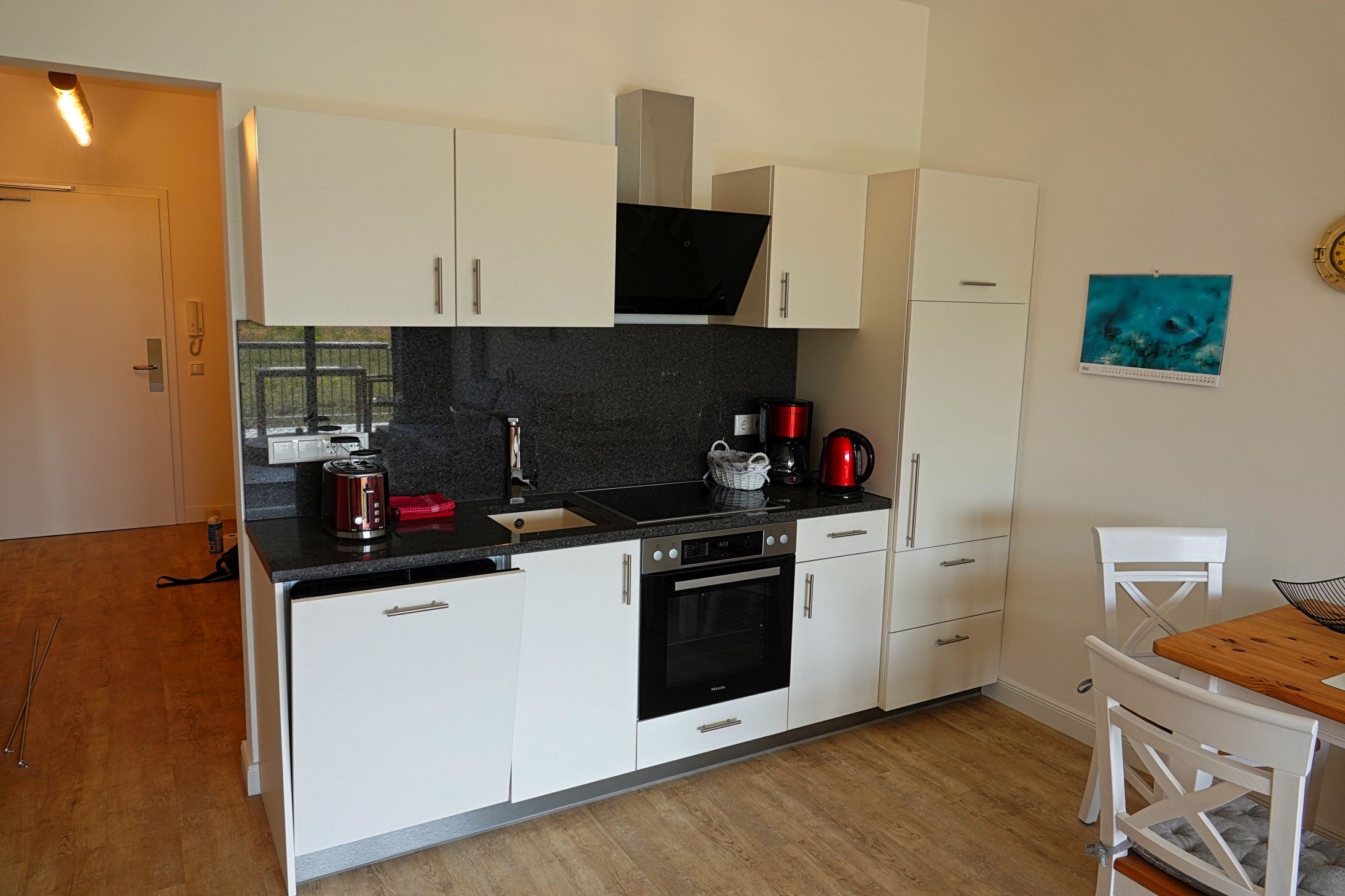 Die Wohnung verfügt über eine moderne und vollständig ausgestattete Einbauküche, die sich im Wohnraum befindet. Die Küchenarbeitsplatte besteht aus Naturstein und es sind reichlich Geschirr, Gläser und Töpfe vorhanden. Außerdem stehen eine Geschirrspülmaschine, Miele-Herdplatten, ein Miele-Backofen, eine Kaffeemaschine, ein Toaster, ein Wasserkocher und ein Handrührgerät zur Verfügung.