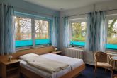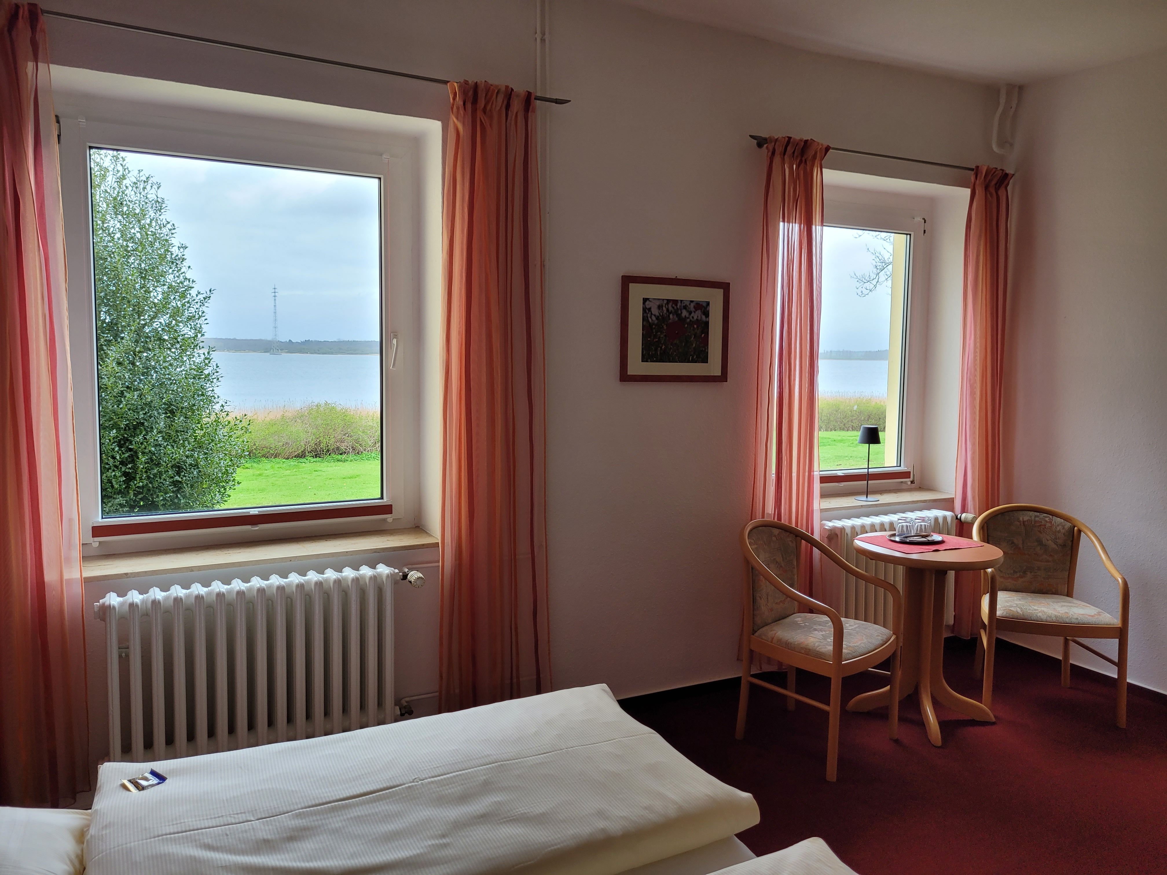 Unsere Doppelzimmer Seeblick liegen ruhig im Erdgeschoss und bieten einen wunderschönen Blick auf den Strelasund.