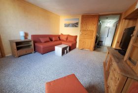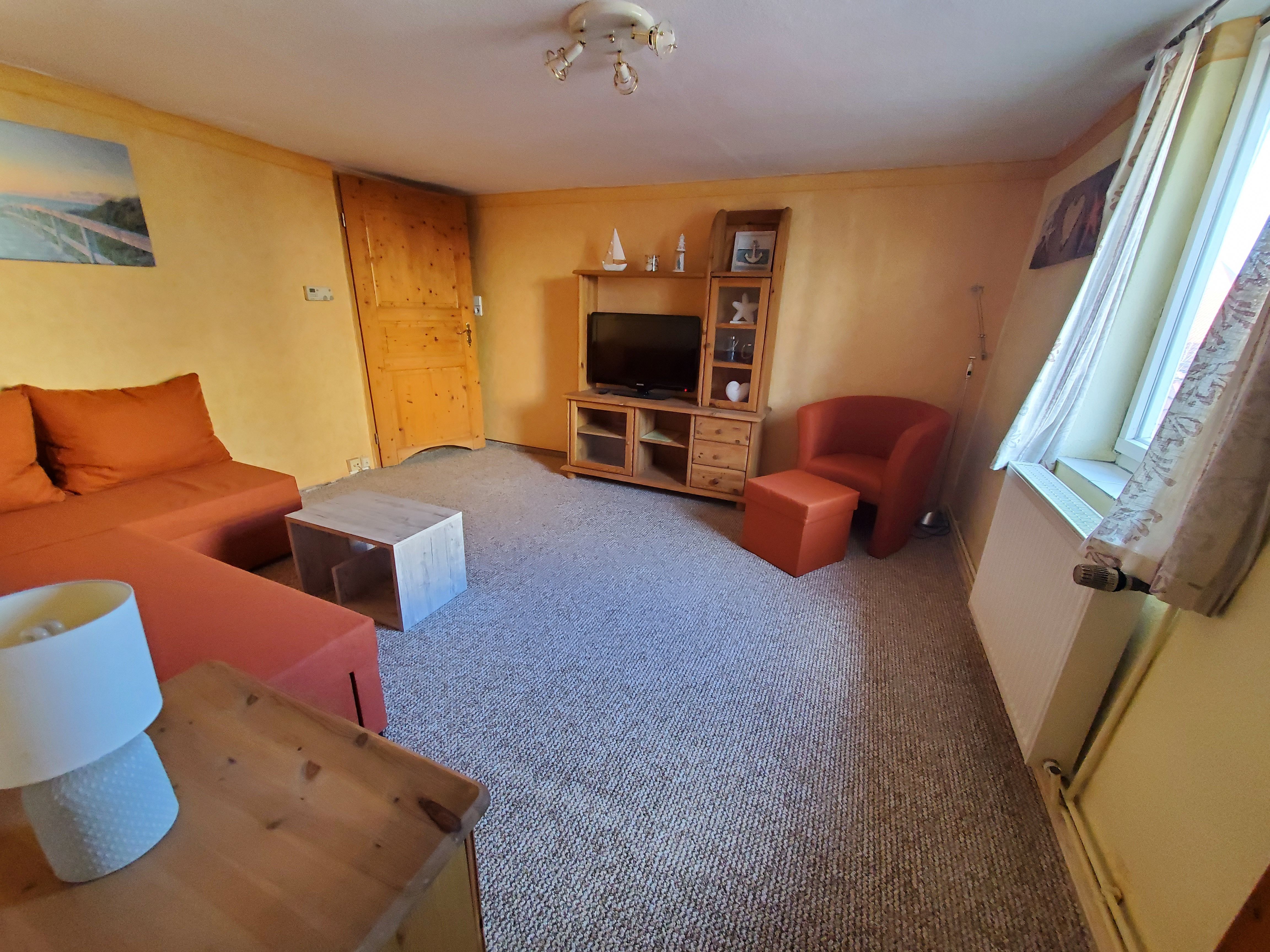 Das Schlafzimmer mit einem Doppelbett (1,60 x 2,00 m), einem Schrank als auch einem Sideboard und einem Sessel ist anheimelnd und gemütlich. Das Wohnzimmer hat eine zusätzliche Schlafcouch (1,30m x 200m) und einen großen HDTV-Fernseher, der Kabelanschluss hat.
