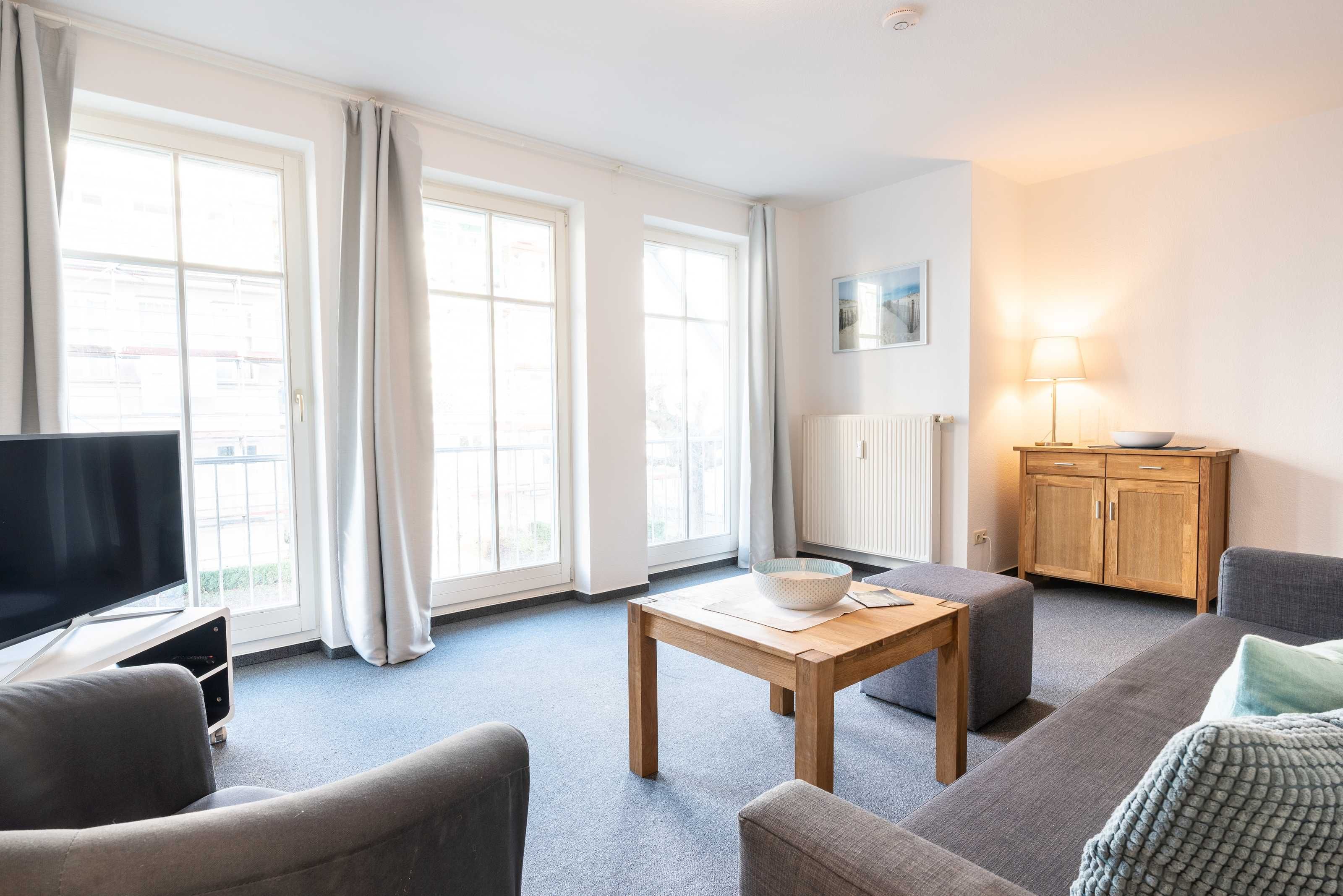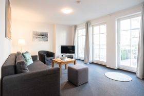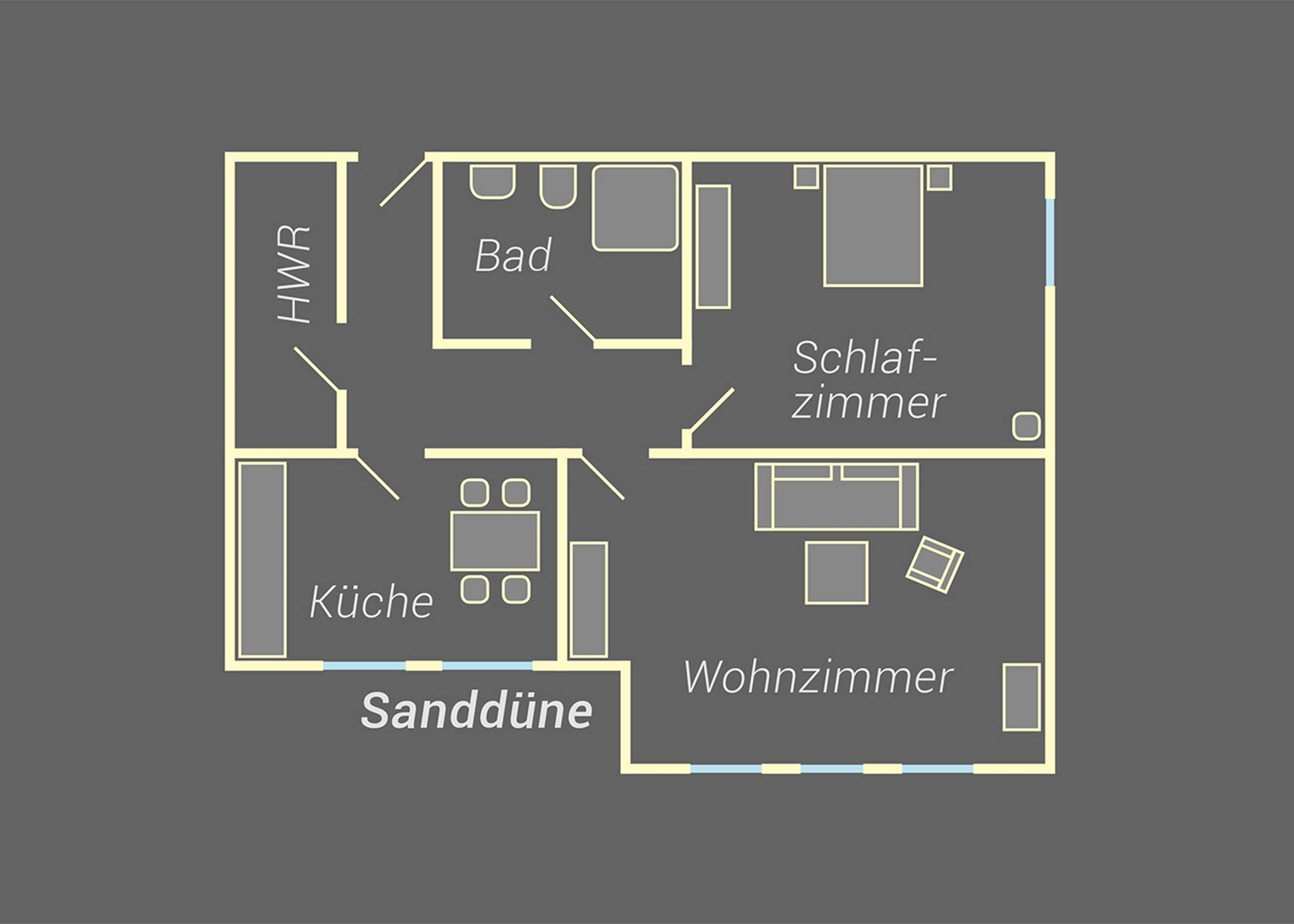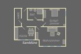 Das ca 58 qm große Appartement Sanddüne verfügt über ein Schlafzimmer mit Doppelbett und großem Kleiderschrank, ein gemütliches Wohnzimmer mit Sofa, bei dem bei Bedarf zwei weitere Gäste Platz finden).