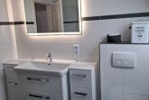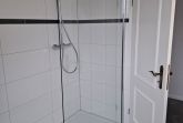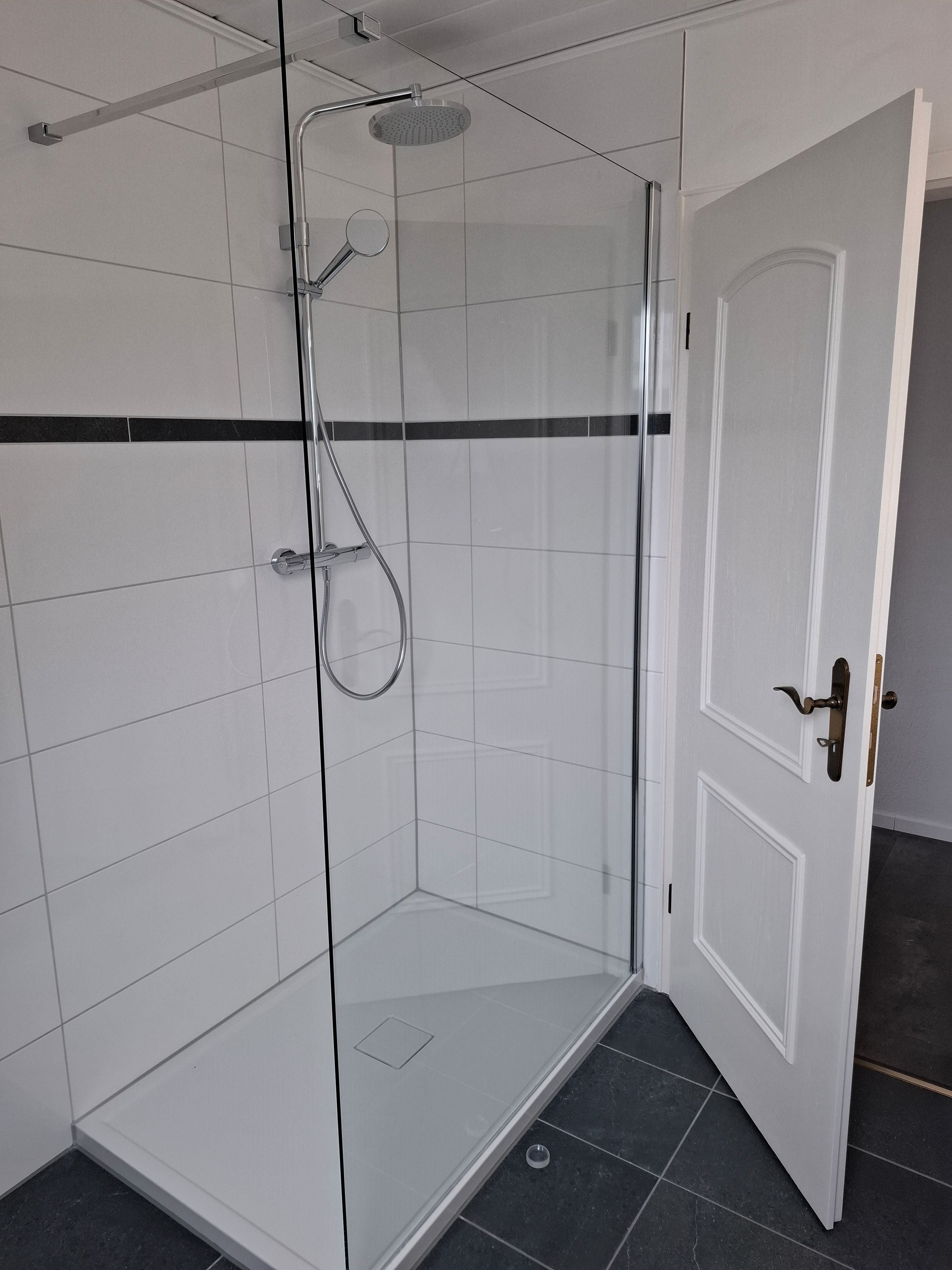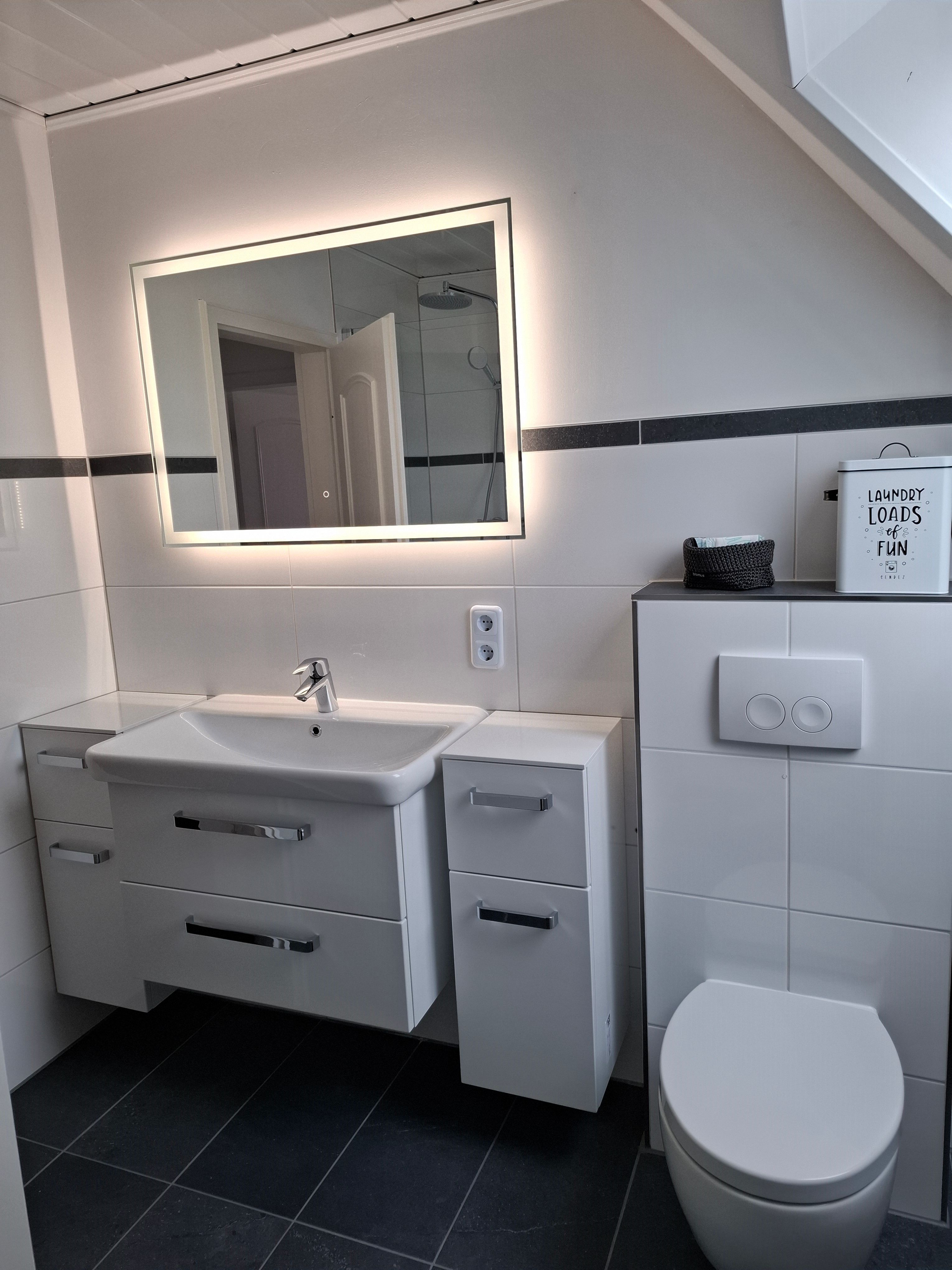 Modernes Duschbad mit bodentiefer Dusche, beleuchtetem Spiegel, Kosmetikspiegel, Fön, Fußbodenheizung und Waschmaschine