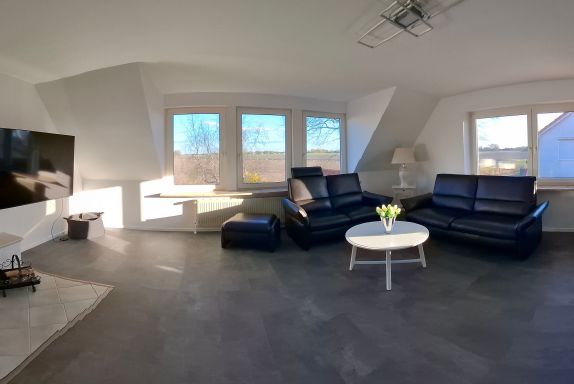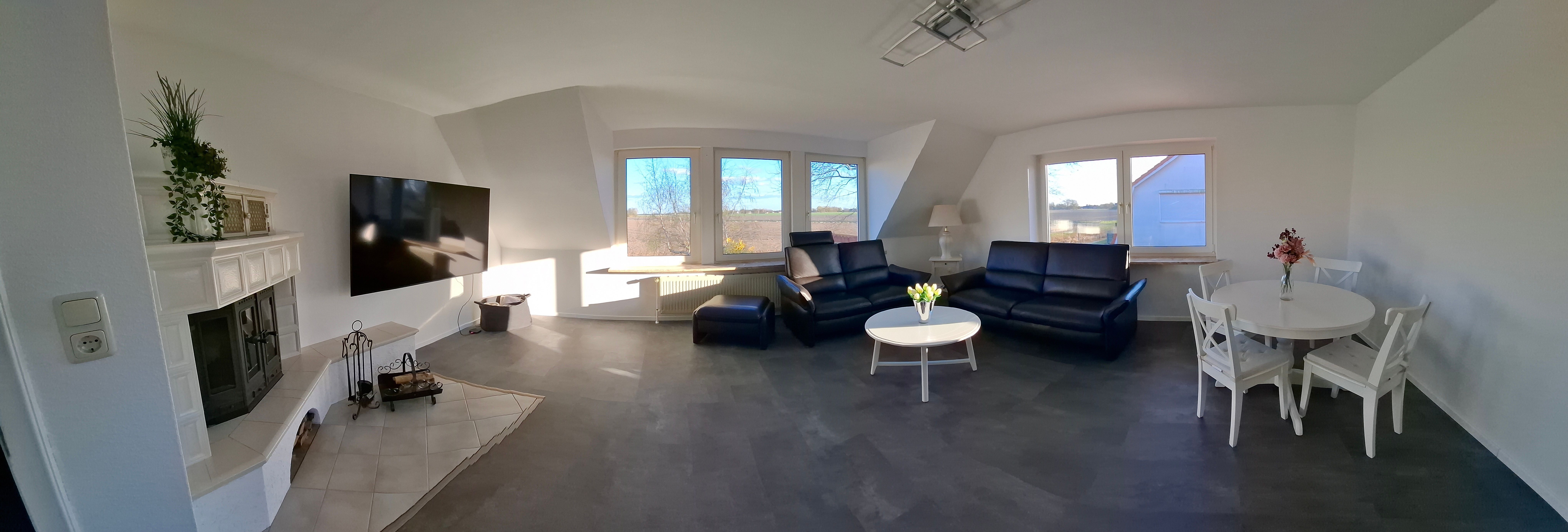 Kleine Auszeit (100 qm, OG) ebenfalls für bis zu 5 Personen, modern eingerichtet und mit gemütlichem Kamin.