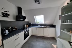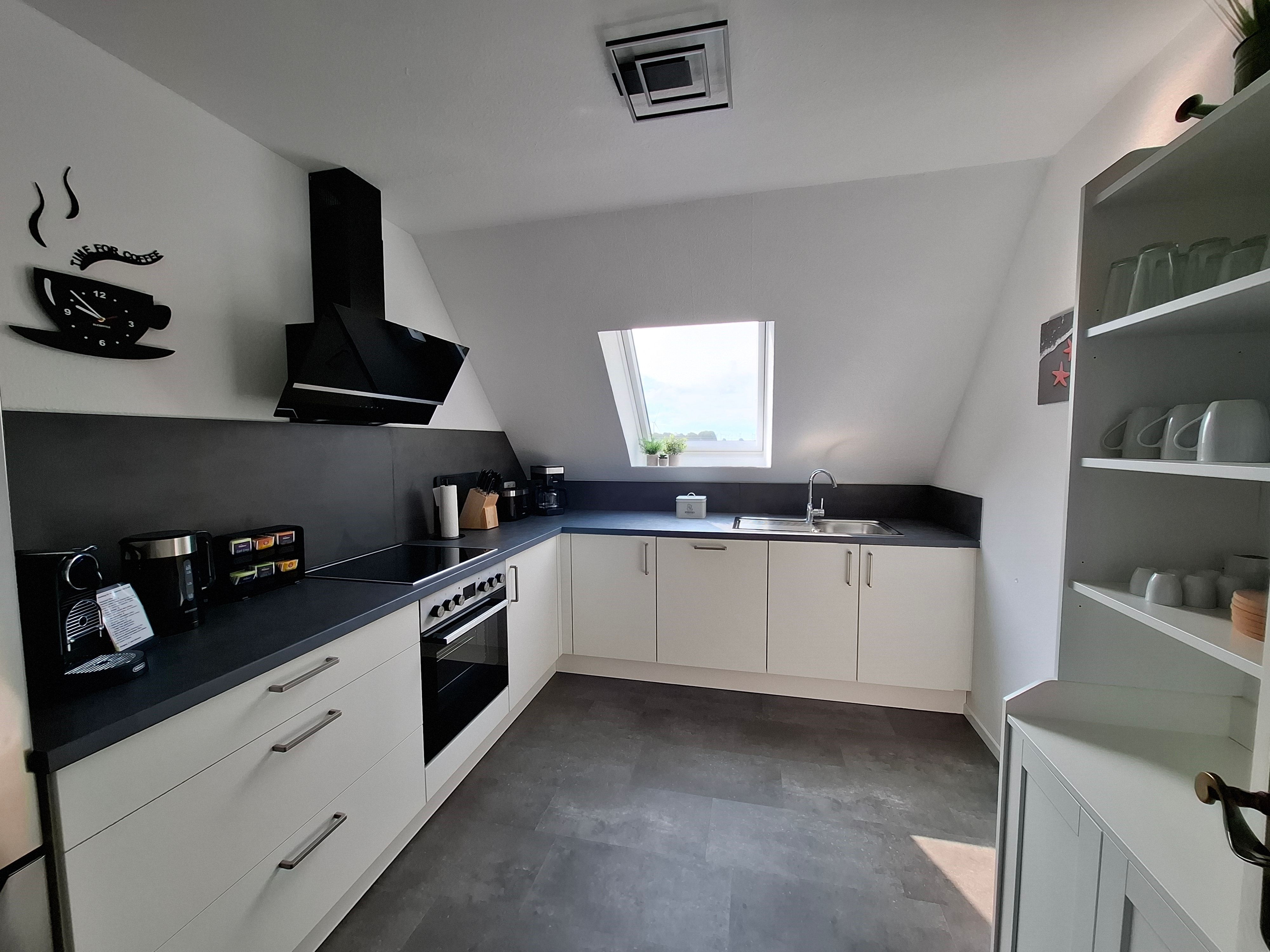 Vollausgestattete Küche mit Herd/Backofen, Geschirrspüler, Kühl-Gefrier-Kombination, Filterkaffeemaschine und Nespresso-Maschine