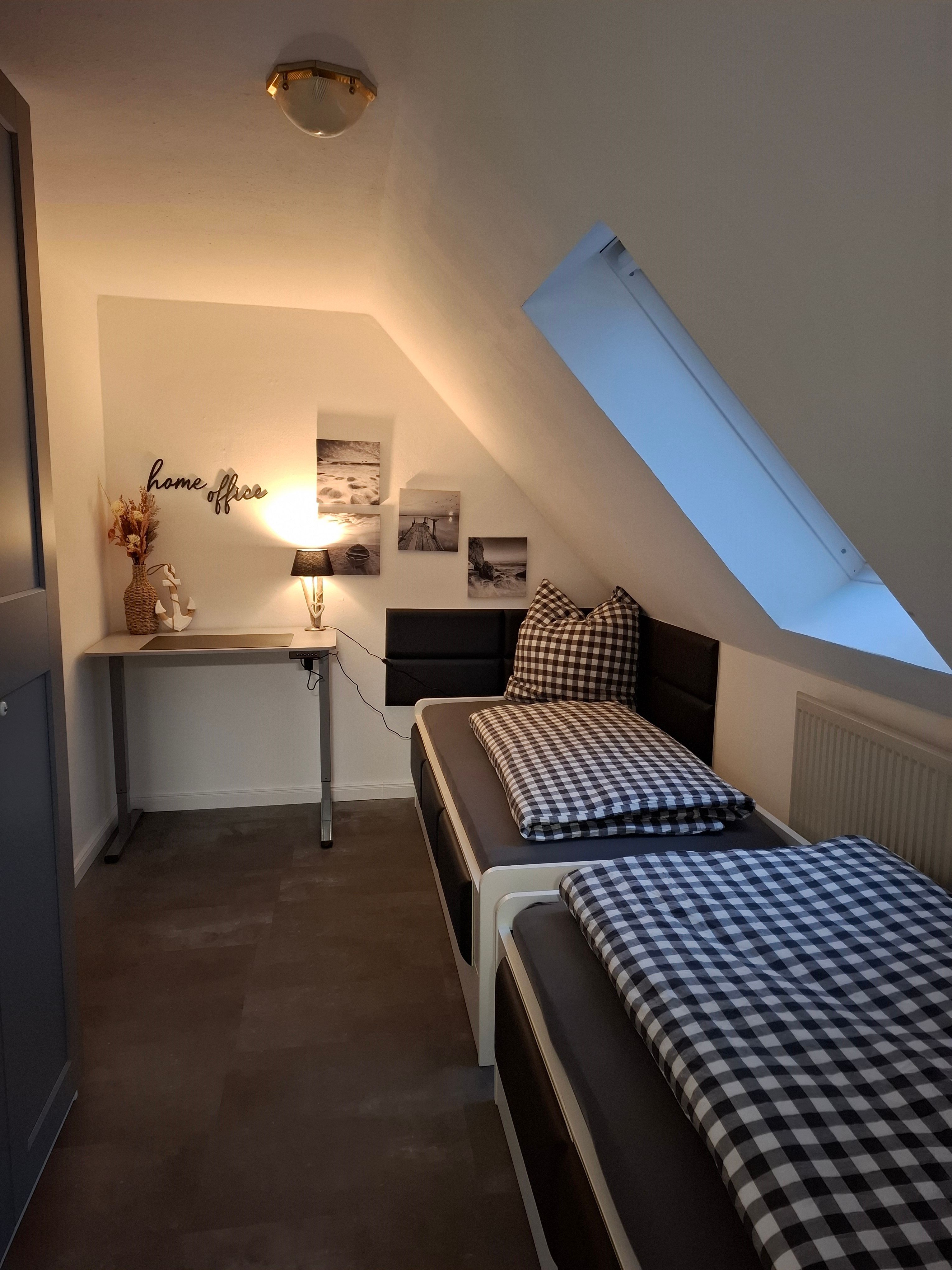 Schlaf-/Arbeitsraum: Zwei Einzelbetten sowie ein Workation-Bereich mit höhenverstellbarem Schreibtisch, ergonomischem Hocker, Bildschirm, Drucker und Lampe