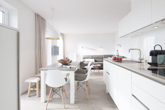 Die Wohnung im 1. Obergeschoss (bequem per Aufzug erreichbar) bietet mit zwei Schlafzimmern Platz für bis zu 4 Personen ideal für Paare, Freunde oder Familien. Die Einrichtung ist modern, hell und lädt vom ersten Moment an zum Wohlfühlen ein. Mittelpunkt der Wohnung ist der gemütliche Wohnbereich mit offener Küche perfekt, um gemeinsam zu kochen, zu essen und zu entspannen.