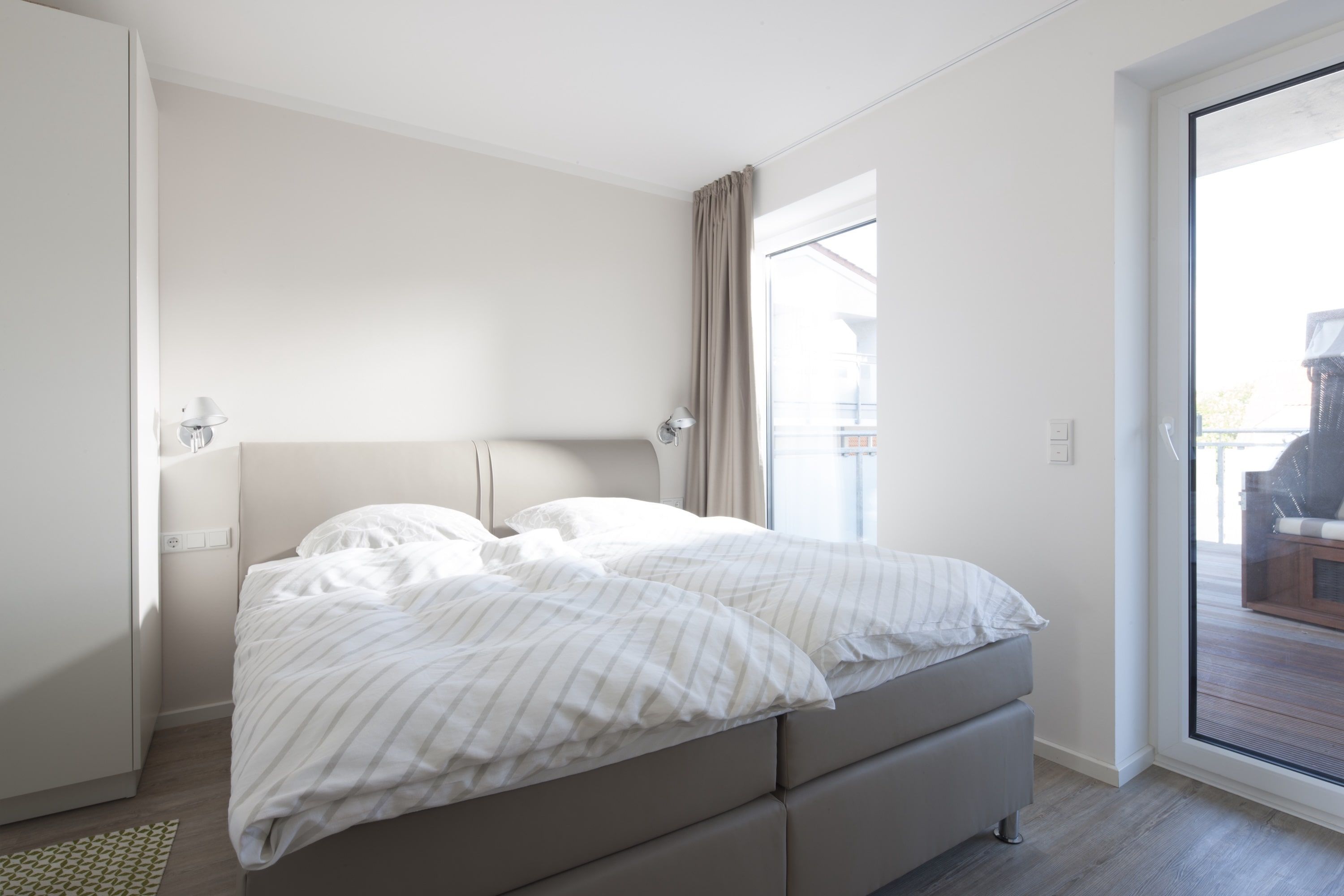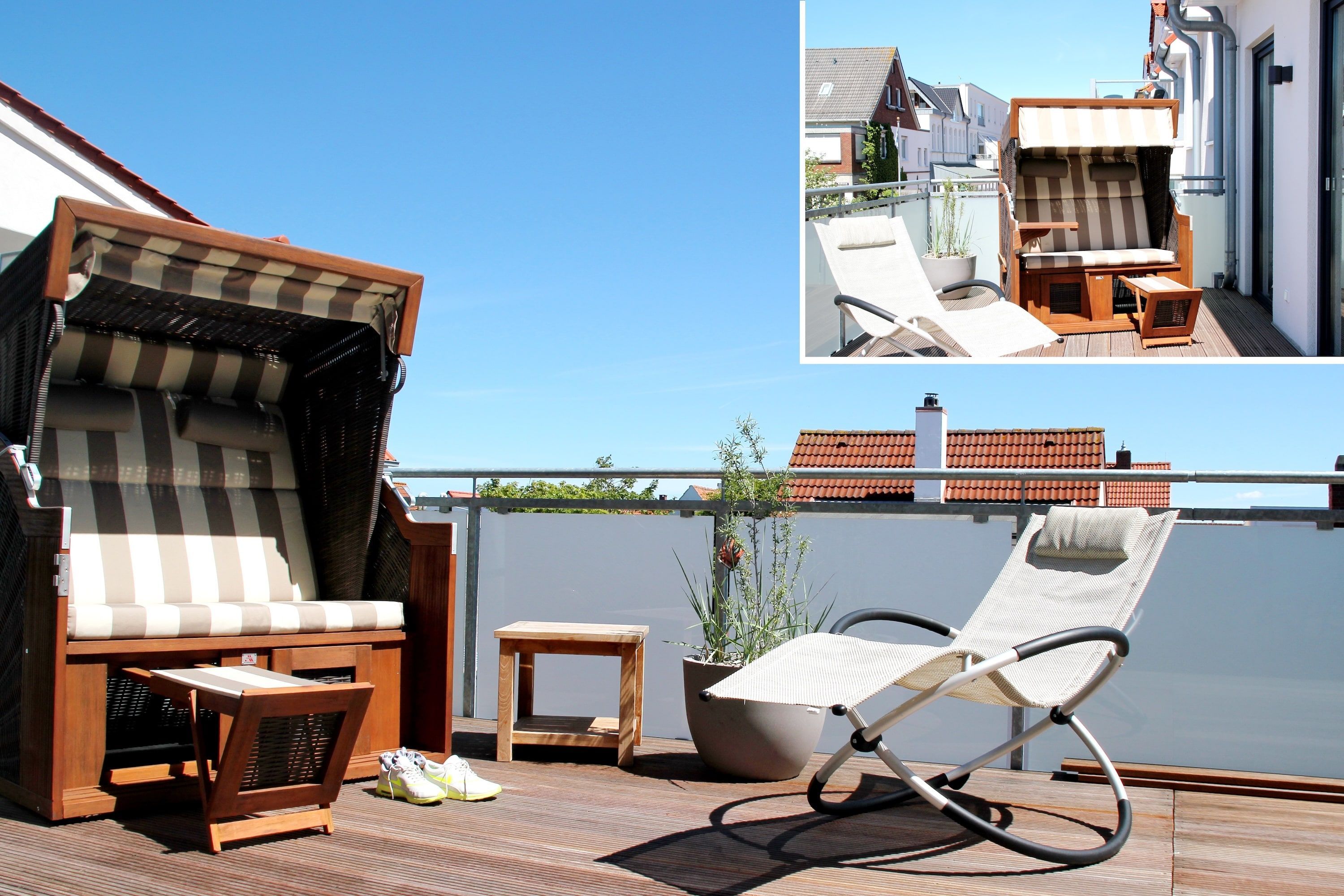 Besonders schön: Zwei große Terrassen eine zur Ost- (24 qm), eine zur Westseite (34 qm) schenken Ihnen Sonnenmomente zu jeder Tageszeit. Machen Sie es sich in den beiden Strandkörben bequem, lassen Sie den Tag mit einem Glas Wein ausklingen oder starten Sie mit einem Frühstück an der frischen Luft.