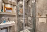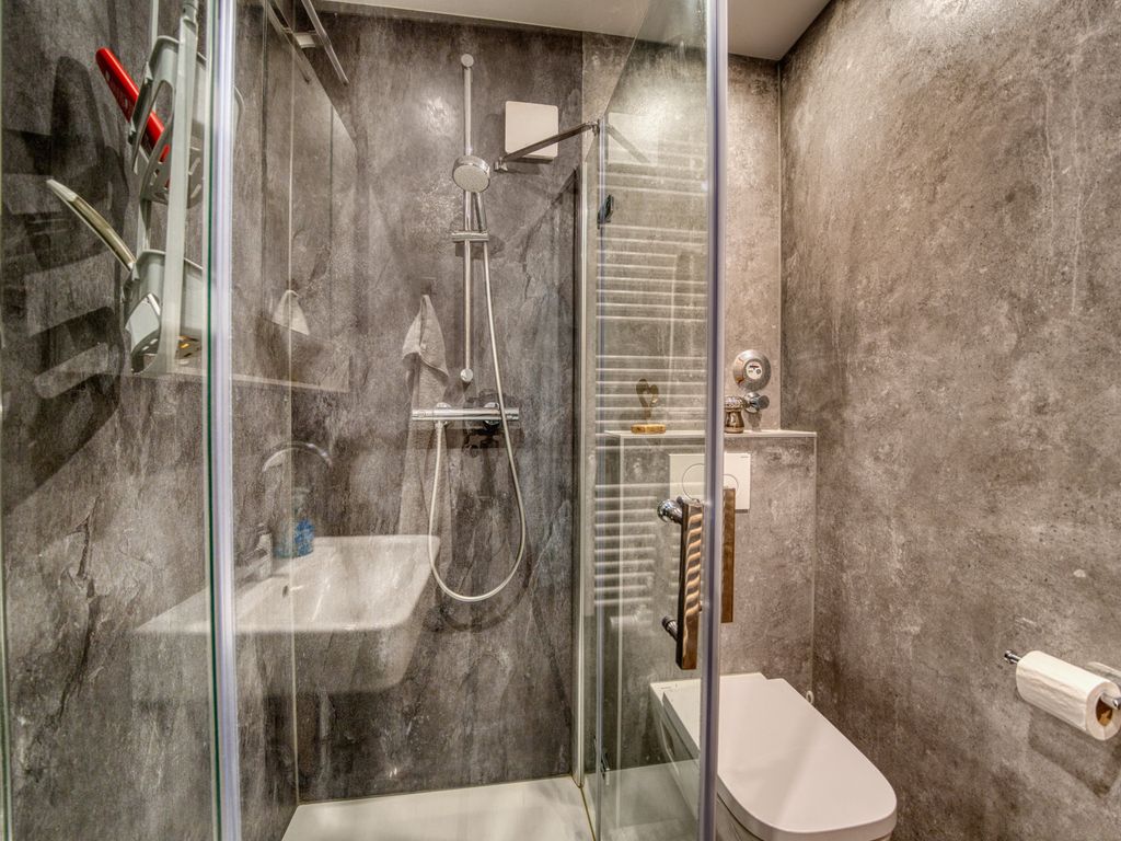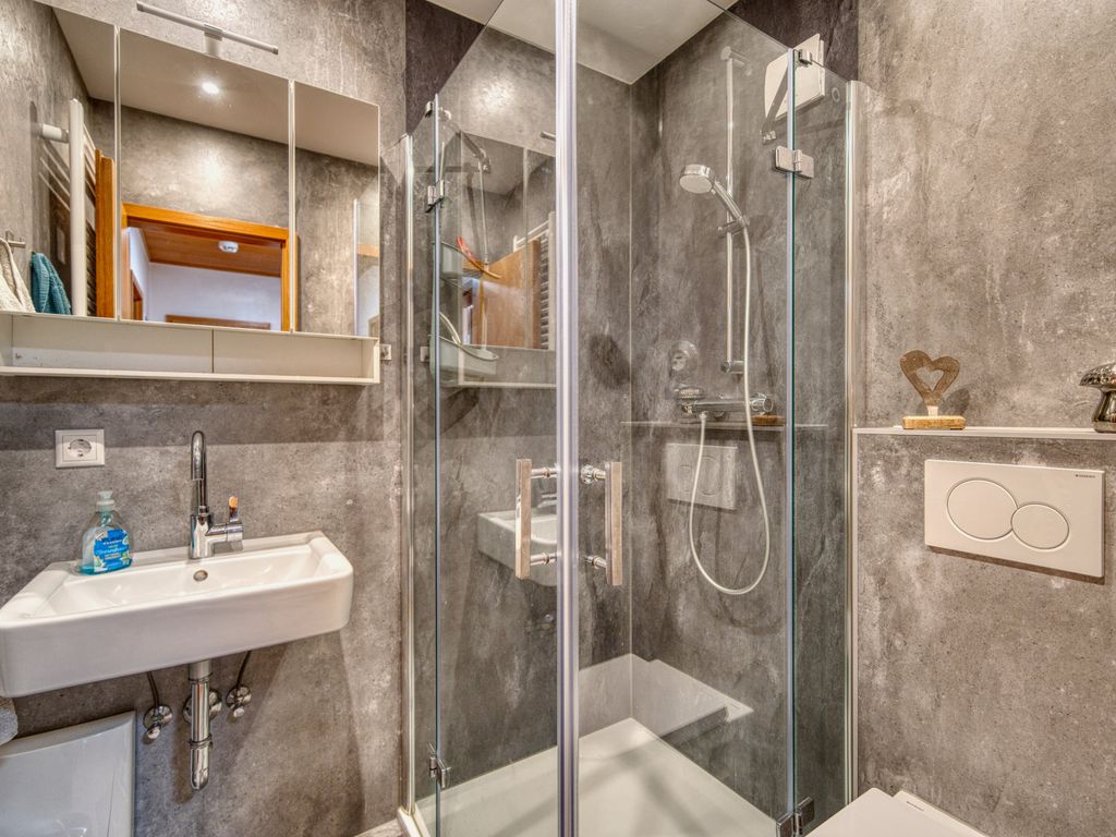 Badezimmer mit Duschkabine, WC und Waschbecken
