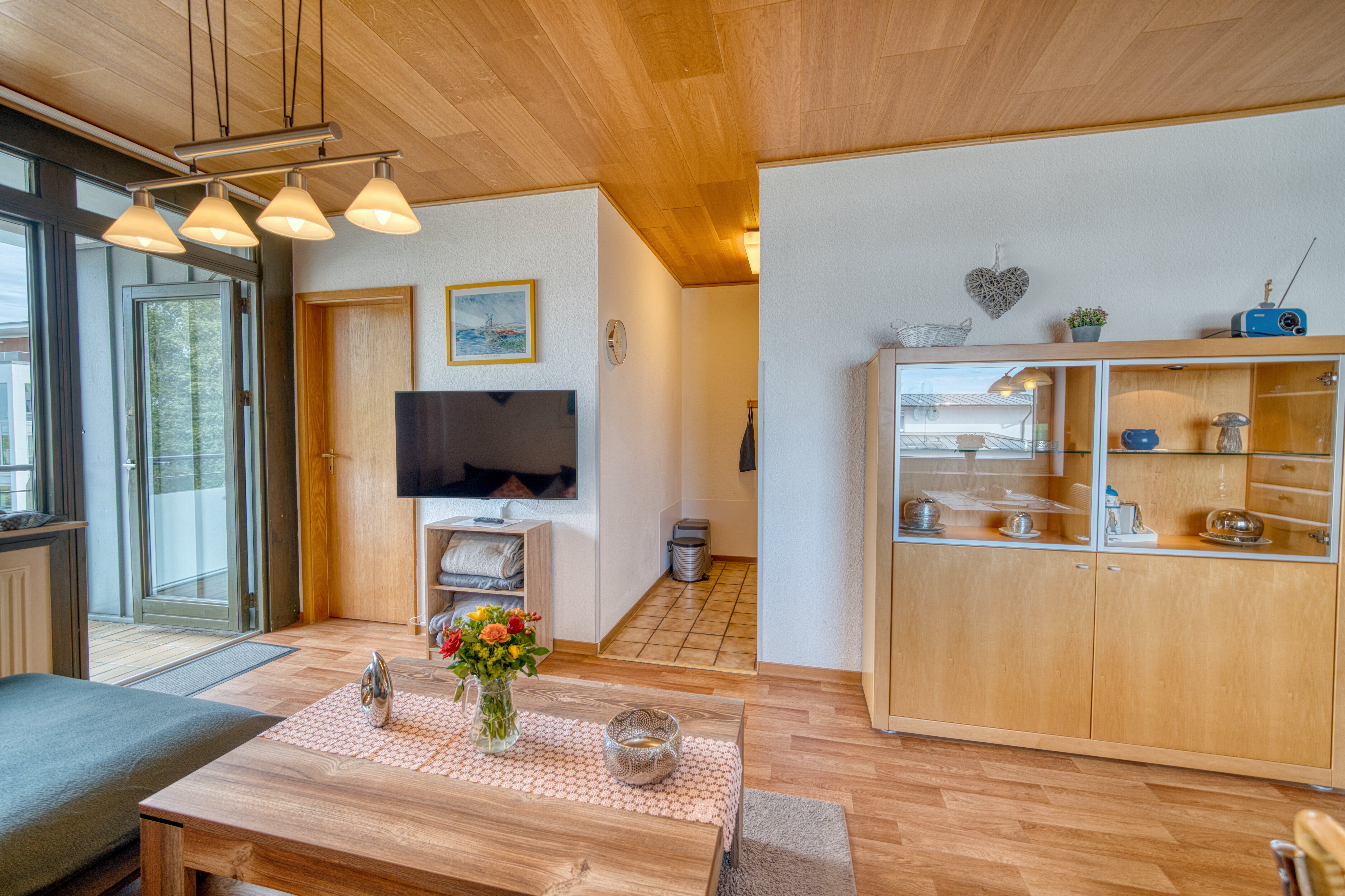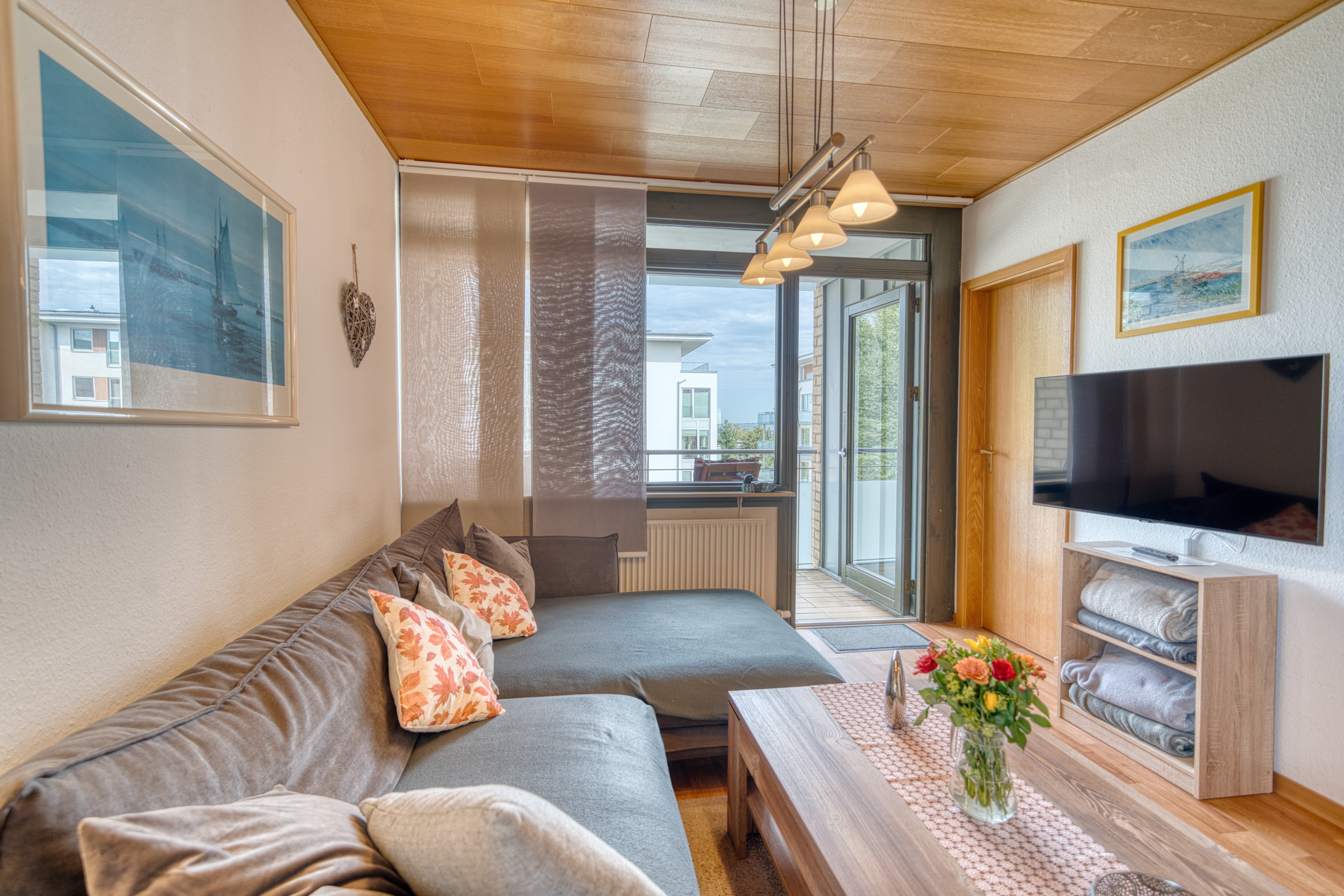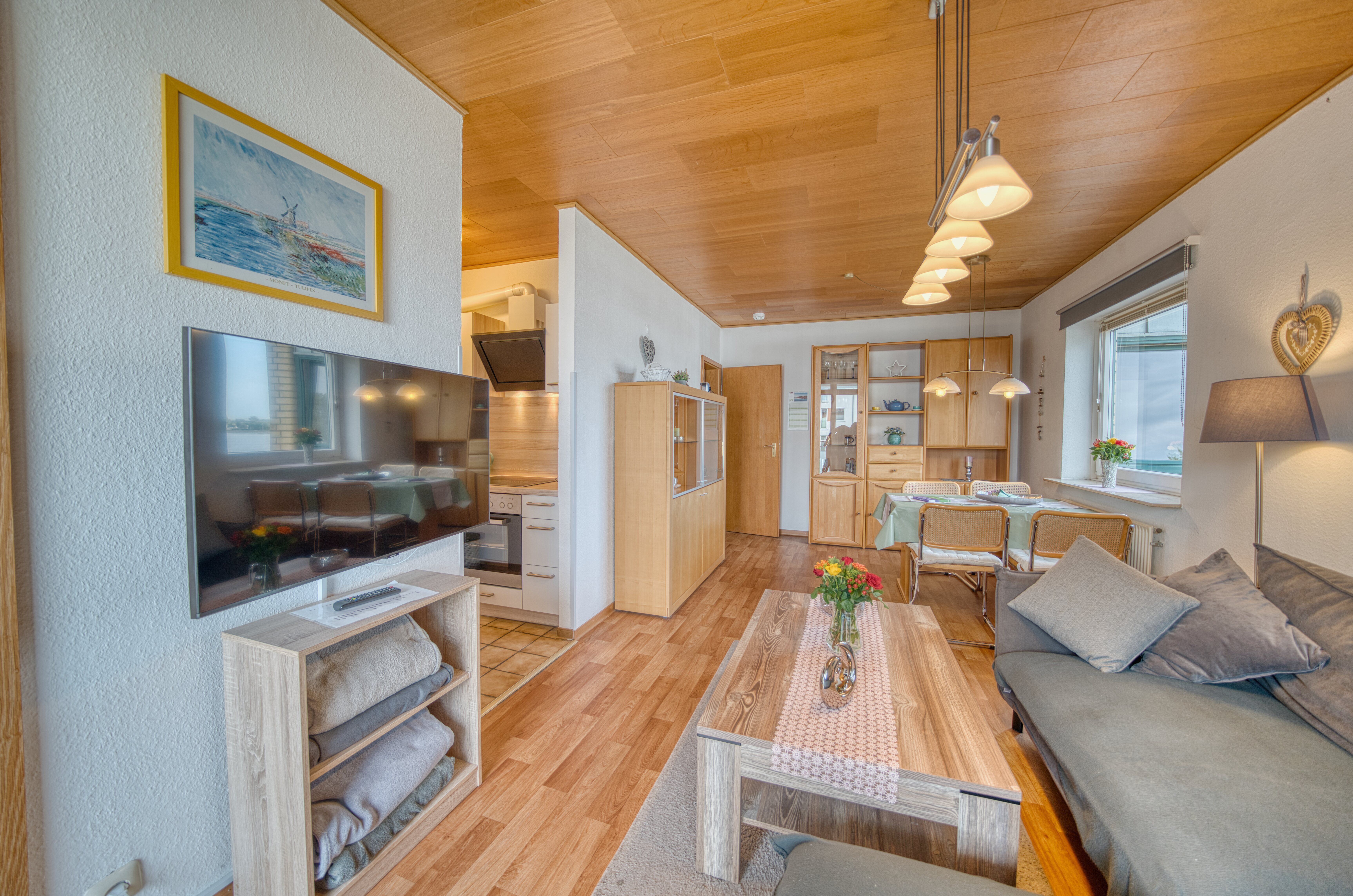 Wohnzimmer mit Binnenseeblick sowie teilweisem Meerblick und gemütlicher Ausstattung