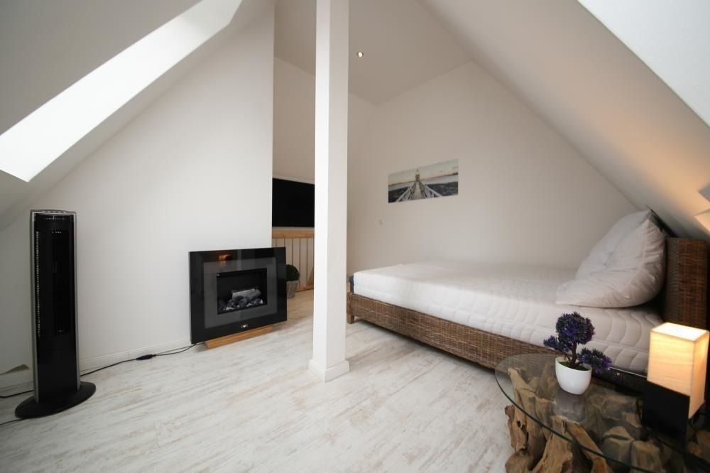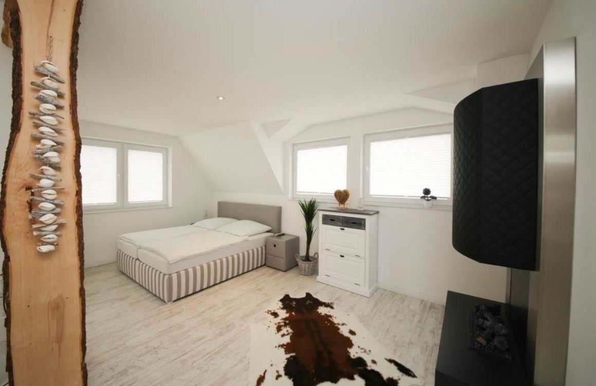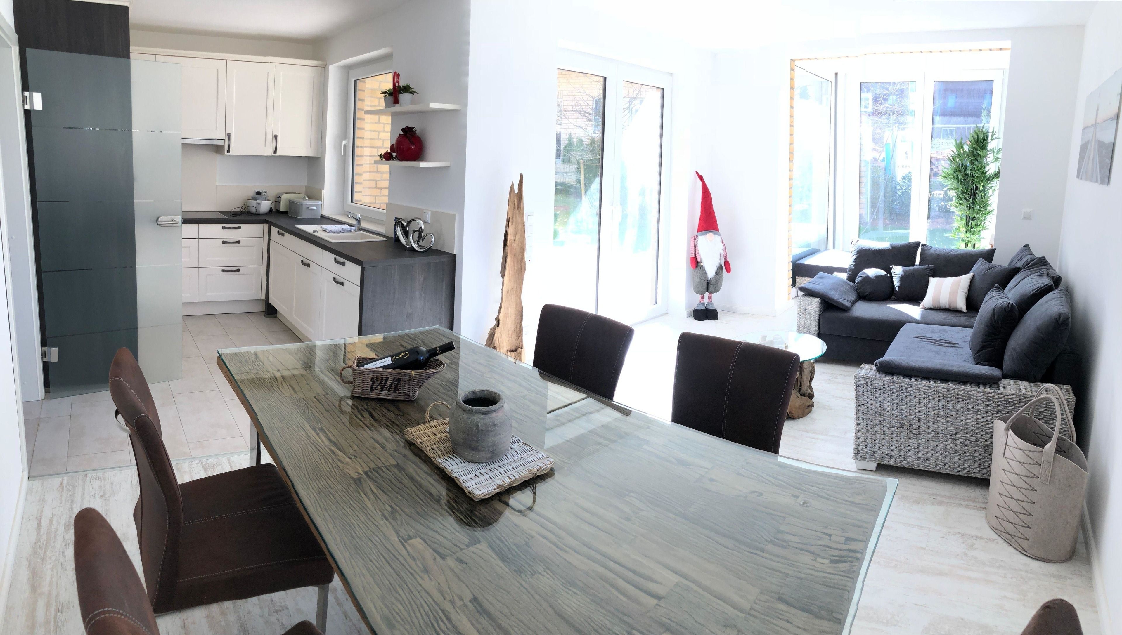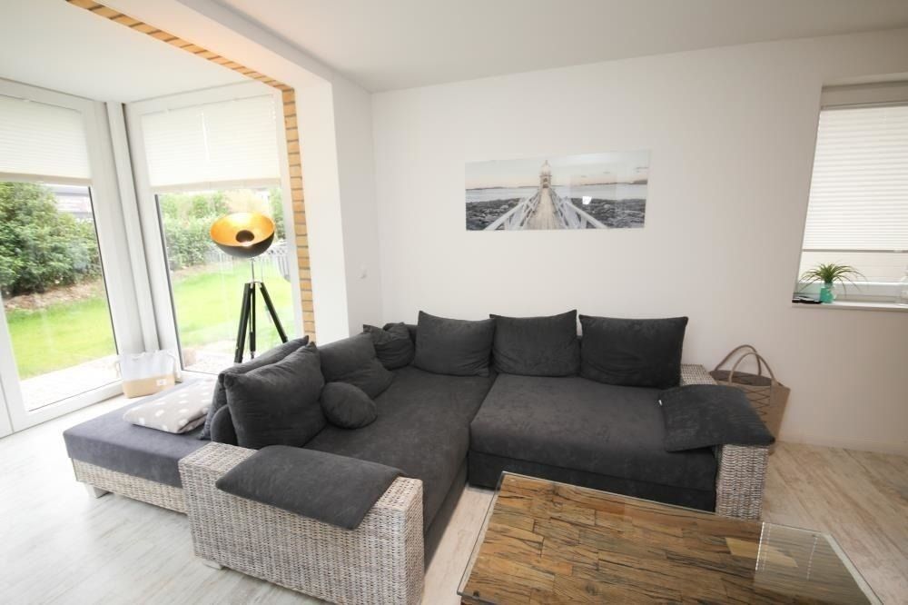 Das stilvolle Haus ist Ende 2019 fertiggestellt und modern, maritim eingerichtet. Große bodentiefe Fenster im Wohn- und Schlafbereich und moderne Bodenbeläge sorgen für eine helle und gemütliche Atmosphäre. Im Wohnzimmer befinden sich eine bequeme Couch und ein hochwertiger Essbereich im maritimen Stil für sechs Personen. An das Wohnzimmer grenzt ein kleiner Wintergarten, der vom sonnigen Garten umgeben ist. Im Erdgeschoss können Sie neben dem Gäste-WC die hauseigene, moderne Sauna im geräumigen Saunaraum erleben. Die offene Marken-Küche ist unter anderem mit Markengeräten von Neff mit Induktionsherd, Kühl-/Gefrierschrank, Backofen, Mikrowelle, Kaffeevollautomat und Geschirrspülmaschine ausgestattet. Im Obergeschoss befinden sich zwei Schlafzimmer jeweils mit Boxspringbetten. Das eine Schlafzimmer ist in L-Form geräumig geschnitten und komfortabel mit Doppelbett, XL-Couchsessel und hochwertigen Elektrokamin ausgestattet. Vom Schlafzimmer aus gelangen Sie zum Südbalkon. Das weitere Schlafzimmer im Obergeschoss ist mit zwei Boxspring-Einzelbetten versehen, die auch als Doppelbett zusammengestellt werden können. Beide Schlafzimmer sind mit Verdunkelungs-Plissee´s für ein angenehmen Schlaf ausgestattet. Das modern geflieste Badezimmer ist als Vollbad mit Dusche, WC und Badewanne ausgestattet. Das Dachgeschoss hat seinen Charm durch die hohe Giebel-Decke und bietet weiteren Schlafraum mit einem Doppelbett. Alle Schlafräume sowie das Wohnzimmer sind mit großen, modernen Flachbild-Fernsehern mit Telekom MagentaTV ausgestattet. Schnelles Glasfasernetz mit WLan und Fußbodenheizung sind im ganzen Haus vorhanden.