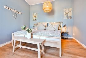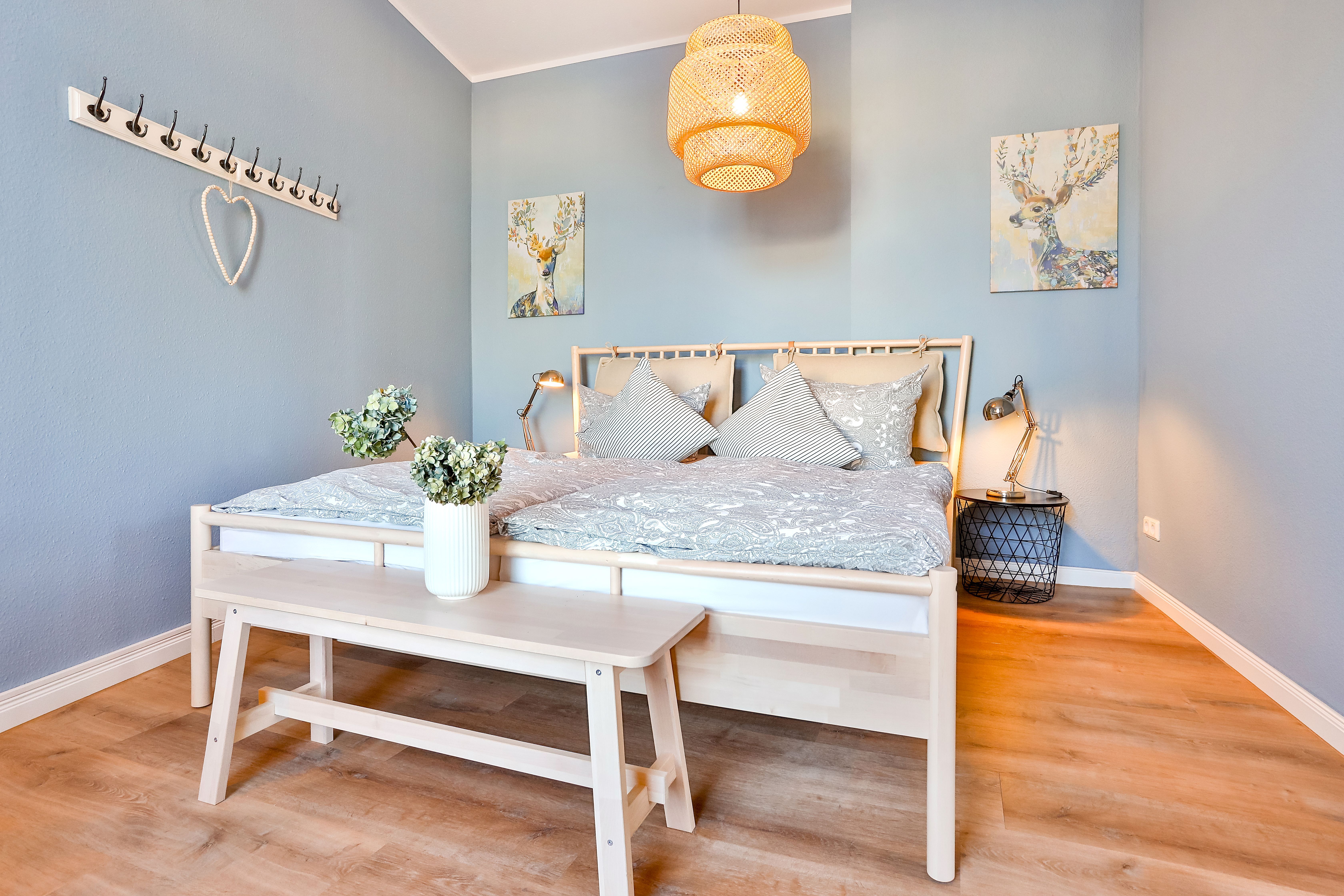 Schlafzimmer: Die Wohnung verfügt über 1 großzügiges Schlafzimmer mit einem hochwertigem Bett (1,80 x 2,00 Meter), Bettwäsche und ausreichend Stauraum.