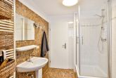 Badezimmer: Ein elegantes Badezimmer mit Dusche, Handtüchern und Föhn, das Entspannung nach einem Tag in der Stadt bietet.