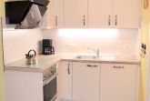 Vom Flur gelangt man weiter in die offene Durchgangs-Einbauküche mit Herd und Backofen, Geschirrspülmaschine, Kühlschrank mit Gefrierteil, Wasserkocher, Kaffeemaschine, Toaster... (und vieles mehr). Ausreichend Geschirr, Besteck und Gläser sind vorhanden.