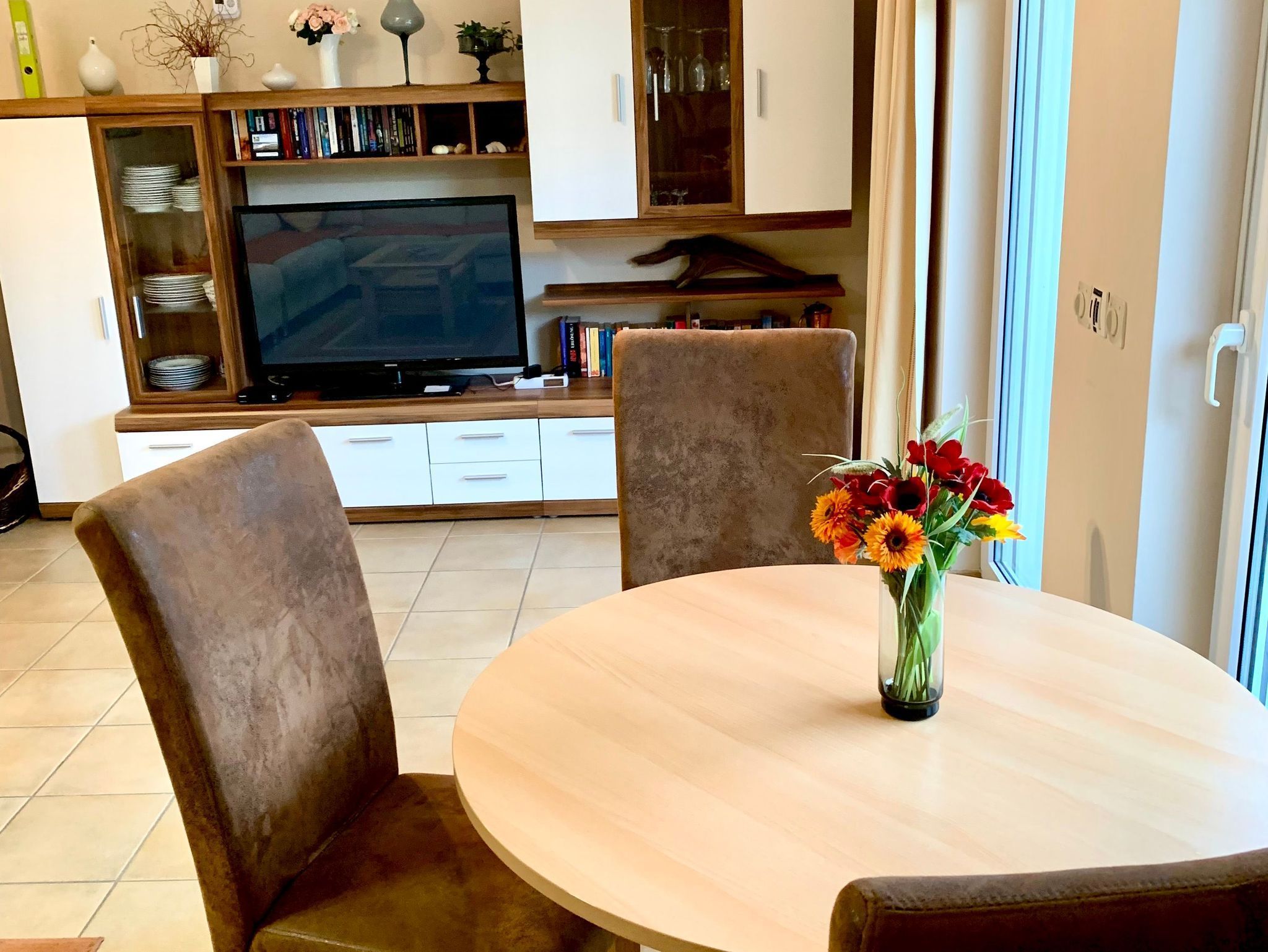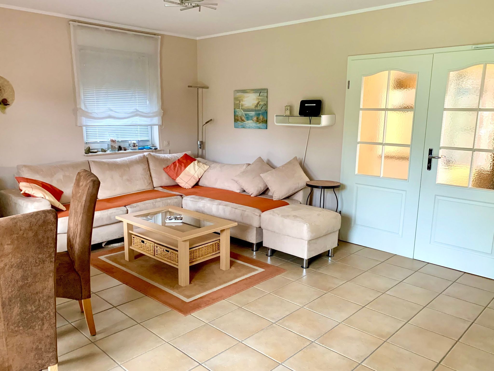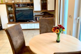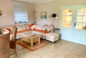 Das Wohnzimmer ist ca. 24 qm groß. Hier befindet sich ein großer Flachbild Fernseher mit Sat-TV und Radio. Neben einem großen Couchbereich mit großer gemütlicher Sitzecke und einem Couchtisch gibt es einen separaten Esstisch.