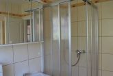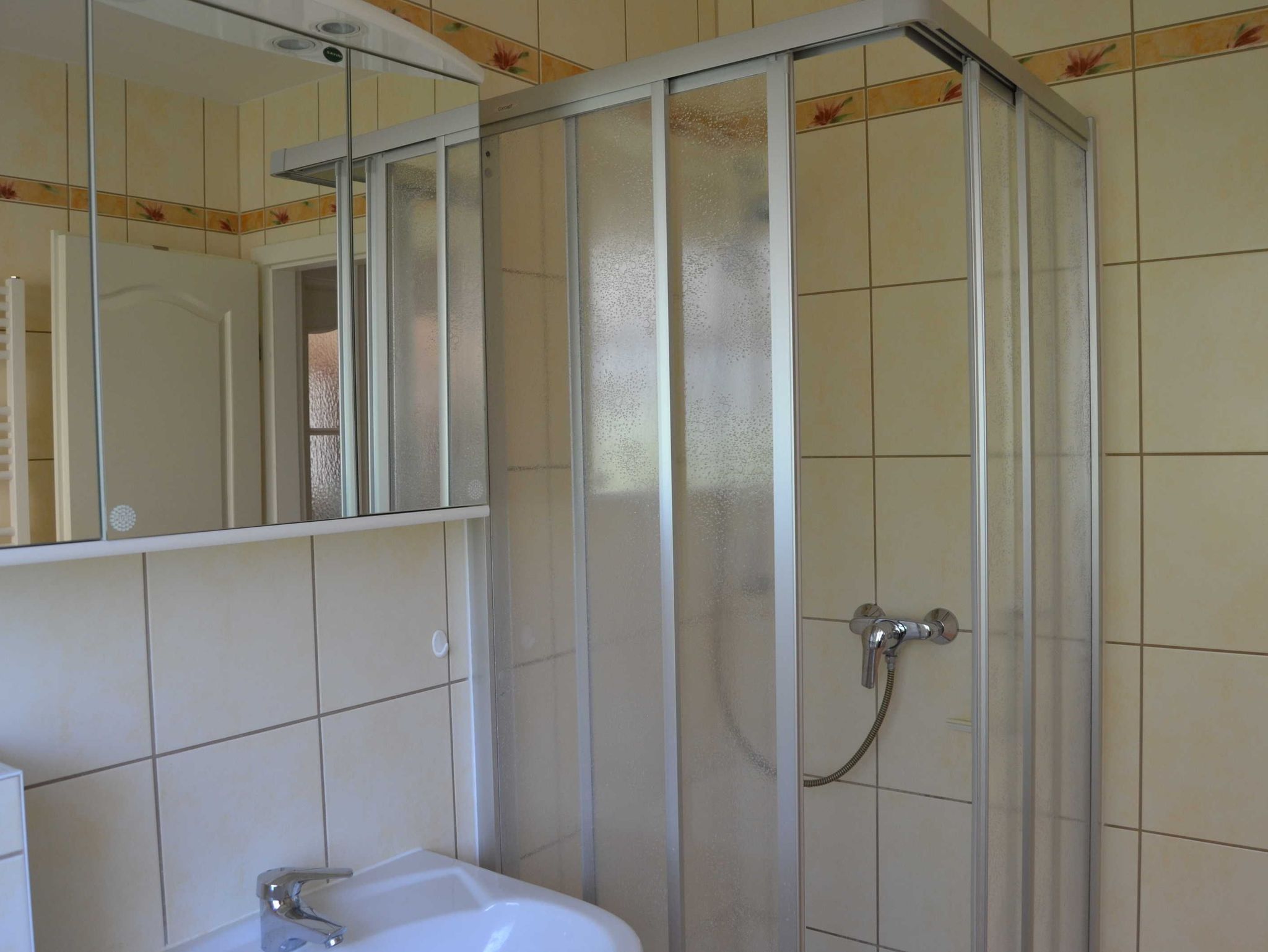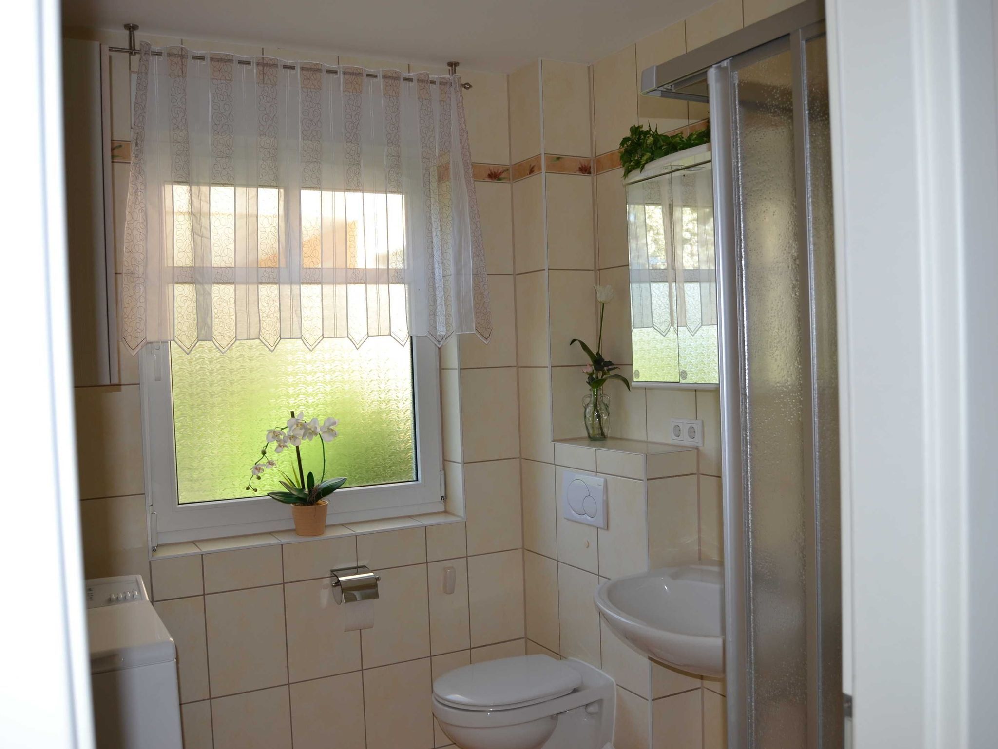 Das Badezimmer ist mit einer Dusche und einer Waschmaschine ausgestattet.